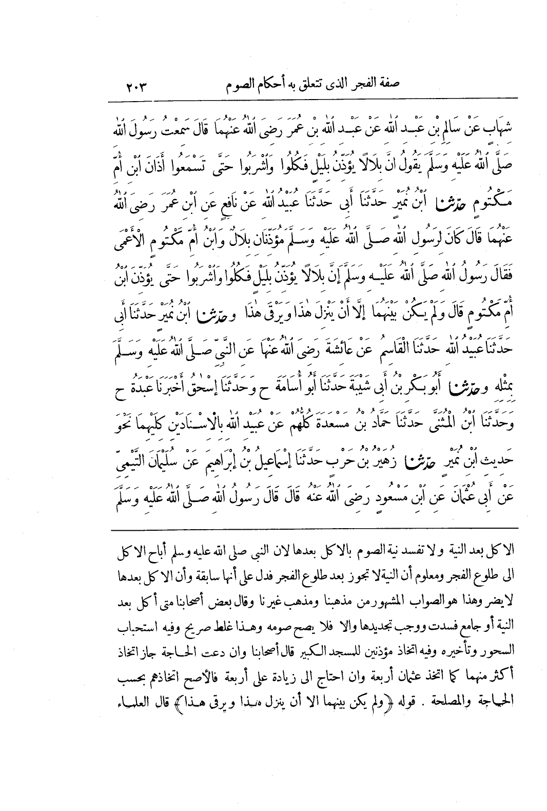 الْأَكْلِ بَعْدَ النِّيَّةِ وَلَا تَفْسُدُ نِيَّةُ الصَّوْمِ بِالْأَكْلِ بَعْدَهَا لِأَنَّ النَّبِيَّ صَلَّى اللَّهُ عَلَيْهِ وَسَلَّمَ أَبَاحَ الْأَكْلَ إِلَى طُلُوعِ الْفَجْرِ وَمَعْلُومٌ أَنَّ النِّيَّةَ لَا تَجُوزُ بَعْدَ طُلُوعِ الْفَجْرِ فَدَلَّ عَلَى أَنَّهَا سَابِقَةٌ وَأَنَّ الْأَكْلَ بَعْدَهَا لَا يَضُرُّ وَهَذَا هُوَ الصَّوَابُ الْمَشْهُورُ مِنْ مَذْهَبِنَا وَمَذْهَبِ غَيْرِنَا وَقَالَ بَعْضُ أَصْحَابِنَا مَتَى أَكَلَ بَعْدَ النِّيَّةِ أَوْ جَامَعَ فَسَدَتْ وَوَجَبَ تَجْدِيدُهَا وَإِلَّا فَلَا يَصِحُّ صَوْمُهُ وَهَذَا غَلَطٌ صَرِيحٌ وَفِيهِ اسْتِحْبَابُ السُّحُورِ وَتَأْخِيرِهِ وَفِيهِ اتِّخَاذُ مُؤَذِّنَيْنِ لِلْمَسْجِدِ الْكَبِيرِ قَالَ أَصْحَابُنَا وَإِنْ دَعَتِ الْحَاجَةُ جَازَ اتِّخَاذُ أَكْثَرِ مِنْهُمَا كَمَا اتَّخَذَ عُثْمَانُ أَرْبَعَةً وَإِنِ احْتَاجَ إِلَى زِيَادَةٍ عَلَى أَرْبَعَةٍ فَالْأَصَحُّ اتِّخَاذُهُمْ بِحَسَبِ الْحَاجَةِ وَالْمَصْلَحَةِ قَوْلُهُ (وَلَمْ يَكُنْ بَيْنَهُمَا إِلَّا أَنْ يَنْزِلَ هَذَا وَيَرْقَى هَذَا) قَالَ الْعُلَمَاءُ