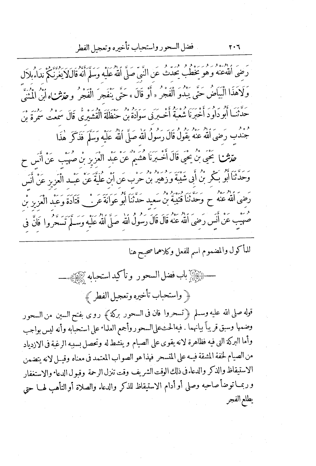 [1095] قَوْلُهُ صَلَّى اللَّهُ عَلَيْهِ وَسَلَّمَ (تَسَحَّرُوا فَإِنَّ فِي السَّحُورِ بَرَكَةً) رُوِيَ بِفَتْحِ السِّينِ مِنَ السَّحُورِ وَضَمِّهَا وَسَبَقَ قَرِيبًا بَيَانُهُمَا فِيهِ الْحَثُّ عَلَى السَّحُورِ وَأَجْمَعَ الْعُلَمَاءُ عَلَى اسْتِحْبَابِهِ وَأَنَّهُ لَيْسَ بِوَاجِبٍ وَأَمَّا الْبَرَكَةُ الَّتِي فِيهِ فَظَاهِرَةٌ لِأَنَّهُ يُقَوِّي عَلَى الصِّيَامِ وَيُنَشِّطُ لَهُ وَتَحْصُلُ بِسَبَبِهِ الرَّغْبَةُ فِي الِازْدِيَادِ مِنَ الصِّيَامِ لِخِفَّةِ الْمَشَقَّةِ فِيهِ عَلَى الْمُتَسَحِّرِ فَهَذَا هُوَ الصَّوَابُ الْمُعْتَمَدُ فِي مَعْنَاهُ وَقِيلَ لِأَنَّهُ يَتَضَمَّنُ الِاسْتِيقَاظَ وَالذِّكْرَ وَالدُّعَاءَ فِي ذَلِكَ الْوَقْتِ الشَّرِيفِ وَقْتِ تَنْزُّلِ الرَّحْمَةِ وَقَبُولِ الدُّعَاءِ وَالِاسْتِغْفَارِ وَرُبَّمَا تَوَضَّأَ صَاحِبُهُ وَصَلَّى أَوْ أَدَامُ الِاسْتِيقَاظَ لِلذِّكْرِ وَالدُّعَاءِ وَالصَّلَاةِ أَوَ التَّأَهُّبِ لَهَا حَتَّى يَطْلُعَ الْفَجْرُ