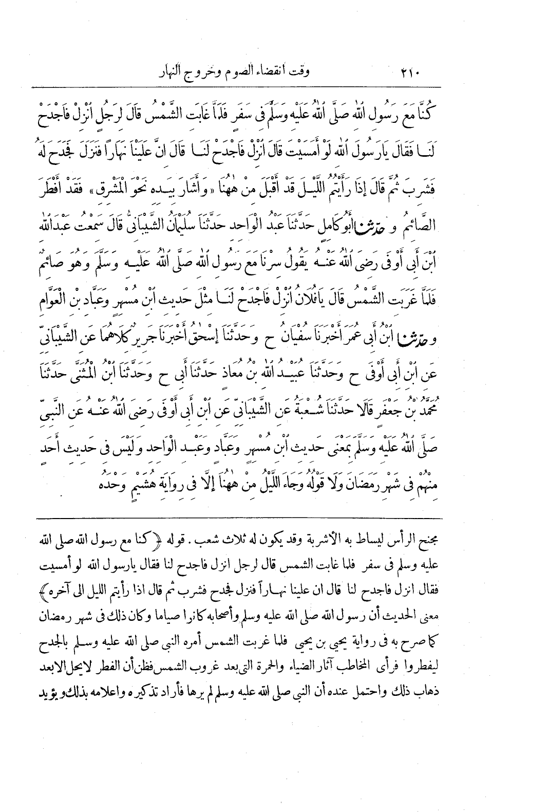 مُجَنَّحُ الرَّأْسِ لِيُسَاطَ بِهِ الْأَشْرِبَةُ وَقَدْ يَكُونُ له ثلاث شعب قَوْلُهُ (كُنَّا مَعَ رَسُولِ اللَّهِ صَلَّى اللَّهُ عَلَيْهِ وَسَلَّمَ فِي سَفَرٍ فَلَمَّا غَابَتِ الشَّمْسُ قَالَ لِرَجُلٍ انْزِلْ فَاجْدَحْ لَنَا فَقَالَ يَا رَسُولَ اللَّهِ لَوْ أَمْسَيْتَ فَقَالَ انْزِلْ فَاجْدَحْ لَنَا قَالَ إِنَّ عَلَيْنَا نَهَارًا فَنَزَلَ فَجَدَحَ فَشَرِبَ ثُمَّ قَالَ إِذَا رَأَيْتُمُ اللَّيْلَ إِلَى آخِرِهِ) مَعْنَى الْحَدِيثِ أَنَّ رَسُولَ اللَّهِ صَلَّى اللَّهُ عَلَيْهِ وَسَلَّمَ وَأَصْحَابَهُ كَانُوا صِيَامًا وَكَانَ ذَلِكَ فِي شَهْرِ رَمَضَانَ كَمَا صَرَّحَ بِهِ فِي رِوَايَةِ يَحْيَى بْنِ يَحْيَى فَلَمَّا غَرَبَتِ الشَّمْسُ أَمَرَهُ النَّبِيُّ صَلَّى اللَّهُ عَلَيْهِ وَسَلَّمَ بِالْجَدْحِ لِيُفْطِرُوا فَرَأَى الْمُخَاطَبُ آثَارَ الضِّيَاءِ وَالْحُمْرَةِ الَّتِي بَعْدَ غُرُوبِ الشَّمْسِ فَظَنَّ أَنَّ الْفِطْرَ لَا يَحِلُّ إِلَّا بَعْدَ ذَهَابِ ذَلِكَ وَاحْتَمَلَ عِنْدَهُ أَنَّ النَّبِيَّ صَلَّى اللَّهُ عَلَيْهِ وَسَلَّمَ لَمْ يَرَهَا فَأَرَادَ تَذْكِيرَهُ وَإِعْلَامَهُ بِذَلِكَ وَيُؤَيِّدُ