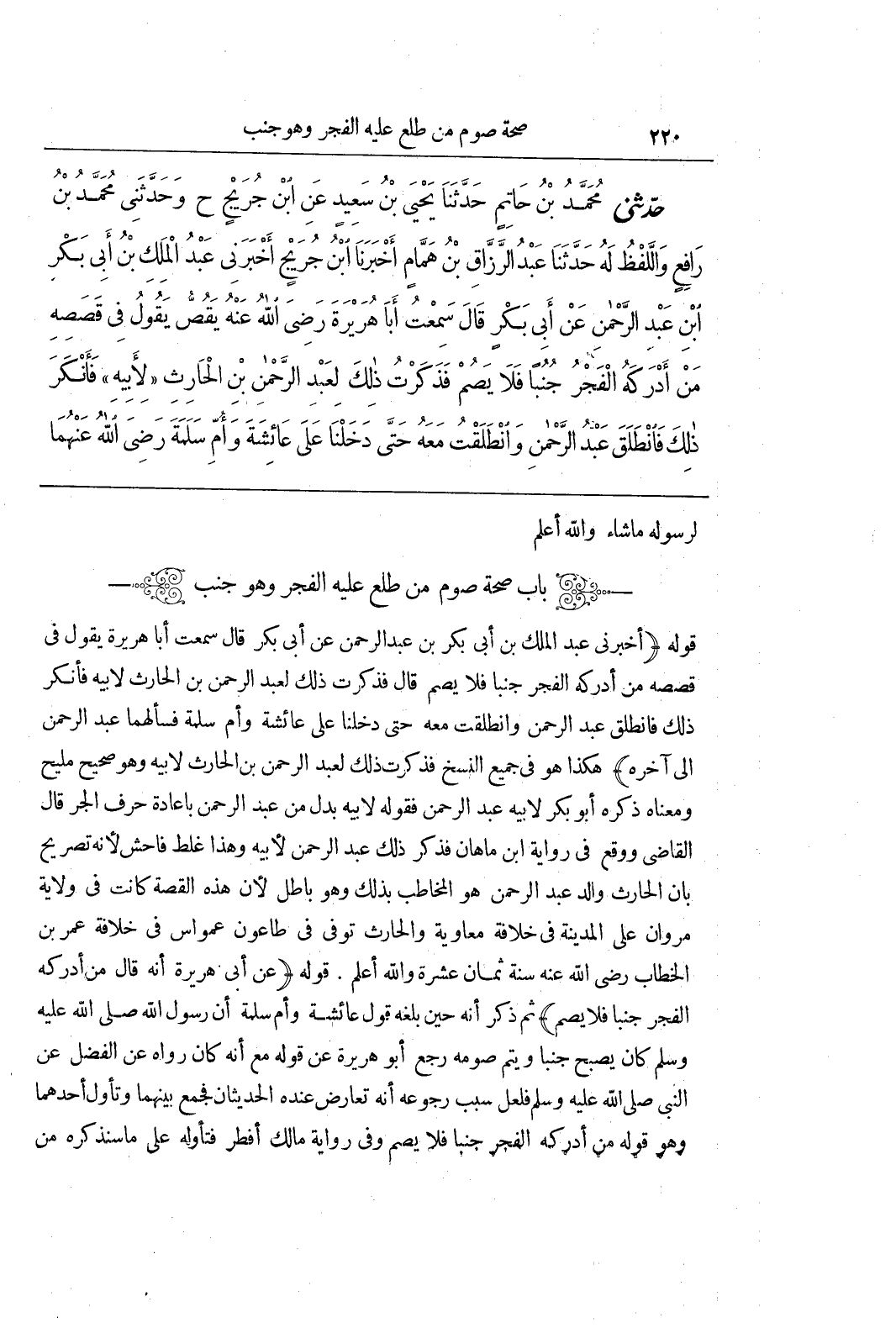 [1109] قَوْلُهُ (أَخْبَرَنِي عَبْدُ الْمَلِكِ بْنُ أَبِي بَكْرِ بْنِ عَبْدِ الرَّحْمَنِ عَنْ أَبِي بَكْرٍ قَالَ سَمِعْتُ أَبَا هُرَيْرَةَ يَقُولُ فِي قَصَصِهِ مَنْ أَدْرَكَهُ الْفَجْرُ جُنُبًا فَلَا يَصُمْ قَالَ فَذَكَرْتُ ذَلِكَ لِعَبْدِ الرَّحْمَنِ بْنِ الْحَارِثِ لِأَبِيهِ فَأَنْكَرَ ذَلِكَ فَانْطَلَقَ عَبْدُ الرَّحْمَنِ وَانْطَلَقْتُ مَعَهُ حَتَّى دَخَلْنَا عَلَى عَائِشَةَ وَأُمِّ سَلَمَةَ فَسَأَلَهُمَا عَبْدُ الرَّحْمَنِ إِلَى آخِرِهِ) هَكَذَا هُوَ فِي جَمِيعِ النُّسَخِ فَذَكَرْتُ ذَلِكَ لِعَبْدِ الرَّحْمَنِ بْنِ الْحَارِثِ لِأَبِيهِ وَهُوَ صَحِيحٌ مَلِيحٌ وَمَعْنَاهُ ذَكَرَهُ أَبُو بَكْرٍ لِأَبِيهِ عَبْدِ الرَّحْمَنِ فَقَوْلُهُ لِأَبِيهِ بَدَلٌ مِنْ عَبْدِ الرَّحْمَنِ بِإِعَادَةِ حَرْفِ الْجَرِّ قَالَ القاضي ووقع في رواية بن ماهان فذكر ذلك عَبْدُ الرَّحْمَنِ لِأَبِيهِ وَهَذَا غَلَطٌ فَاحِشٌ لِأَنَّهُ تَصْرِيحٌ بِأَنَّ الْحَارِثَ وَالِدُ عَبْدِ الرَّحْمَنِ هُوَ الْمُخَاطَبُ بِذَلِكَ وَهُوَ بَاطِلٌ لِأَنَّ هَذِهِ الْقِصَّةَ كَانَتْ فِي وِلَايَةِ مَرْوَانَ عَلَى الْمَدِينَةِ فِي خِلَافَةِ مُعَاوِيَةَ وَالْحَارِثُ تُوُفِّيَ فِي طَاعُونِ عَمَوَاسَ فِي خِلَافَةِ عُمَرَ بْنِ الْخَطَّابِ رَضِيَ اللَّهُ عَنْهُ سَنَةَ ثَمَانِ عَشْرَةَ وَاللَّهُ أَعْلَمُ قَوْلُهُ (عَنْ أَبِي هُرَيْرَةَ أَنَّهُ قَالَ مَنْ أَدْرَكَهُ الْفَجْرُ جُنُبًا فَلَا يَصُمْ) ثُمَّ ذَكَرَ أَنَّهُ حِينَ بَلَغَهُ قَوْلُ عَائِشَةَ وَأُمِّ سَلَمَةَ أَنَّ رسول الله صلى الله عليه وسلم كان يُصْبِحُ جُنُبًا وَيُتِمُّ صَوْمَهُ رَجَعَ أَبُو هُرَيْرَةَ عَنْ قَوْلِهِ مَعَ أَنَّهُ كَانَ رَوَاهُ عَنِ الْفَضْلِ عَنِ النَّبِيِّ صَلَّى اللَّهُ عَلَيْهِ وَسَلَّمَ فَلَعَلَّ سَبَبَ رُجُوعِهِ أَنَّهُ تَعَارَضَ عِنْدَهُ الْحَدِيثَانِ فَجَمَعَ بَيْنَهُمَا وَتَأَوَّلَ أَحَدَهُمَا وَهُوَ قَوْلُهُ مَنْ أَدْرَكَهُ الْفَجْرُ جُنُبًا فَلَا يَصُمْ وَفِي رِوَايَةِ مَالِكٍ أَفْطَرَ فَتَأَوَّلَهُ عَلَى مَا سَنَذْكُرُهُ مِنَ