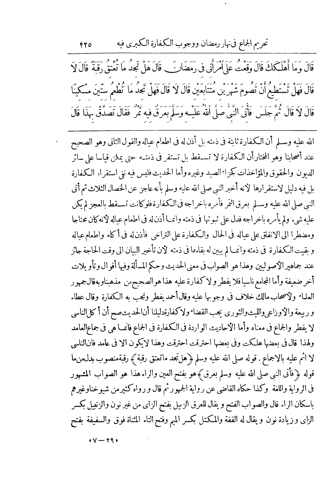 إِنَّ الْكَفَّارَةَ ثَابِتَةٌ فِي ذِمَّتِهِ بَلْ أَذِنَ لَهُ فِي إِطْعَامِ عِيَالِهِ وَالْقَوْلُ الثَّانِي وَهُوَ الصَّحِيحُ عِنْدَ أَصْحَابِنَا وَهُوَ الْمُخْتَارُ أَنَّ الْكَفَّارَةَ لَا تَسْقُطُ بَلْ تَسْتَقِرُّ فِي ذِمَّتِهِ حَتَّى يُمَكَّنَ قِيَاسًا عَلَى سَائِرِ الدُّيُونِ وَالْحُقُوقِ وَالْمُؤَاخَذَاتِ كَجَزَاءِ الصَّيْدِ وَغَيْرِهِ وَأَمَّا الْحَدِيثُ فَلَيْسَ فِيهِ نَفْيُ اسْتِقْرَارِ الْكَفَّارَةِ بَلْ فِيهِ دَلِيلٌ لِاسْتِقْرَارِهَا لِأَنَّهُ أَخْبَرَ النَّبِيَّ صَلَّى اللَّهُ عَلَيْهِ وَسَلَّمَ فِي الْكَفَّارَةِ بِأَنَّهُ عَاجِزٌ عَنِ الْخِصَالِ الثَّلَاثِ ثُمَّ أُتِيَ النَّبِيُّ صَلَّى اللَّهُ عَلَيْهِ وَسَلَّمَ بِعَرَقِ التَّمْرِ فَأَمَرَهُ بِإِخْرَاجِهِ فَلَوْ كَانَتْ تَسْقُطُ بِالْعَجْزِ لَمْ يَكُنْ عَلَيْهِ شَيْءٌ وَلَمْ يَأْمُرْهُ بِإِخْرَاجِهِ فَدَلَّ عَلَى ثُبُوتِهَا فِي ذِمَّتِهِ وَإِنَّمَا أَذِنَ لَهُ فِي إِطْعَامِ عِيَالِهِ لِأَنَّهُ كَانَ مُحْتَاجًا وَمُضْطَرًّا إِلَى الْإِنْفَاقِ عَلَى عِيَالِهِ فِي الْحَالِ وَالْكَفَّارَةُ عَلَى التَّرَاخِي فَأَذِنَ لَهُ فِي أَكْلِهِ وَإِطْعَامِ عِيَالِهِ وَبَقِيَتِ الْكَفَّارَةُ فِي ذِمَّتِهِ وَإِنَّمَا لَمْ يُبَيِّنْ لَهُ بَقَاءَهَا فِي ذِمَّتِهِ لِأَنَّ تَأْخِيرَ الْبَيَانِ إِلَى وَقْتِ الْحَاجَةِ جَائِزٌ عِنْدَ جَمَاهِيرِ الْأُصُولِيِّينَ وَهَذَا هُوَ الصَّوَابُ فِي مَعْنَى الْحَدِيثِ وَحُكْمِ الْمَسْأَلَةِ وَفِيهَا أَقْوَالٌ وَتَأْوِيلَاتٌ أُخَرُ ضَعِيفَةٌ وَأَمَّا الْمُجَامِعُ نَاسِيًا فَلَا يُفْطِرُ وَلَا كَفَّارَةَ عَلَيْهِ هَذَا هُوَ الصَّحِيحُ مِنْ مَذْهَبِنَا وَبِهِ قَالَ جُمْهُورُ الْعُلَمَاءِ وَلِأَصْحَابِ مَالِكٍ خِلَافٌ فِي وُجُوبِهَا عَلَيْهِ وَقَالَ أَحْمَدُ يُفْطِرُ وَتَجِبُ بِهِ الْكَفَّارَةُ وَقَالَ عَطَاءٌ وَرَبِيعَةُ وَالْأَوْزَاعِيُّ وَاللَّيْثُ وَالثَّوْرِيُّ يَجِبُ الْقَضَاءُ وَلَا كَفَّارَةَ دَلِيلُنَا أَنَّ الْحَدِيثَ صَحَّ أَنَّ أَكْلَ النَّاسِي لَا يُفْطِرُ وَالْجِمَاعُ فِي مَعْنَاهُ وَأَمَّا الْأَحَادِيثُ الْوَارِدَةُ فِي الْكَفَّارَةِ فِي الْجِمَاعِ فَإِنَّمَا هِيَ فِي جِمَاعِ الْعَامِدِ وَلِهَذَا قَالَ فِي بَعْضِهَا هَلَكْتُ وفي بعضها احترقت احترقت وهذا لايكون إِلَّا فِي عَامِدٍ فَإِنَّ النَّاسِيَ لَا إِثْمَ عَلَيْهِ بِالْإِجْمَاعِ