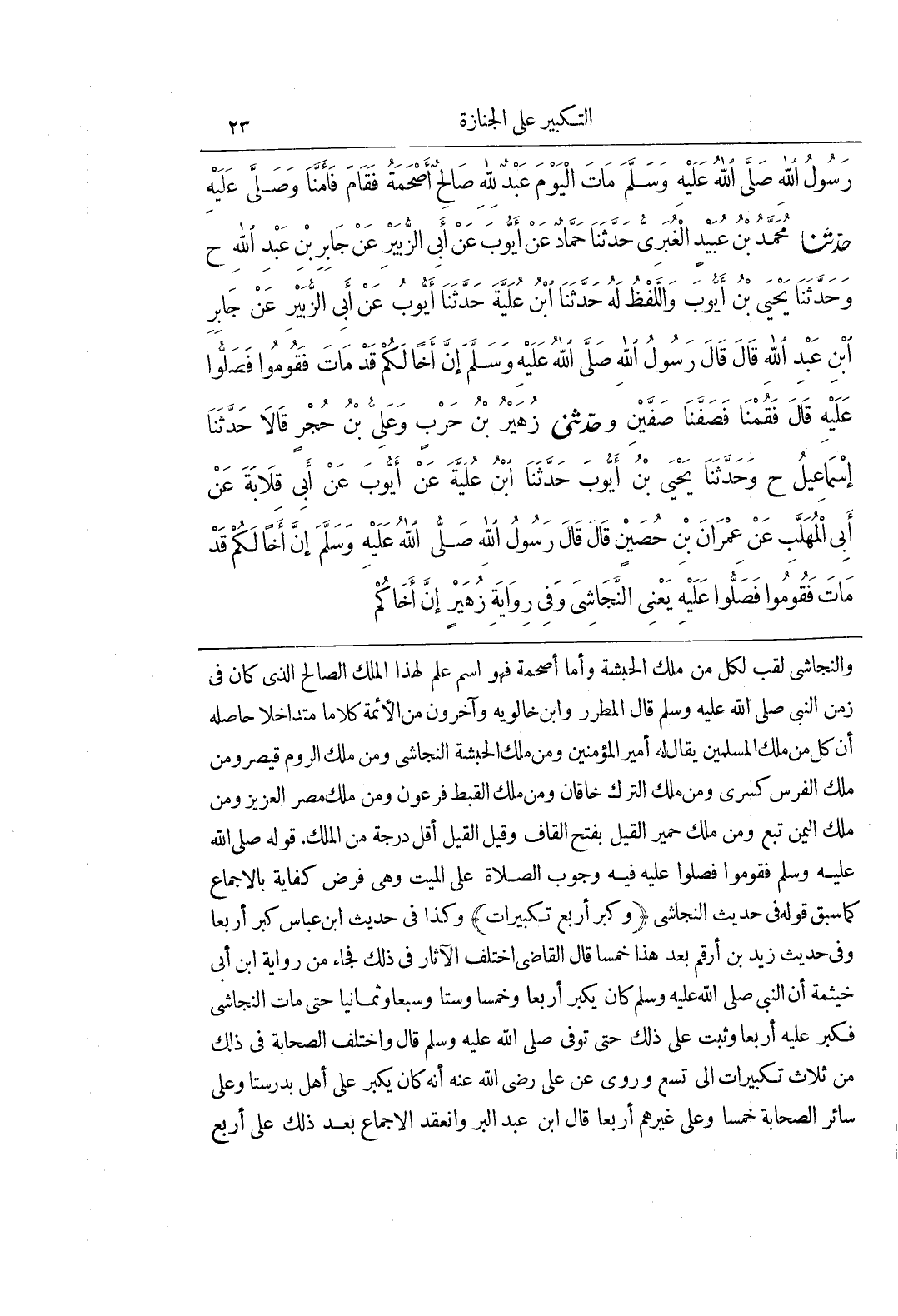 وَالنَّجَاشِيُّ لَقَبٌ لِكُلِّ مَنْ مَلَكَ الْحَبَشَةَ وَأَمَّا أَصْحَمَةُ فَهُوَ اسْمُ عَلَمٍ لِهَذَا الْمَلِكِ الصَّالِحِ الَّذِي كَانَ فِي زَمَنِ النَّبِيِّ صَلَّى اللَّهُ عَلَيْهِ وَسَلَّمَ قال المطرز وبن خَالَوَيْهِ وَآخَرُونَ مِنَ الْأَئِمَّةِ كَلَامًا مُتَدَاخِلًا حَاصِلُهُ أَنَّ كُلَّ مَنْ مَلَكَ الْمُسْلِمِينَ يُقَالُ لَهُ أَمِيرُ الْمُؤْمِنِينَ وَمَنْ مَلَكَ الْحَبَشَةَ النَّجَاشِيُّ وَمَنْ مَلَكَ الرُّومَ قَيْصَرُ وَمَنْ مَلَكَ الْفَرَسَ كِسْرَى وَمَنْ مَلَكَ التُّرْكَ خاقَانُ وَمَنْ مَلَكَ الْقِبْطَ فِرْعَوْنُ وَمَنْ مَلَكَ مِصْرَ الْعَزِيزُ وَمَنْ مَلَكَ الْيَمَنَ تُبَّعُ وَمَنْ مَلَكَ حِمْيَرَ الْقَيْلُ بِفَتْحِ الْقَافِ وَقِيلَ الْقَيْلُ أَقَلُّ دَرَجَةً مِنَ المَلِكِ قَوْلُهُ صَلَّى اللَّهُ عَلَيْهِ وَسَلَّمَ قُومُوا فَصَلُّوا عَلَيْهِ فِيهِ وُجُوبُ الصَّلَاةِ عَلَى الْمَيِّتِ وَهِيَ فَرْضُ كِفَايَةٍ بِالْإِجْمَاعِ كَمَا سَبَقَ قَوْلُهُ فِي حَدِيثِ النَّجَاشِيِّ (وَكَبَّرَ أَرْبَعَ تَكْبِيرَاتٍ) وَكَذَا فِي حديث بن عَبَّاسٍ كَبَّرَ أَرْبَعًا وَفِي حَدِيثِ زَيْدِ بْنِ أَرْقَمَ بَعْدَ هَذَا خَمْسًا قَالَ الْقَاضِي اخْتَلَفَ الآثار في ذلك فجاء في رواية بن أَبِي خَيْثَمَةَ أَنَّ النَّبِيَّ صَلَّى اللَّهُ عَلَيْهِ وَسَلَّمَ كَانَ يكبر أربعا وخسما وَسِتًّا وَسَبْعًا وَثَمَانِيًا حَتَّى مَاتَ النَّجَاشِيُّ فَكَبَّرَ عَلَيْهِ أَرْبَعًا وَثَبَتَ عَلَى ذَلِكَ حَتَّى تُوُفِّيَ صَلَّى اللَّهُ عَلَيْهِ وَسَلَّمَ قَالَ وَاخْتَلَفَ الصَّحَابَةُ فِي ذَلِكَ مِنْ ثَلَاثِ تَكْبِيرَاتٍ إِلَى تِسْعٍ وَرُوِيَ عَنْ عَلِيٍّ رَضِيَ اللَّهُ عَنْهُ أَنَّهُ كَانَ يُكَبِّرُ عَلَى أَهْلِ بَدْرٍ سِتًّا وَعَلَى سائر الصحابة خمسا وعلى غيرهم أربعا قال بن عَبْدِ الْبَرِّ وَانْعَقَدَ الْإِجْمَاعُ بَعْدَ ذَلِكَ عَلَى أربع