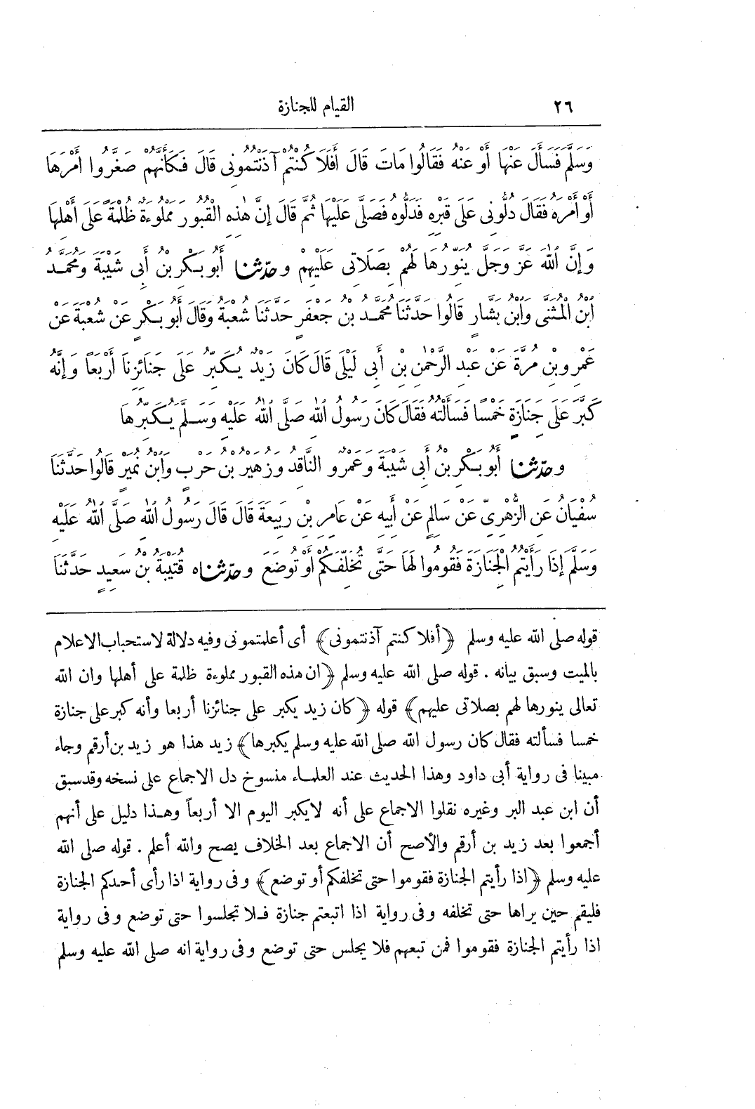 [956] قَوْلُهُ صَلَّى اللَّهُ عَلَيْهِ وَسَلَّمَ (إِنَّ هَذِهِ الْقُبُورَ مَمْلُوءَةٌ ظُلْمَةٌ عَلَى أَهْلِهَا وَإِنَّ اللَّهَ تَعَالَى يُنَوِّرُهَا لَهُمْ بِصَلَاتِي عَلَيْهِمْ) قَوْلُهُ (كَانَ زَيْدٌ يُكَبِّرُ عَلَى جَنَائِزِنَا أَرْبَعًا وَأَنَّهُ كَبَّرَ عَلَى جِنَازَةٍ خَمْسًا فَسَأَلْتُهُ فَقَالَ كَانَ رَسُولُ اللَّهِ صَلَّى اللَّهُ عَلَيْهِ وَسَلَّمَ يُكَبِّرُهَا) زَيْدٌ هَذَا هُوَ زَيْدُ بْنُ أَرْقَمَ وَجَاءَ مُبَيَّنًا فِي رِوَايَةِ أَبِي دَاوُدَ وَهَذَا الْحَدِيثُ عِنْدَ الْعُلَمَاءِ مَنْسُوخٌ دَلَّ الْإِجْمَاعُ على نسخه وقد سبق أن بن عَبْدِ الْبَرِّ وَغَيْرَهُ نَقَلُوا الْإِجْمَاعَ عَلَى أَنَّهُ لَا يُكَبِّرُ الْيَوْمَ إِلَّا أَرْبَعًا وَهَذَا دَلِيلٌ عَلَى أَنَّهُمْ أَجْمَعُوا بَعْدَ زَيْدِ بْنِ أَرْقَمَ وَالْأَصَحُّ أَنَّ الْإِجْمَاعَ بَعْدَ الْخِلَافِ يَصِحُّ وَاللَّهُ أَعْلَمُ قَوْلُهُ صَلَّى اللَّهُ عَلَيْهِ وَسَلَّمَ (إِذَا رَأَيْتُمُ الْجِنَازَةَ فَقُومُوا حَتَّى تُخَلِّفَكُمْ أوْ تُوضَعَ) وَفِي رِوَايَةٍ إِذَا رَأَى أَحَدُكُمُ الْجِنَازَةَ فَلْيَقُمْ حِينَ يَرَاهَا حَتَّى تُخَلِّفَهُ وَفِي رِوَايَةٍ إِذَا اتَّبَعْتُمْ جِنَازَةً فَلَا تَجْلِسُوا حَتَّى تُوضَعَ وَفِي رِوَايَةٍ إِذَا رَأَيْتُمْ الْجِنَازَةَ فَقُومُوا فَمَنْ تَبِعَهُمْ فَلَا يَجْلِسْ حَتَّى تُوضَعَ وَفِي رِوَايَةٍ أَنَّهُ
