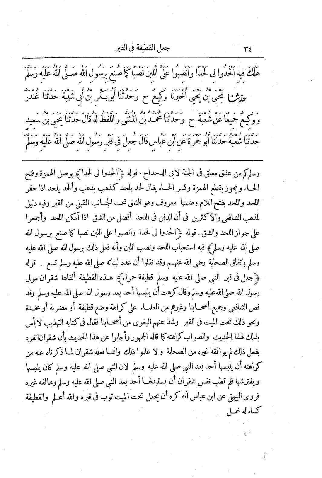[967] قَوْلُهُ (جُعِلَ فِي قَبْرِ النَّبِيِّ صَلَّى اللَّهُ عَلَيْهِ وَسَلَّمَ قَطِيفَةٌ حَمْرَاءُ) هَذِهِ الْقَطِيفَةُ أَلْقَاهَا شُقْرَانُ مَوْلَى رَسُولِ اللَّهِ صَلَّى اللَّهُ عَلَيْهِ وَسَلَّمَ وَقَالَ كَرِهْتُ أَنْ يَلْبَسَهَا أَحَدٌ بَعْدَ رَسُولِ اللَّهِ صَلَّى اللَّهُ عَلَيْهِ وَسَلَّمَ وَقَدْ نَصَّ الشَّافِعِيُّ وَجَمِيعُ أَصْحَابِنَا وَغَيْرُهُمْ مِنَ الْعُلَمَاءِ عَلَى كَرَاهَةِ وَضْعِ قَطِيفَةٍ أَوْ مِضْرَبَةٍ أَوْ مِخَدَّةٍ وَنَحْوِ ذَلِكَ تَحْتَ الْمَيِّتِ فِي الْقَبْرِ وَشَذَّ عَنْهُمُ الْبَغَوِيُّ مِنْ أَصْحَابِنَا فَقَالَ فِي كِتَابهِ التَّهْذِيبِ لَا بَأْسَ بِذَلِكَ لِهَذَا الْحَدِيثِ وَالصَّوَابُ كَرَاهَتُهُ كَمَا قَالَهُ الْجُمْهُورُ وَأَجَابُوا عَنْ هَذَا الْحَدِيثِ بِأَنَّ شُقْرَانَ انْفَرَدَ بِفِعْلِ ذَلِكَ لَمْ يُوَافِقْهُ غَيْرُهُ مِنَ الصَّحَابَةِ وَلَا عَلِمُوا ذَلِكَ وَإِنَّمَا فَعَلَهُ شُقْرَانُ لِمَا ذَكَرْنَاهُ عَنْهُ مِنْ كَرَاهَتِهِ أَنْ يَلْبَسَهَا أَحَدٌ بَعْدَ النَّبِيِّ صَلَّى اللَّهُ عَلَيْهِ وَسَلَّمَ لِأَنَّ النَّبِيَّ صَلَّى اللَّهُ عَلَيْهِ وَسَلَّمَ كَانَ يَلْبَسُهَا وَيَفْتَرِشُهَا فَلَمْ تَطِبْ نَفْسُ شُقْرَانَ أَنْ يَسْتَبْدِلَهَا أَحَدٌ بَعْدَ النَّبِيِّ صَلَّى اللَّهُ عَلَيْهِ وَسَلَّمَ وَخَالَفَهُ غَيْرُهُ فروى البيهقي عن بن عَبَّاسٍ أَنَّهُ كَرِهَ أَنْ يُجْعَلَ تَحْتَ الْمَيِّتِ ثَوْبٌ فِي قَبْرِهِ وَاللَّهُ أَعْلَمُ وَالْقَطِيفَةُ كِسَاءٌ له خمل