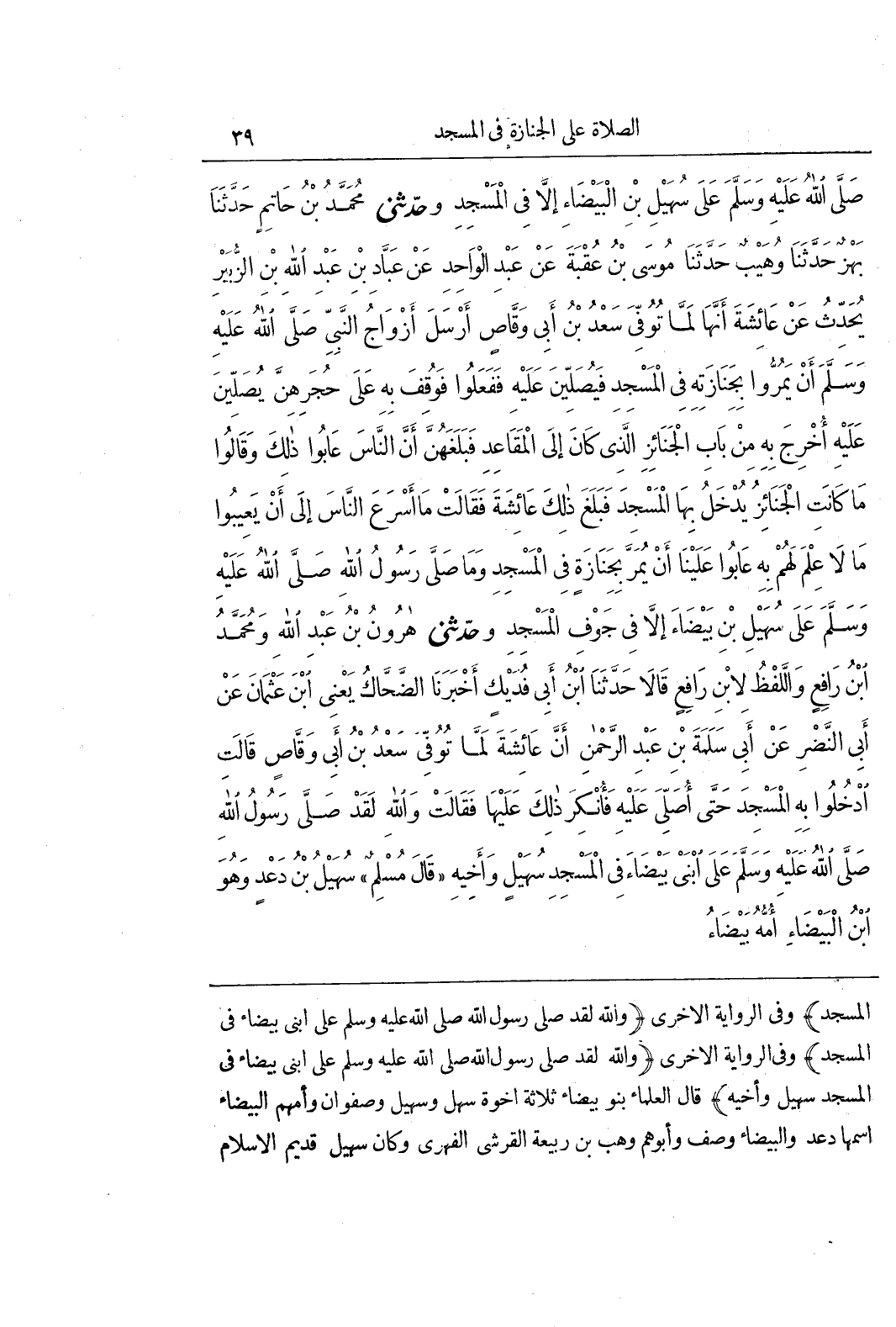 الْمَسْجِدِ) وَفِي الرِّوَايَةِ الْأُخْرَى (وَاللَّهِ لَقَدْ صَلَّى رَسُولُ اللَّهِ صَلَّى اللَّهُ عَلَيْهِ وَسَلَّمَ على ابْنَيْ بَيْضَاءَ فِي الْمَسْجِدِ) وَفِي الرِّوَايَةِ الْأُخْرَى (وَاللَّهِ لَقَدْ صَلَّى رَسُولُ اللَّهِ صَلَّى اللَّهُ عَلَيْهِ وَسَلَّمَ عَلَى ابْنَيْ بَيْضَاءَ فِي الْمَسْجِدِ سُهَيْلٍ وَأَخِيهِ) قَالَ الْعُلَمَاءُ بَنُو بَيْضَاءَ ثَلَاثَةُ إِخْوَةٍ سَهْلٌ وَسُهَيْلٌ وَصَفْوَانُ وَأُمُّهُمُ الْبَيْضَاءُ اسْمُهَا دَعْدُ وَالْبَيْضَاءُ وَصْفٌ وَأَبُوهُمْ وَهْبُ بْنُ رَبِيعَةَ الْقُرَشِيُّ الْفِهْرِيُّ وَكَانَ سُهَيْلٌ قَدِيمَ الْإِسْلَامِ