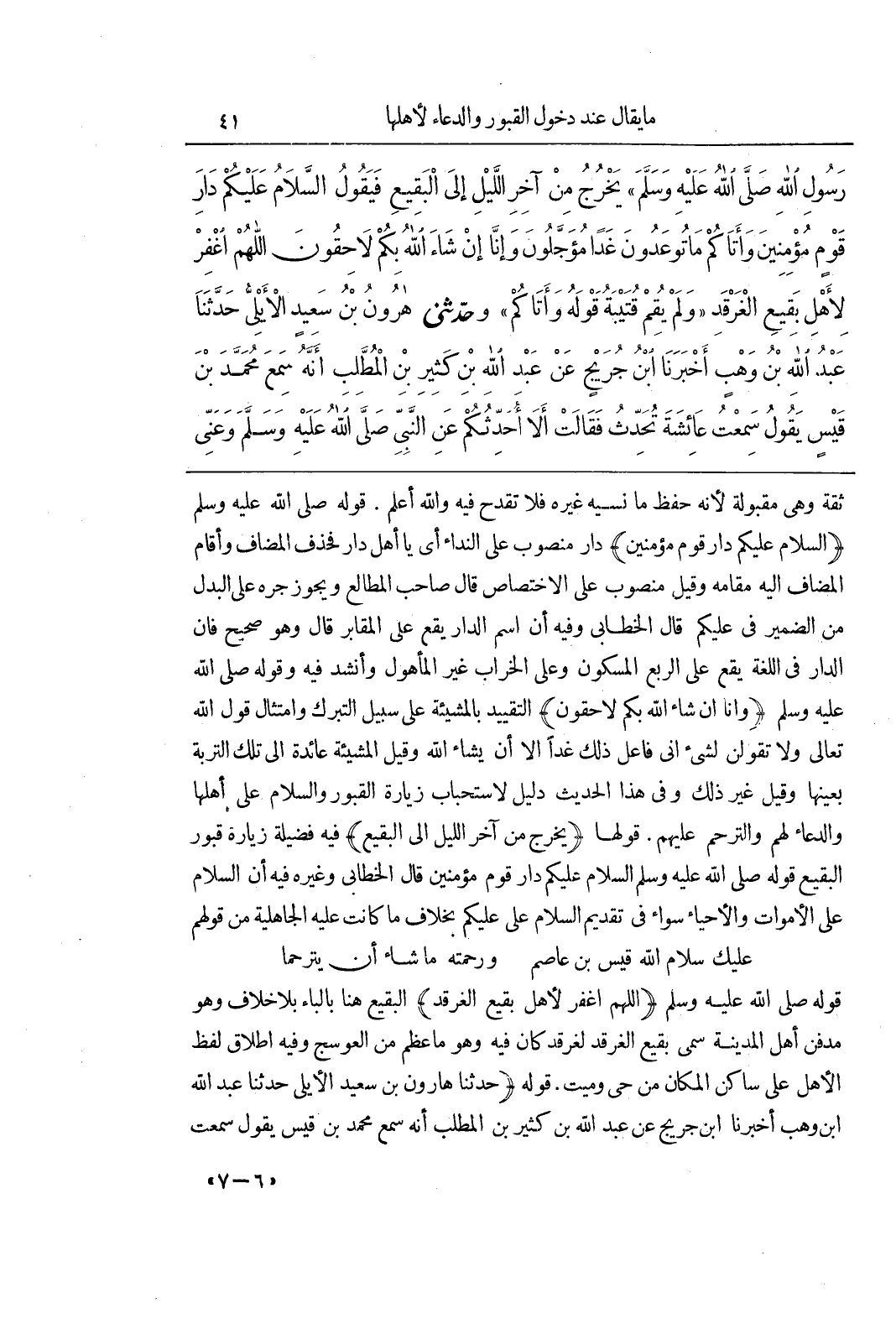 [974] قَوْلُهُ صَلَّى اللَّهُ عَلَيْهِ وَسَلَّمَ (السَّلَامُ عَلَيْكُمْ دَارَ قَوْمٍ مُؤْمِنِينَ) دَارَ مَنْصُوبٌ عَلَى النِّدَاءِ أَيْ يَا أَهْلَ دَارٍ فَحَذَفَ الْمُضَافَ وَأَقَامَ الْمُضَافَ إِلَيْهِ مَقَامَهُ وَقِيلَ مَنْصُوبٌ عَلَى الِاخْتِصَاصِ قَالَ صَاحِبُ الْمَطَالِعِ وَيَجُوزُ جَرُّهُ عَلَى الْبَدَلِ مِنَ الضَّمِيرِ فِي عَلَيْكُمْ قَالَ الْخَطَّابِيُّ وَفِيهِ أَنَّ اسْمَ الدَّارِ يَقَعُ عَلَى الْمَقَابِرِ قَالَ وَهُوَ صَحِيحٌ فَإِنَّ الدَّارَ فِي اللُّغَةِ يَقَعُ عَلَى الرَّبْعِ الْمَسْكُونِ وَعَلَى الْخَرَابِ غَيْرِ الْمَأْهُولِ وَأَنْشَدَ فِيهِ وَقَوْلُهُ صَلَّى اللَّهُ عَلَيْهِ وَسَلَّمَ (وَإِنَّا إِنْ شَاءَ اللَّهُ بِكُمْ لَاحِقُونَ) التَّقْيِيدُ بِالْمَشِيئَةِ عَلَى سَبِيلِ التَّبَرُّكِ وَامْتِثَالِ قَوْلِ اللَّهِ تَعَالَى وَلَا تَقُولَنَّ لِشَيْءٍ إِنِّي فَاعِلٌ ذَلِكَ غَدًا الا أن يشاء الله وَقِيلَ الْمَشِيئَةُ عَائِدَةٌ إِلَى تِلْكَ التُّرْبَةِ بِعَيْنِهَا وَقِيلَ غَيْرُ ذَلِكَ وَفِي هَذَا الْحَدِيثِ دَلِيلٌ لِاسْتِحْبَابِ زِيَارَةِ الْقُبُورِ وَالسَّلَامِ عَلَى أَهْلِهَا وَالدُّعَاءِ لَهُمْ وَالتَّرَحُّمِ عَلَيْهِمْ قَوْلُهَا (يَخْرُجُ مِنْ آخِرِ اللَّيْلِ إِلَى الْبَقِيعِ) فِيهِ فَضِيلَةُ زِيَارَةِ قُبُورِ الْبَقِيعِ قَوْلُهُ صَلَّى اللَّهُ عَلَيْهِ وَسَلَّمَ السَّلَامُ عَلَيْكُمْ دَارَ قَوْمٍ مُؤْمِنِينَ قَالَ الْخَطَّابِيُّ وَغَيْرُهُ فِيهِ أَنَّ السَّلَامَ عَلَى الْأَمْوَاتِ وَالْأَحْيَاءِ سَوَاءٌ فِي تَقْدِيمِ السَّلَامُ عَلَى عَلَيْكُمْ بِخِلَافِ مَا كَانَتْ عَلَيْهِ الْجَاهِلِيَّةُ مِنْ قَوْلِهِمْ ... عَلَيْكَ سَلَامُ اللَّهِ قَيْسَ بْنَ عَاصِمٍ ... وَرَحْمَتُهُ مَا شَاءَ أَنْ يَتَرَحَّمَا ...