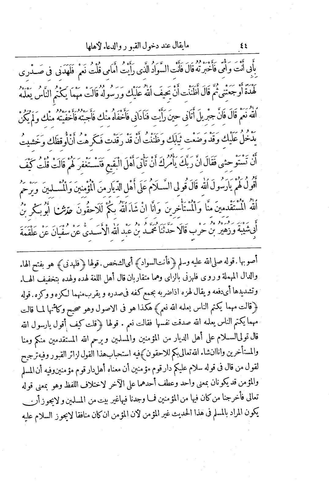 أَصْوَبُهَا قَوْلُهُ صَلَّى اللَّهُ عَلَيْهِ وَسَلَّمَ (فَأَنْتِ السَّوَادُ) أَيِ الشَّخْصُ قَوْلُهَا (فَلَهَدَنِي) هُوَ بِفَتْحِ الْهَاءِ وَالدَّالِ الْمُهْمَلَةِ وَرُوِيَ فَلَهَزَنِي بِالزَّايِ وَهُمَا مُتَقَارِبَانِ قَالَ أَهْلُ اللُّغَةِ لَهَدَهُ وَلَهَّدَهُ بِتَخْفِيفِ الْهَاءِ وَتَشْدِيدِهَا أَيْ دَفَعَهُ وَيُقَالُ لَهَزَهُ إِذَا ضَرَبَهُ بِجَمْعِ كَفِّهِ فِي صَدْرِهِ وَيَقْرَبُ مِنْهُمَا لَكَزَهُ وَوَكَزَهُ قَوْلُهُ (قَالَتْ مَهْمَا يَكْتُمِ النَّاسُ يَعْلَمْهُ اللَّهُ نَعَمْ) هَكَذَا هُوَ فِي الْأُصُولِ وَهُوَ صَحِيحٌ وَكَأَنَّهَا لَمَّا قَالَتْ مَهْمَا يَكْتُمِ النَّاسُ يَعْلَمْهُ اللَّهُ صَدَّقَتْ نَفْسَهَا فَقَالَتْ نَعَمْ قَوْلُهَا (قُلْتُ كَيْفَ أَقُولُ يَا رَسُولَ اللَّهِ قَالَ قُولِي السَّلَامُ عَلَى أَهْلِ الدِّيَارِ مِنَ الْمُؤْمِنِينَ وَالْمُسْلِمِينَ وَيَرْحَمُ اللَّهُ الْمُسْتَقْدِمِينَ مِنْكُمْ وَمِنَّا وَالْمُسْتَأْخِرِينَ وَإِنَّا إِنْ شَاءَ اللَّهُ تَعَالَى بِكُمْ لَلَاحِقُونَ) فِيهِ اسْتِحْبَابُ هَذَا الْقَوْلِ لِزَائِرِ الْقُبُورِ وَفِيهِ تَرْجِيحٌ لِقَوْلِ مَنْ قَالَ فِي قَوْلِهِ سَلَامٌ عَلَيْكُمْ دَارَ قَوْمٍ مُؤْمِنِينَ أَنَّ مَعْنَاهُ أَهْلَ دَارِ قَوْمٍ مُؤْمِنِينَ وَفِيهِ أَنَّ الْمُسْلِمَ وَالْمُؤْمِنَ قَدْ يَكُونَانِ بِمَعْنًى وَاحِدٍ وَعَطْفُ أَحَدِهِمَا عَلَى الْآخَرِ لِاخْتِلَافِ اللَّفْظِ وَهُوَ بِمَعْنَى قَوْلِهِ تَعَالَى فَأَخْرَجْنَا مَنْ كَانَ فِيهَا مِنَ الْمُؤْمِنِينَ فَمَا وَجَدْنَا فِيهَا غَيْرَ بَيْتٍ مِنَ الْمُسْلِمِينَ وَلَا يَجُوزُ أَنْ يَكُونَ الْمُرَادُ بِالْمُسْلِمِ فِي هَذَا الْحَدِيثِ غَيْرَ الْمُؤْمِنِ لِأَنَّ الْمُؤْمِنَ إِنْ كَانَ مُنَافِقًا لَا يَجُوزُ السَّلَامُ عَلَيْهِ