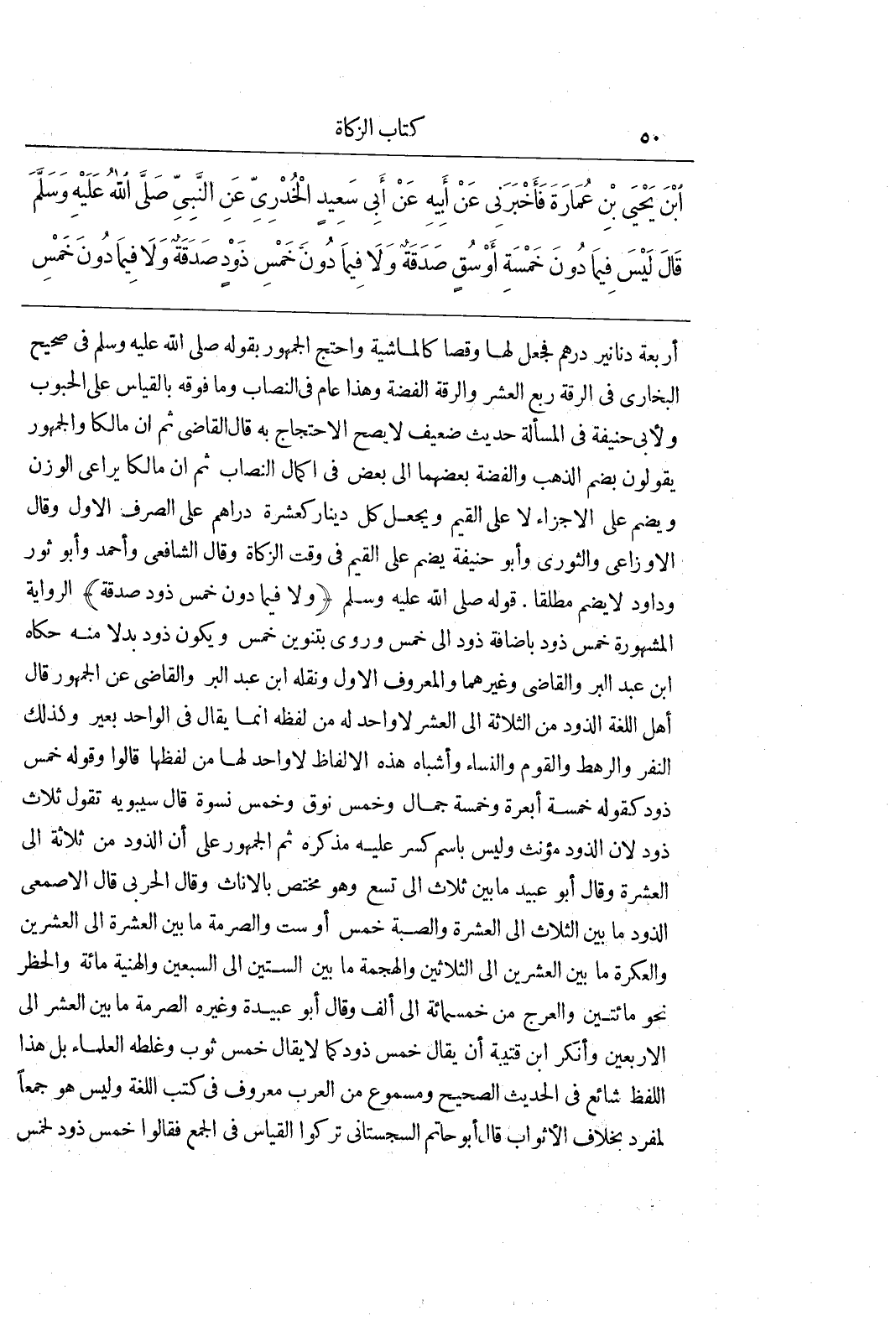 أَرْبَعَةِ دَنَانِيرَ دِرْهَمٌ فَجَعَلَ لَهَا وَقْصًا كَالْمَاشِيَةِ وَاحْتَجَّ الْجُمْهُورُ بِقَوْلِهِ صَلَّى اللَّهُ عَلَيْهِ وَسَلَّمَ فِي صَحِيحِ الْبُخَارِيِّ فِي الرِّقَّةِ رُبُعُ الْعُشُرِ وَالرِّقَّةُ الْفِضَّةُ وَهَذَا عَامٌّ فِي النِّصَابِ وَمَا فَوْقَهُ بِالْقِيَاسِ عَلَى الْحُبُوبِ وَلِأَبِي حَنِيفَةَ فِي الْمَسْأَلَةِ حَدِيثٌ ضَعِيفٌ لَا يَصِحُّ الِاحْتِجَاجُ بِهِ قَالَ الْقَاضِي ثُمَّ إِنَّ مَالِكًا وَالْجُمْهُورَ يَقُولُونَ بِضَمِّ الذَّهَبِ وَالْفِضَّةِ بَعْضِهِمَا إِلَى بَعْضٍ فِي إِكْمَالِ النِّصَابِ ثُمَّ إِنَّ مَالِكًا يُرَاعِي الْوَزْنَ وَيَضُمُّ عَلَى الْأَجْزَاءِ لَا عَلَى الْقِيَمِ وَيَجْعَلُ كُلَّ دِينَارٍ كَعَشَرَةِ دَرَاهِمَ عَلَى الصَّرْفِ الْأَوَّلِ وَقَالَ الْأَوْزَاعِيُّ وَالثَّوْرِيُّ وَأَبُو حَنِيفَةَ يُضَمُّ عَلَى الْقِيَمِ فِي وَقْتِ الزَّكَاةِ وَقَالَ الشَّافِعِيُّ وَأَحْمَدُ وَأَبُو ثَوْرٍ وَدَاوُدُ لَا يُضَمُّ مُطْلَقًا قَوْلُهُ صَلَّى اللَّهُ عَلَيْهِ وَسَلَّمَ (وَلَا فِيمَا دُونَ خَمْسِ ذَوْدٍ صَدَقَةٌ) الرِّوَايَةُ الْمَشْهُورَةُ خَمْسِ ذَوْدٍ بِإِضَافَةِ ذَوْدٍ إِلَى خَمْسٍ وَرُوِيَ بِتَنْوِينِ خَمْسٍ ويكون ذود بدلا منه حكاه بن عَبْدِ الْبَرِّ وَالْقَاضِي وَغَيْرُهُمَا وَالْمَعْرُوفُ الْأَوَّلُ وَنَقَلَهُ بن عَبْدِ الْبَرِّ وَالْقَاضِي عَنِ الْجُمْهُورِ قَالَ أَهْلُ اللغة الذود من الثلاثة إلى العشر لا واحد له من لفظه انما يُقَالُ فِي الْوَاحِدِ بَعِيرٌ وَكَذَلِكَ النَّفَرُ وَالرَّهْطُ وَالْقَوْمُ وَالنِّسَاءُ وَأَشْبَاهُ هَذِهِ الْأَلْفَاظِ لَا وَاحِدَ لَهَا مِنْ لَفْظِهَا قَالُوا وَقَوْلُهُ خَمْسِ ذَوْدٍ كَقَوْلِهِ خَمْسَةِ أَبْعِرَةٍ وَخَمْسَةِ جِمَالٍ وَخَمْسِ نُوقٍ وَخَمْسِ نِسْوَةٍ قَالَ سِيبَوَيْهِ تَقُولُ ثَلَاثُ ذَوْدٍ لِأَنَّ الذَّوْدَ مُؤَنَّثٌ وَلَيْسَ بِاسْمِ كَسْرٍ عَلَيْهِ مُذَكَّرُهُ ثُمَّ الْجُمْهُورُ عَلَى أَنَّ الذَّوْدَ مِنْ ثَلَاثَةٍ إِلَى الْعَشَرَةِ وَقَالَ أَبُو عُبَيْدٍ مَا بَيْنَ ثَلَاثٍ إِلَى تِسْعٍ وَهُوَ مُخْتَصٌّ بِالْإِنَاثِ وَقَالَ الْحَرْبِيُّ قَالَ الْأَصْمَعِيُّ الذَّوْدُ مَا بَيْنَ الثَّلَاثِ إِلَى الْعَشَرَةِ وَالصُّبَّةُ خَمْسٌ أَوْ سِتٌّ وَالصِّرْمَةُ مَا بَيْنَ الْعَشَرَةِ إِلَى الْعِشْرِينَ وَالْعَكَرَةُ مَا بَيْنَ الْعِشْرِينَ إِلَى الثَّلَاثِينَ وَالْهَجْمَةُ مَا بَيْنَ السِّتِّينَ إِلَى السَّبْعِينَ وَالْهُنَيَّةُ مِائَةٌ وَالْحَظْرُ نَحْوُ مِائَتَيْنِ وَالْعَرْجُ مِنْ خَمْسِمِائَةٍ إِلَى أَلْفٍ وَقَالَ أَبُو عُبَيْدَةَ وَغَيْرُهُ الصِّرْمَةُ مَا بَيْنَ العشر إلى الاربعين وأنكر بن قُتَيْبَةَ أَنْ يُقَالَ خَمْسُ ذَوْدٍ كَمَا لَا يُقَالُ خَمْسُ ثَوْبٍ وَغَلَّطَهُ الْعُلَمَاءُ بَلْ هَذَا اللَّفْظُ شَائِعٌ فِي الْحَدِيثِ الصَّحِيحِ وَمَسْمُوعٌ مِنَ الْعَرَبِ مَعْرُوفٌ فِي كُتُبِ اللُّغَةِ وَلَيْسَ هُوَ جمعا لمفرد بِخِلَافِ الْأَثْوَابِ قَالَ أَبُو حَاتِمٍ السِّجِسْتَانِيُّ تَرَكُوا الْقِيَاسَ فِي الْجَمْعِ فَقَالُوا خَمْسُ ذَوْدٍ لِخَمْسٍ