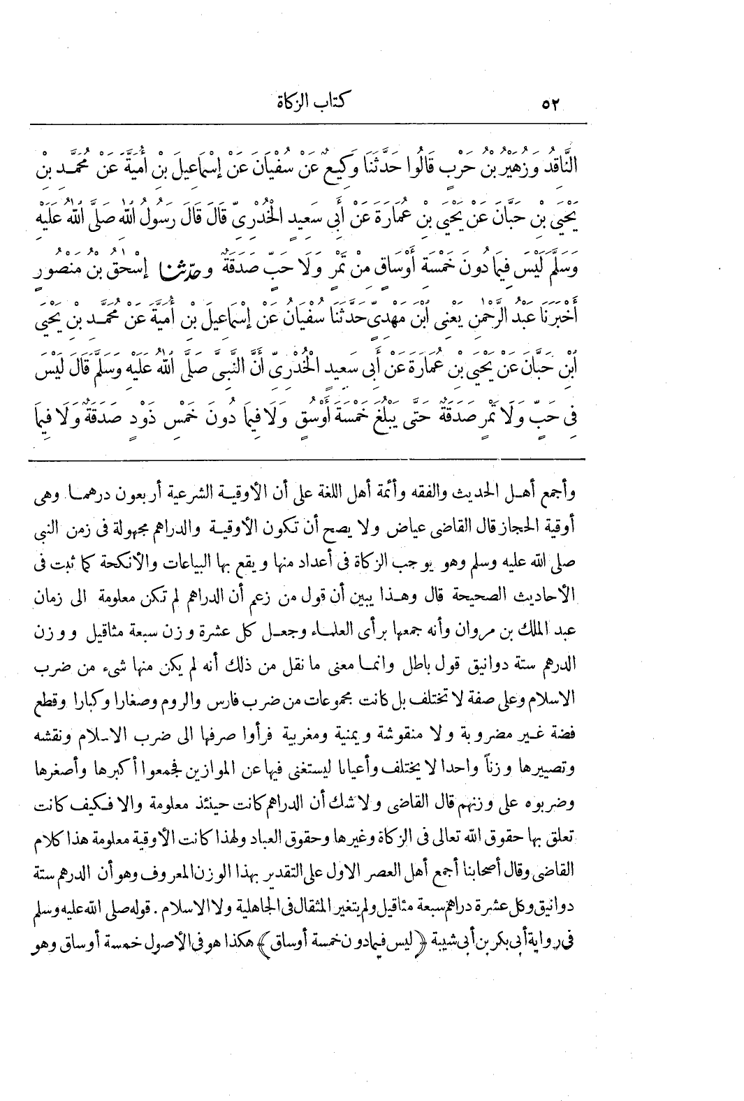 وَأَجْمَعَ أَهْلُ الْحَدِيثِ وَالْفِقْهِ وَأَئِمَّةُ أَهْلِ اللُّغَةِ عَلَى أَنَّ الْأُوقِيَّةَ الشَّرْعِيَّةَ أَرْبَعُونَ دِرْهَمًا وَهِيَ أُوقِيَّةُ الْحِجَازِ قَالَ الْقَاضِي عِيَاضٌ وَلَا يَصِحُّ أَنْ تَكُونَ الْأُوقِيَّةُ وَالدَّرَاهِمُ مَجْهُولَةً فِي زَمَنِ النَّبِيِّ صَلَّى اللَّهُ عَلَيْهِ وَسَلَّمَ وَهُوَ يُوجِبُ الزَّكَاةَ فِي أَعْدَادٍ مِنْهَا وَيَقَعُ بِهَا الْبِيَاعَاتُ وَالْأَنْكِحَةُ كَمَا ثَبَتَ فِي الْأَحَادِيثِ الصَّحِيحَةِ قَالَ وَهَذَا يُبَيِّنُ أَنَّ قَوْلَ مَنْ زَعَمَ أَنَّ الدَّرَاهِمَ لَمْ تَكُنْ مَعْلُومَةً إِلَى زَمَانِ عَبْدِ الْمَلِكِ بْنِ مَرْوَانَ وَأَنَّهُ جَمَعَهَا بِرَأْيِ الْعُلَمَاءِ وَجَعَلَ كُلَّ عَشَرَةٍ وَزْنَ سَبْعَةِ مَثَاقِيلَ وَوَزْنُ الدِّرْهَمِ سِتَّةُ دَوَانِيقَ قَوْلٌ بَاطِلٌ وَإِنَّمَا مَعْنَى مَا نُقِلَ مِنْ ذَلِكَ أَنَّهُ لَمْ يَكُنْ مِنْهَا شَيْءٌ مِنْ ضَرْبِ الْإِسْلَامِ وَعَلَى صِفَةٍ لَا تَخْتَلِفُ بَلْ كَانَتْ مَجْمُوعَاتٍ مِنْ ضَرْبِ فَارِسَ وَالرُّومِ وَصِغَارًا وَكِبَارًا وَقِطَعَ فِضَّةٍ غَيْرَ مَضْرُوبَةٍ وَلَا مَنْقُوشَةٍ وَيَمَنِيَّةٍ وَمَغْرِبِيَّةٍ فَرَأَوْا صَرْفَهَا إِلَى ضَرْبِ الْإِسْلَامِ وَنَقْشِهِ وَتَصْيِيرَهَا وَزْنًا وَاحِدًا لَا يَخْتَلِفُ وَأَعْيَانًا لِيُسْتَغْنَى فِيهَا عَنِ الْمَوَازِينِ فَجَمَعُوا أَكْبَرَهَا وَأَصْغَرَهَا وَضَرَبُوهُ عَلَى وَزْنِهِمْ قَالَ الْقَاضِي وَلَا شَكَّ أَنَّ الدَّرَاهِمَ كَانَتْ حِينَئِذٍ مَعْلُومَةً وَإِلَّا فَكَيْفَ كَانَتْ تُعَلَّقُ بِهَا حُقُوقُ اللَّهِ تَعَالَى فِي الزَّكَاةِ وَغَيْرِهَا وَحُقُوقُ الْعِبَادِ وَلِهَذَا كَانَتِ الْأُوقِيَّةُ مَعْلُومَةً هَذَا كَلَامُ الْقَاضِي وَقَالَ أَصْحَابُنَا أَجْمَعَ أَهْلُ الْعَصْرِ الْأَوَّلِ عَلَى التَّقْدِيرِ بِهَذَا الْوَزْنِ الْمَعْرُوفِ وَهُوَ أَنَّ الدِّرْهَمَ سِتَّةُ دَوَانِيقَ وَكُلَّ عَشَرَةِ دَرَاهِمَ سَبْعَةُ مَثَاقِيلَ وَلَمْ يَتَغَيَّرِ الْمِثْقَالُ فِي الْجَاهِلِيَّةِ وَلَا الْإِسْلَامِ قَوْلُهُ صَلَّى اللَّهُ عَلَيْهِ وَسَلَّمَ فِي رِوَايَةِ أَبِي بَكْرِ بْنِ أَبِي شَيْبَةَ (لَيْسَ فِيمَا دُونَ خَمْسَةِ أَوْسَاقٍ) هَكَذَا هُوَ فِي الْأُصُولِ خَمْسَةِ أَوْسَاقٍ وَهُوَ