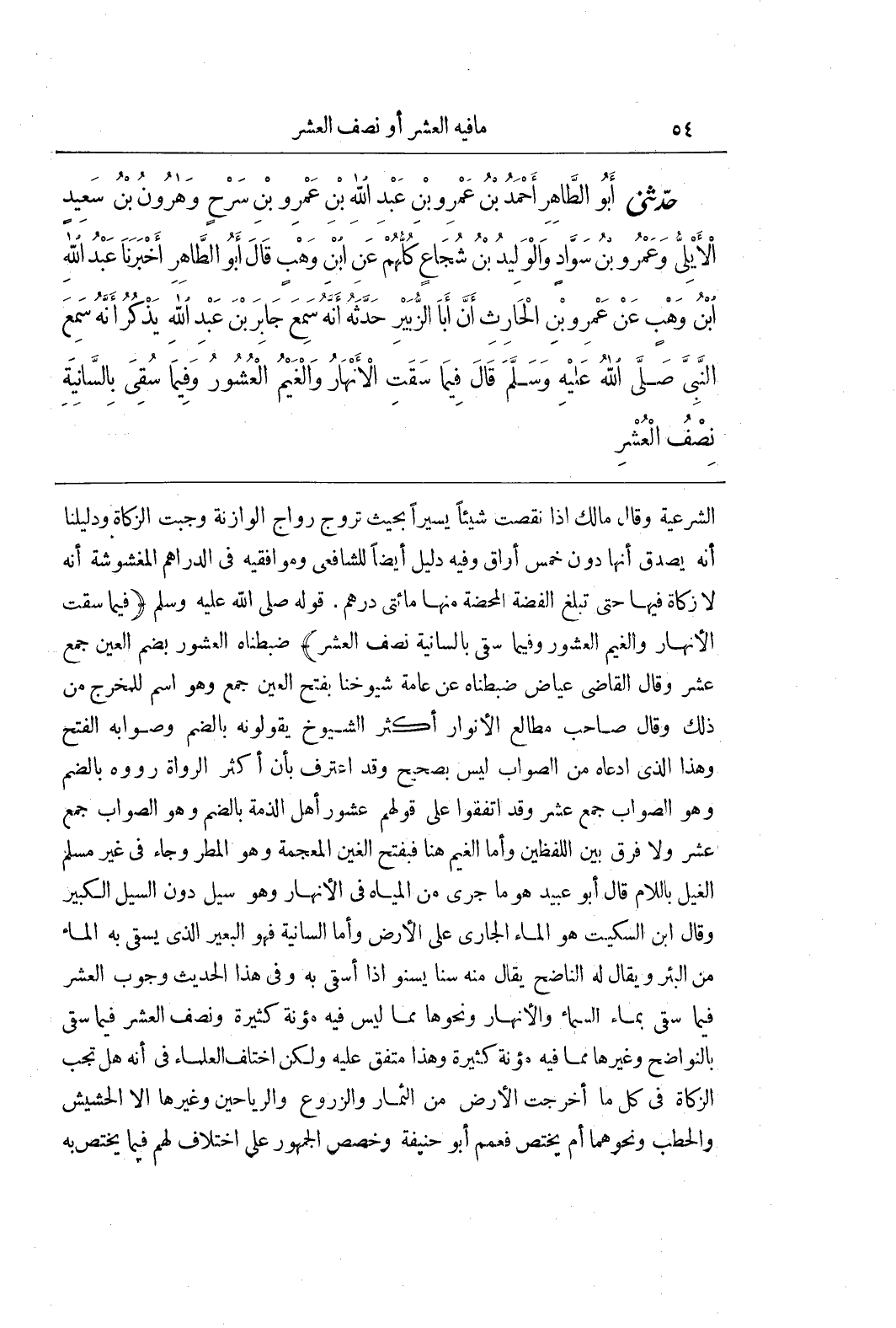 [981] قَوْلُهُ صَلَّى اللَّهُ عَلَيْهِ وَسَلَّمَ (فِيمَا سَقَتِ الْأَنْهَارُ وَالْغَيْمُ الْعُشُورُ وَفِيمَا سُقِيَ بِالسَّانِيَةِ نِصْفُ الْعُشْرِ) ضَبَطْنَاهُ الْعُشُورُ بِضَمِّ الْعَيْنِ جَمْعُ عُشْرٍ وَقَالَ الْقَاضِي عِيَاضٌ ضَبَطْنَاهُ عَنْ عَامَّةِ شُيُوخِنَا بِفَتْحِ الْعَيْنِ جَمْعٌ وَهُوَ اسْمٌ لِلْمُخْرَجِ مِنْ ذَلِكَ وَقَالَ صَاحِبُ مَطَالِعِ الْأَنْوَارِ أَكْثَرُ الشُّيُوخِ يَقُولُونَهُ بِالضَّمِّ وَصَوَابُهُ الْفَتْحُ وَهَذَا الَّذِي ادَّعَاهُ مِنَ الصَّوَابِ لَيْسَ بِصَحِيحٍ وَقَدِ اعْتَرَفَ بِأَنَّ أَكْثَرَ الرُّوَاةِ رَوَوْهُ بِالضَّمِّ وَهُوَ الصَّوَابُ جَمْعُ عُشْرٍ وَقَدِ اتَّفَقُوا عَلَى قَوْلِهِمْ عُشُورُ أَهْلُ الذِّمَّةِ بِالضَّمِّ وَهُوَ الصَّوَابُ جَمْعُ عُشْرٍ وَلَا فَرْقَ بَيْنَ اللَّفْظَيْنِ وَأَمَّا الْغَيْمُ هُنَا فَبِفَتْحِ الْغَيْنِ الْمُعْجَمَةِ وَهُوَ الْمَطَرُ وَجَاءَ فِي غَيْرِ مُسْلِمٍ الْغَيْلُ بِاللَّامِ قَالَ أَبُو عُبَيْدٍ هُوَ مَا جَرَى مِنَ الْمِيَاهِ فِي الْأَنْهَارِ وَهُوَ سيل دون السيل الكبير وقال بن السِّكِّيتِ هُوَ الْمَاءُ الْجَارِي عَلَى الْأَرْضِ وَأَمَّا السَّانِيَةُ فَهُوَ الْبَعِيرُ الَّذِي يُسْقَى بِهِ الْمَاءُ مِنَ الْبِئْرِ وَيُقَالُ لَهُ النَّاضِحُ يُقَالُ مِنْهُ سَنَا يَسْنُو إِذَا أُسْقِيَ بِهِ وَفِي هَذَا الْحَدِيثِ وُجُوبُ الْعُشْرِ فِيمَا سُقِيَ بِمَاءِ السَّمَاءِ وَالْأَنْهَارِ وَنَحْوِهَا مِمَّا لَيْسَ فِيهِ مُؤْنَةٌ كَثِيرَةٌ وَنِصْفُ الْعُشْرِ فِيمَا سُقِيَ بِالنَّوَاضِحِ وَغَيْرِهَا مِمَّا فِيهِ مُؤْنَةٌ كَثِيرَةٌ وَهَذَا مُتَّفَقٌ عَلَيْهِ وَلَكِنِ اخْتَلَفَ الْعُلَمَاءُ فِي أَنَّهُ هَلْ تَجِبُ الزَّكَاةُ فِي كُلِّ مَا أَخْرَجَتِ الْأَرْضُ مِنَ الثِّمَارِ وَالزُّرُوعِ وَالرَّيَاحِينِ وَغَيْرِهَا إِلَّا الْحَشِيشَ وَالْحَطَبَ وَنَحْوَهُمَا أَمْ يَخْتَصُّ فَعَمَّمَ أَبُو حَنِيفَةَ وَخَصَّصَ الْجُمْهُورُ عَلَى اخْتِلَافٍ لَهُمْ فِيمَا يَخْتَصُّ بِهِ