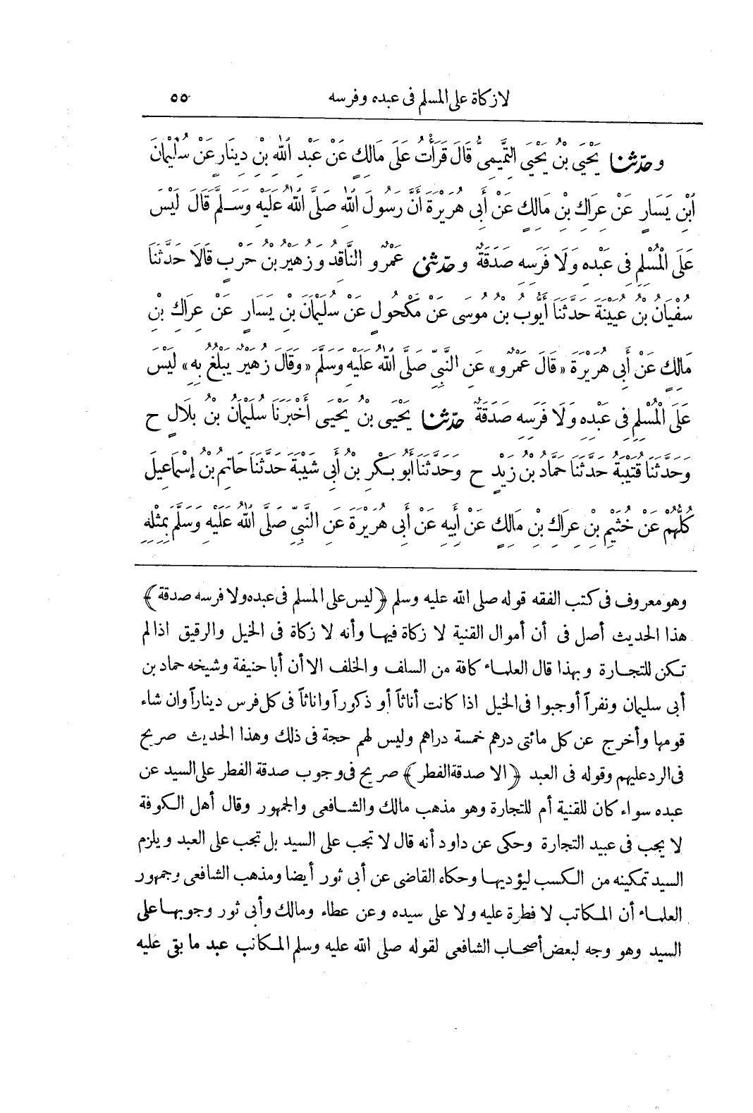 [982] قَوْلُهُ صَلَّى اللَّهُ عَلَيْهِ وَسَلَّمَ (لَيْسَ عَلَى الْمُسْلِمِ فِي عَبْدِهِ وَلَا فَرَسِهِ صَدَقَةٌ) هَذَا الْحَدِيثُ أَصْلٌ فِي أَنَّ أَمْوَالَ الْقِنْيَةِ لَا زَكَاةَ فِيهَا وَأَنَّهُ لَا زَكَاةَ فِي الْخَيْلِ وَالرَّقِيقِ إِذَا لَمْ تَكُنْ لِلتِّجَارَةِ وَبِهَذَا قَالَ الْعُلَمَاءُ كَافَّةً مِنَ السَّلَفِ وَالْخَلَفِ إِلَّا أَنَّ أَبَا حَنِيفَةَ وَشَيْخَهَ حَمَّادَ بْنَ أَبِي سُلَيْمَانَ وَنَفَرًا أَوْجَبُوا فِي الْخَيْلِ إِذَا كَانَتْ إِنَاثًا أو ذكورا واناثا فِي كُلِّ فَرَسٍ دِينَارًا وَإِنْ شَاءَ قَوَّمَهَا وَأَخْرَجَ عَنْ كُلِّ مِائَتَيْ دِرْهَمٍ خَمْسَةَ دَرَاهِمَ وَلَيْسَ لَهُمْ حُجَّةٌ فِي ذَلِكَ وَهَذَا الْحَدِيثُ صَرِيحٌ فِي الرَّدِّ عَلَيْهِمْ وَقَوْلُهُ فِي الْعَبْدِ (إِلَّا صَدَقَةُ الْفِطْرِ) صَرِيحٌ فِي وُجُوبِ صَدَقَةِ الْفِطْرِ عَلَى السَّيِّدِ عَنْ عَبْدِهِ سَوَاءً كَانَ لِلْقِنْيَةِ أَمْ لِلتِّجَارَةِ وَهُوَ مَذْهَبُ مَالِكٍ وَالشَّافِعِيِّ وَالْجُمْهُورِ وَقَالَ أَهْلُ الْكُوفَةِ لَا يَجِبُ فِي عَبِيدِ التِّجَارَةِ وَحُكِيَ عَنْ دَاوُدَ أَنَّهُ قَالَ لاتجب عَلَى السَّيِّدِ بَلْ تَجِبُ عَلَى الْعَبْدِ وَيَلْزَمُ السَّيِّدُ تَمْكِينَهُ مِنَ الْكَسْبِ لِيُؤَدِّيَهَا وَحَكَاهُ الْقَاضِي عَنْ أَبِي ثَوْرٍ أَيْضًا وَمَذْهَبُ الشَّافِعِيِّ وَجُمْهُورِ الْعُلَمَاءِ أَنَّ الْمُكَاتَبَ لَا فِطْرَةَ عَلَيْهِ وَلَا عَلَى سَيِّدِهِ وَعَنْ عَطَاءٍ وَمَالِكٍ وَأَبِي ثَوْرٍ وُجُوبُهَا عَلَى السَّيِّدِ وَهُوَ وَجْهٌ لِبَعْضِ أَصْحَابِ الشَّافِعِيِّ لِقَوْلِهِ صَلَّى اللَّهُ عَلَيْهِ وَسَلَّمَ الْمُكَاتَبُ عَبْدٌ مَا بَقِيَ عَلَيْهِ