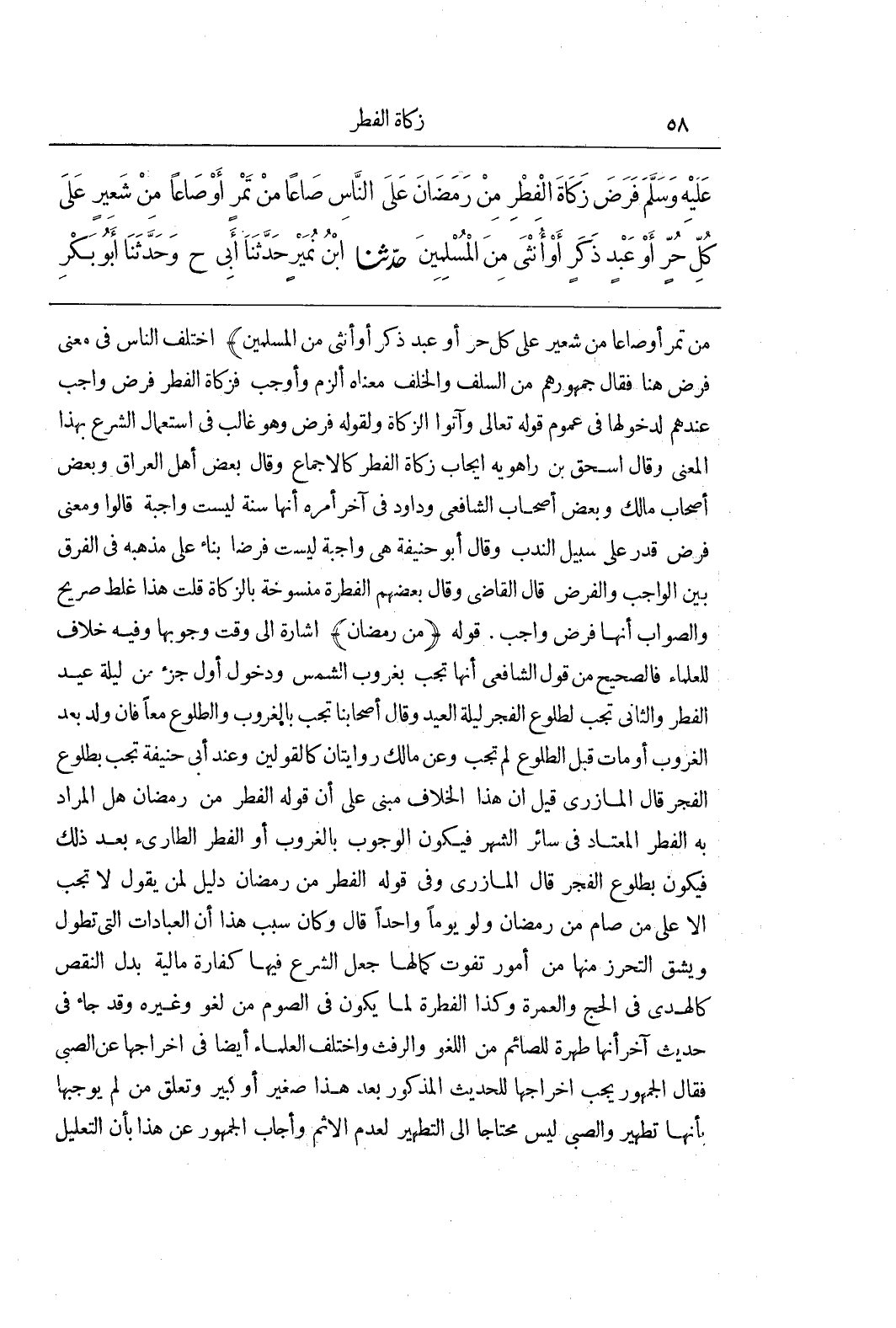 من تمر أوصاعا مِنْ شَعِيرٍ عَلَى كُلِّ حُرٍّ أَوْ عَبْدٍ ذَكَرٍ أَوْ أُنْثَى مِنَ الْمُسْلِمِينَ) اخْتَلَفَ النَّاسُ فِي مَعْنَى فَرَضَ هُنَا فَقَالَ جُمْهُورُهُمْ مِنَ السَّلَفِ وَالْخَلَفِ مَعْنَاهُ أَلْزَمَ وَأَوْجَبَ فَزَكَاةُ الْفِطْرِ فَرْضٌ وَاجِبٌ عِنْدَهُمْ لِدُخُولِهَا فِي عُمُومِ قَوْلِهِ تعالى وآتوا الزكاة وَلِقَوْلِهِ فَرَضَ وَهُوَ غَالِبٌ فِي اسْتِعْمَالِ الشَّرْعِ بِهَذَا الْمَعْنَى وَقَالَ إِسْحَاقُ بْنُ رَاهَوَيْهِ إِيجَابُ زَكَاةِ الْفِطْرِ كَالْإِجْمَاعِ وَقَالَ بَعْضُ أَهْلِ الْعِرَاقِ وَبَعْضُ أَصْحَابِ مَالِكٍ وَبَعْضُ أَصْحَابِ الشَّافِعِيِّ وَدَاوُدُ فِي آخِرِ أَمْرِهِ إِنَّهَا سُنَّةٌ لَيْسَتْ وَاجِبَةً قَالُوا وَمَعْنَى فَرَضَ قَدَّرَ عَلَى سَبِيلِ النَّدْبِ وَقَالَ أَبُو حَنِيفَةَ هِيَ وَاجِبَةٌ لَيْسَتْ فَرْضًا بِنَاءً عَلَى مَذْهَبِهِ فِي الْفَرْقِ بَيْنَ الْوَاجِبِ وَالْفَرْضِ قَالَ الْقَاضِي وَقَالَ بَعْضُهُمُ الْفِطْرَةُ مَنْسُوخَةٌ بِالزَّكَاةِ قُلْتُ هَذَا غَلَطٌ صَرِيحٌ وَالصَّوَابُ أَنَّهَا فَرْضُ وَاجِبٍ قَوْلُهُ (مِنْ رَمَضَانَ) إِشَارَةٌ إِلَى وَقْتِ وُجُوبِهَا وَفِيهِ خِلَافٌ لِلْعُلَمَاءِ فَالصَّحِيحُ مِنْ قَوْلِ الشَّافِعِيِّ أَنَّهَا تَجِبُ بِغُرُوبِ الشَّمْسِ وَدُخُولِ أَوَّلِ جُزْءٍ مِنْ لَيْلَةِ عِيدِ الْفِطْرِ وَالثَّانِي تَجِبُ لِطُلُوعِ الْفَجْرِ لَيْلَةَ الْعِيدِ وَقَالَ أَصْحَابُنَا تَجِبُ بِالْغُرُوبِ وَالطُّلُوعِ مَعًا فَإِنْ وُلِدَ بَعْدَ الْغُرُوبِ أَوْ مَاتَ قَبْلَ الطُّلُوعِ لَمْ تَجِبْ وَعَنْ مَالِكٍ رِوَايَتَانِ كَالْقَوْلَيْنِ وَعِنْدَ أَبِي حَنِيفَةَ تَجِبُ بِطُلُوعِ الْفَجْرِ قَالَ الْمَازِرِيُّ قِيلَ إِنَّ هَذَا الْخِلَافَ مَبْنِيٌّ عَلَى أَنَّ قَوْلَهُ الْفِطْرِ مِنْ رَمَضَانَ هَلِ الْمُرَادُ بِهِ الْفِطْرُ الْمُعْتَادُ فِي سَائِرِ الشَّهْرِ فَيَكُونُ الْوُجُوبُ بِالْغُرُوبِ أَوِ الْفِطْرُ الطَّارِئُ بَعْدَ ذَلِكَ فَيَكُونُ بِطُلُوعِ الْفَجْرِ قَالَ الْمَازِرِيُّ وَفِي قَوْلِهِ الْفِطْرُ مِنْ رَمَضَانَ دَلِيلٌ لِمَنْ يَقُولُ لَا تَجِبُ إِلَّا عَلَى مَنْ صَامَ مِنْ رَمَضَانَ وَلَوْ يَوْمًا وَاحِدًا قَالَ وَكَانَ سَبَبُ هَذَا أَنَّ الْعِبَادَاتِ الَّتِي تَطُولُ وَيَشُقُّ التَّحَرُّزُ مِنْهَا مِنْ أُمُورٍ تُفَوِّتُ كَمَالَهَا جَعَلَ الشَّرْعُ فِيهَا كَفَّارَةً مَالِيَّةً بَدَلَ النَّقْصِ كَالْهَدْيِ فِي الْحَجِّ وَالْعُمْرَةِ وَكَذَا الْفِطْرَةُ لِمَا يَكُونُ فِي الصَّوْمِ مِنْ لَغْوٍ وَغَيْرِهِ وَقَدْ جَاءَ فِي حَدِيثٍ آخَرَ أَنَّهَا طُهْرَةٌ لِلصَّائِمِ مِنَ اللَّغْوِ وَالرَّفَثِ وَاخْتَلَفَ الْعُلَمَاءُ أَيْضًا فِي إِخْرَاجِهَا عَنِ الصَّبِيِّ فَقَالَ الْجُمْهُورُ يَجِبُ إِخْرَاجُهَا لِلْحَدِيثِ الْمَذْكُورِ بَعْدَ هَذَا صَغِيرٍ أَوْ كبير وتعلق من لم يوجبها بأنها تَطْهِيرٌ وَالصَّبِيُّ لَيْسَ مُحْتَاجًا إِلَى التَّطْهِيرِ لِعَدَمِ الْإِثْمِ وَأَجَابَ الْجُمْهُورُ عَنْ هَذَا بِأَنَّ التَّعْلِيلَ