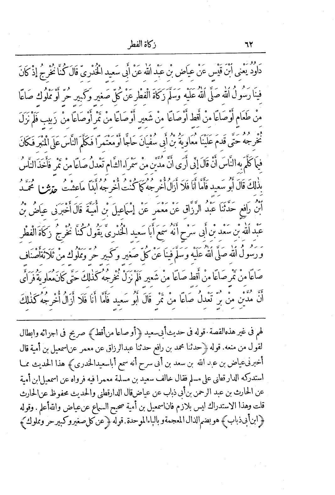 [985] قَوْلُهُ فِي حَدِيثِ أَبِي سَعِيدٍ (أَوْ صَاعًا مِنْ أَقِطٍ) صَرِيحٌ فِي إِجْزَائِهِ وَإِبْطَالٍ لِقَوْلِ مَنْ مَنَعَهُ قَوْلُهُ (حَدَّثَنَا مُحَمَّدُ بْنُ رَافِعٍ حَدَّثَنَا عَبْدُ الرَّزَّاقِ عَنْ مَعْمَرٍ عَنْ إِسْمَاعِيلَ بْنِ أُمَيَّةَ قَالَ أَخْبَرَنِي عِيَاضُ بْنُ عَبْدِ اللَّهِ بْنِ سَعْدِ بْنِ أَبِي سَرْحٍ أَنَّهُ سَمِعَ أَبَا سَعِيدٍ الْخُدْرِيَّ) هَذَا الْحَدِيثُ مِمَّا اسْتَدْرَكَهُ الدَّارَقُطْنِيُّ عَلَى مُسْلِمٍ فَقَالَ خَالَفَ سَعِيدُ بْنُ مَسْلَمَةَ مَعْمَرًا فِيهِ فَرَوَاهُ عَنْ إِسْمَاعِيلَ بْنِ أُمَيَّةَ عَنِ الْحَارِثِ بْنِ عَبْدِ الرَّحْمَنِ بْنِ أَبِي ذُبَابٍ عَنْ عِيَاضٍ قَالَ الدَّارَقُطْنِيُّ وَالْحَدِيثُ مَحْفُوظٌ عَنِ الْحَارِثِ قُلْتُ وَهَذَا الِاسْتِدْرَاكُ لَيْسَ بِلَازِمٍ فَإِنَّ إِسْمَاعِيلَ بْنَ أُمَيَّةَ صَحِيحُ السَّمَاعِ عَنْ عياض والله أعلم وقوله (بن أَبِي ذُبَابٍ) هُوَ بِضَمِّ الذَّالِ الْمُعْجَمَةِ وَبِالْبَاءِ الموحدة قوله (عَنْ كُلِّ صَغِيرٍ وَكَبِيرٍ حُرٍّ وَمَمْلُوكٍ