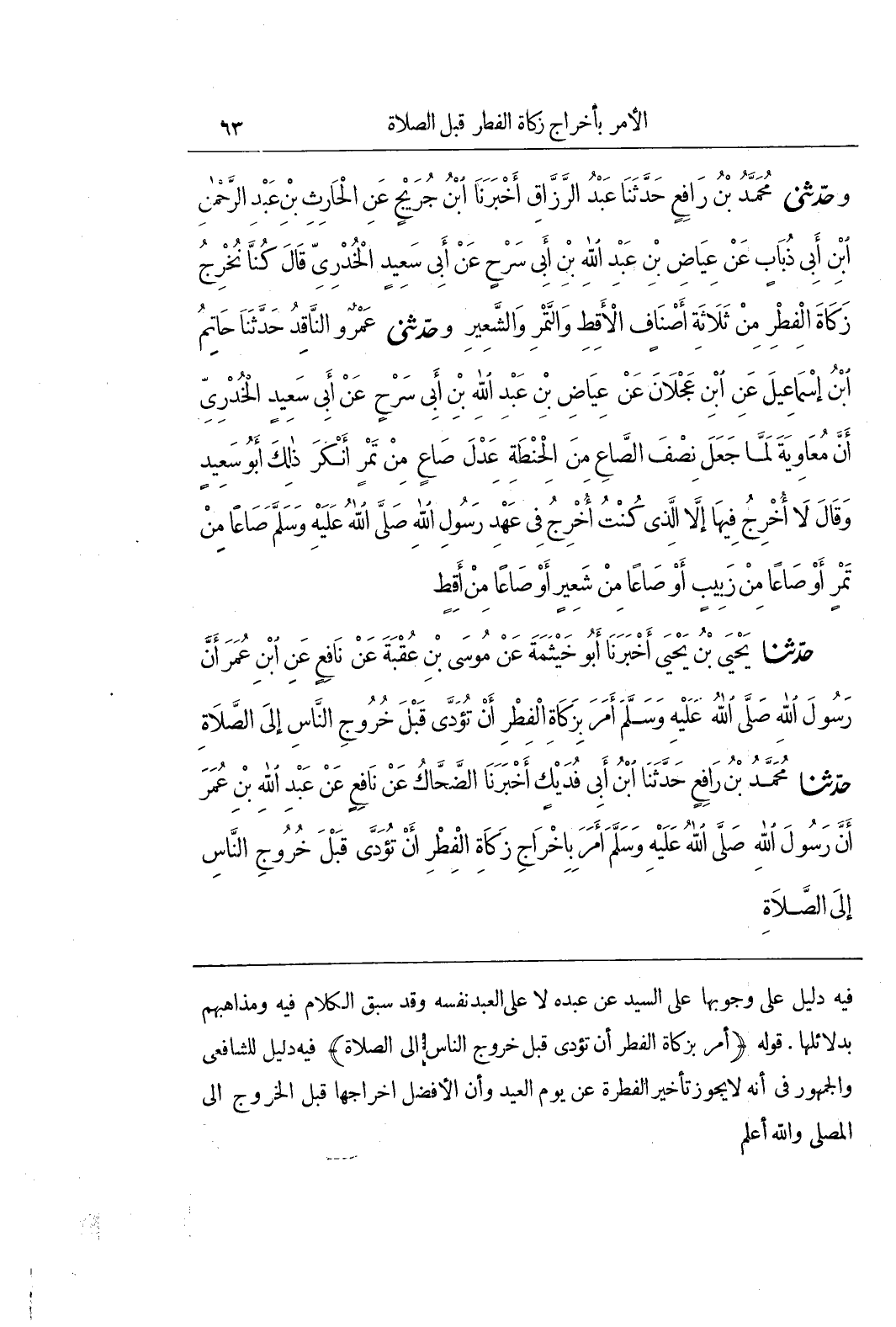 [986] قَوْلُهُ (أَمَرَ بِزَكَاةِ الْفِطْرِ أَنْ تُؤَدَّى قَبْلَ خُرُوجَ النَّاسِ إِلَى الصَّلَاةِ) فِيهِ دَلِيلٌ لِلشَّافِعِيِّ وَالْجُمْهُورِ فِي أَنَّهُ لَا يَجُوزُ تَأْخِيرُ الْفِطْرَةِ عَنْ يَوْمِ الْعِيدِ وَأَنَّ الْأَفْضَلَ إِخْرَاجُهَا قَبْلَ الخروج إلى المصلى والله أعلم