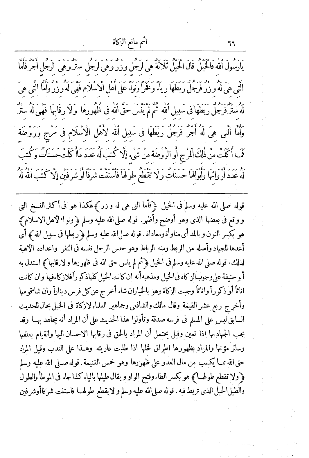 قَوْلُهُ صَلَّى اللَّهُ عَلَيْهِ وَسَلَّمَ فِي الْخَيْلِ (فَأَمَّا الَّتِي هِيَ لَهُ وِزْرٌ) هَكَذَا هُوَ فِي أَكْثَرِ النُّسَخِ الَّتِي وَوَقَعَ فِي بَعْضِهَا الَّذِي وَهُوَ أَوْضَحُ وَأَظْهَرُ قَوْلُهُ صَلَّى اللَّهُ عَلَيْهِ وَسَلَّمَ (وَنِوَاءً لِأَهْلِ الْإِسْلَامِ) هُوَ بِكَسْرِ النُّونِ وَبِالْمَدِّ أَيْ مُنَاوَأَةً وَمُعَادَاةً قَوْلُهُ صَلَّى اللَّهُ عَلَيْهِ وَسَلَّمَ (رَبَطَهَا فِي سَبِيلِ اللَّهِ) أَيْ أَعَدَّهَا لِلْجِهَادِ وَأَصْلُهُ مِنَ الرَّبْطِ وَمِنْهُ الرِّبَاطُ وَهُوَ حَبْسُ الرَّجُلِ نَفْسَهُ فِي الثَّغْرِ وَإِعْدَادُهُ الْأُهْبَةَ لِذَلِكَ قَوْلُهُ صَلَّى اللَّهُ عَلَيْهِ وَسَلَّمَ فِي الْخَيْلِ (ثُمَّ لَمْ يَنْسَ حَقَّ اللَّهِ فِي ظُهُورِهَا وَلَا رِقَابِهَا) اسْتَدَلَّ بِهِ أَبُو حَنِيفَةَ عَلَى وُجُوبِ الزَّكَاةِ فِي الْخَيْلِ وَمَذْهَبُهُ أَنَّهُ إِنْ كَانَتِ الْخَيْلُ كُلُّهَا ذُكُورًا فَلَا زَكَاةَ فِيهَا وَإِنْ كَانَتْ إِنَاثًا أَوْ ذكورا واناثا وجبت الزكاة وهو بالخياران شَاءَ أَخْرَجَ عَنْ كُلِّ فَرَسٍ دِينَارًا وَإِنْ شَاءَ قَوَّمَهَا وَأَخْرَجَ رُبُعَ عُشْرِ الْقِيمَةِ وَقَالَ مَالِكٌ وَالشَّافِعِيُّ وَجَمَاهِيرُ الْعُلَمَاءِ لَا زَكَاةَ فِي الْخَيْلِ بِحَالٍ لِلْحَدِيثِ السَّابِقِ لَيْسَ عَلَى الْمُسْلِمِ فِي فَرَسِهِ صَدَقَةٌ وَتَأَوَّلُوا هَذَا الْحَدِيثَ عَلَى أَنَّ الْمُرَادَ أَنَّهُ يُجَاهِدُ بِهَا وَقَدْ يَجِبُ الْجِهَادُ بِهَا إِذَا تَعَيَّنَ وَقِيلَ يُحْتَمَلُ أَنَّ الْمُرَادَ بِالْحَقِّ فِي رِقَابِهَا الْإِحْسَانُ إِلَيْهَا وَالْقِيَامُ بِعَلْفِهَا وَسَائِرِ مُؤَنِهَا وَالْمُرَادُ بِظُهُورِهَا إِطْرَاقُ فَحْلِهَا إِذَا طُلِبَتْ عَارِيَتُهُ وَهَذَا عَلَى النَّدْبِ وَقِيلَ الْمُرَادُ حَقُّ اللَّهِ مِمَّا يُكْسَبُ مِنْ مَالِ الْعَدُوِّ عَلَى ظُهُورِهَا وَهُوَ خُمُسُ الْغَنِيمَةِ قَوْلُهُ صَلَّى اللَّهُ عَلَيْهِ وَسَلَّمَ (وَلَا تَقْطَعُ طِوَلَهَا) هُوَ بِكَسْرِ الطَّاءِ وَفَتْحِ الْوَاوِ وَيُقَالُ طِيلُهَا بِالْيَاءِ كَذَا جَاءَ فِي الْمُوَطَّأِ وَالطِّوَلُ وَالطِّيلُ الْحَبْلُ الَّذِي تُرْبَطُ فِيهِ قَوْلُهُ صَلَّى اللَّهُ عليه وسلم ولا يقطع طِوَلَهَا فَاسْتَنَّتْ شَرَفًا أَوْ شَرَفَيْنِ