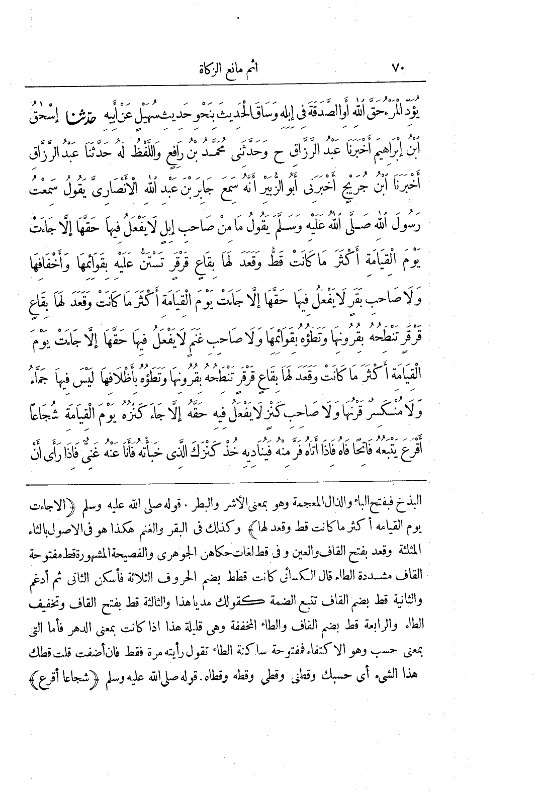 [988] قَوْلُهُ صَلَّى اللَّهُ عَلَيْهِ وَسَلَّمَ (إِلَّا جَاءَتْ يَوْمَ الْقِيَامَةِ أَكْثَرَ مَا كَانَتْ قَطُّ وَقَعَدَ لَهَا) وَكَذَلِكَ فِي الْبَقَرِ وَالْغَنَمِ هَكَذَا هُوَ فِي الْأُصُولِ بِالثَّاءِ الْمُثَلَّثَةِ وَقَعَدَ بِفَتْحِ الْقَافِ وَالْعَيْنِ وَفِي قَطُّ لُغَاتٌ حَكَاهُنَّ الْجَوْهَرِيُّ وَالْفَصِيحَةُ الْمَشْهُورَةُ قَطُّ مَفْتُوحَةُ الْقَافِ مُشَدَّدَةُ الطَّاءِ قَالَ الْكِسَائِيُّ كَانَتْ قُطُطُ بِضَمِّ الْحُرُوفِ الثَّلَاثَةِ فَأُسْكِنَ الثَّانِي ثُمَّ أُدْغِمَ وَالثَّانِيَةُ قُطُّ بِضَمِّ الْقَافِ تَتْبَعُ الضَّمَّةَ كَقَوْلِكَ مُدَّ يَا هَذَا وَالثَّالِثَةُ قَطْ بِفَتْحِ الْقَافِ وَتَخْفِيفِ الطَّاءِ وَالرَّابِعَةُ قُطُ بِضَمِّ الْقَافِ وَالطَّاءِ الْمُخَفَّفَةِ وَهِيَ قَلِيلَةٌ هَذَا إِذَا كَانَتْ بِمَعْنَى الدَّهْرِ فَأَمَّا الَّتِي بِمَعْنَى حَسْبُ وَهُوَ الِاكْتِفَاءُ فَمَفْتُوحَةٌ سَاكِنَةُ الطَّاءِ تَقُولُ رَأَيْتُهُ مَرَّةً فَقَطْ فَإِنْ أَضَفْتَ قُلْتَ قَطْكَ هَذَا الشَّيْءُ أَيْ حَسْبُكَ وَقَطْنِي وقطى وقطه وقطاه قَوْلُهُ صَلَّى اللَّهُ عَلَيْهِ وَسَلَّمَ (شُجَاعًا أَقْرَعَ