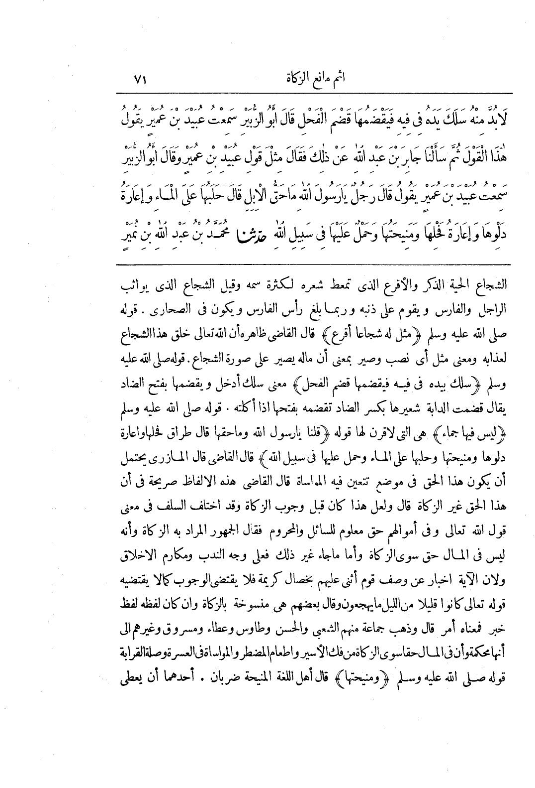 الشُّجَاعُ الْحَيَّةُ الذَّكَرُ وَالْأَقْرَعُ الَّذِي تَمَعَّطَ شَعْرُهُ لِكَثْرَةِ سُمِّهِ وَقِيلَ الشُّجَاعُ الَّذِي يُوَاثِبُ الرَّاجِلَ وَالْفَارِسَ وَيَقُومُ عَلَى ذَنَبِهِ وَرُبَّمَا بَلَغَ رَأْسَ الْفَارِسِ وَيَكُونُ فِي الصَّحَارِي قَوْلُهُ صَلَّى اللَّهُ عَلَيْهِ وَسَلَّمَ (مُثِّلَ لَهُ شُجَاعًا أَقْرَعَ) قَالَ الْقَاضِي ظَاهِرُهُ أَنَّ اللَّهَ تَعَالَى خَلَقَ هَذَا الشُّجَاعَ لِعَذَابِهِ وَمَعْنَى مُثِّلَ أَيْ نُصِّبَ وَصُيِّرَ بِمَعْنَى أَنَّ مَالَهُ يَصِيرُ عَلَى صُورَةِ الشُّجَاعِ قَوْلُهُ صَلَّى اللَّهُ عَلَيْهِ وَسَلَّمَ (سَلَكَ بِيَدِهِ فِي فِيهِ فَيَقْضِمُهَا قَضْمَ الْفَحْلِ) مَعْنَى سَلَكَ أَدْخَلَ وَيَقْضِمُهَا بِفَتْحِ الضَّادِ يُقَالُ قَضِمَتِ الدَّابَّةُ شَعِيرَهَا بِكَسْرِ الضَّادِ تَقْضَمُهُ بِفَتْحِهَا إِذَا أَكَلَتْهُ قَوْلُهُ صَلَّى اللَّهُ عَلَيْهِ وَسَلَّمَ (لَيْسَ فِيهَا جَمَّاءُ) هِيَ الَّتِي لَا قَرْنَ لَهَا قَوْلُهُ (قُلْنَا يَا رَسُولَ اللَّهِ وَمَا حَقُّهَا قَالَ طراق فَحْلِهَا وَإِعَارَةُ دَلْوِهَا وَمَنِيحَتُهَا وَحَلَبُهَا عَلَى الْمَاءِ وَحَمْلٌ عَلَيْهَا فِي سَبِيلِ اللَّهِ) قَالَ الْقَاضِي قَالَ الْمَازِرِيُّ يَحْتَمِلُ أَنْ يَكُونَ هَذَا الْحَقُّ فِي مَوْضِعٍ تَتَعَيَّنُ فِيهِ الْمُوَاسَاةُ قَالَ الْقَاضِي هَذِهِ الْأَلْفَاظُ صَرِيحَةٌ فِي أَنَّ هَذَا الْحَقَّ غَيْرُ الزَّكَاةِ قَالَ وَلَعَلَّ هَذَا كَانَ قَبْلَ وُجُوبِ الزَّكَاةِ وَقَدِ اخْتَلَفَ السَّلَفُ فِي مَعْنَى قول الله تعالى وفي أموالهم حق معلوم للسائل والمحروم فَقَالَ الْجُمْهُورُ الْمُرَادُ بِهِ الزَّكَاةُ وَأَنَّهُ لَيْسَ فِي الْمَالِ حَقٌّ سِوَى الزَّكَاةِ وَأَمَّا مَا جَاءَ غَيْرَ ذَلِكَ فَعَلَى وَجْهِ النَّدْبِ وَمَكَارِمِ الْأَخْلَاقِ وَلِأَنَّ الْآيَةَ إِخْبَارٌ عَنْ وَصْفِ قَوْمٍ أَثْنَى عَلَيْهِمْ بِخِصَالٍ كَرِيمَةٍ فَلَا يَقْتَضِي الْوُجُوبَ كَمَا لَا يَقْتَضِيهِ قَوْلُهُ تَعَالَى كَانُوا قَلِيلًا من الليل ما يهجعون وَقَالَ بَعْضُهُمْ هِيَ مَنْسُوخَةٌ بِالزَّكَاةِ وَإِنْ كَانَ لَفْظُهُ لَفْظَ خَبَرٍ فَمَعْنَاهُ أَمْرٌ قَالَ وَذَهَبَ جَمَاعَةٌ مِنْهُمُ الشَّعْبِيُّ وَالْحَسَنُ وَطَاوُسٌ وَعَطَاءٌ وَمَسْرُوقٌ وَغَيْرُهُمْ إِلَى أَنَّهَا مُحْكَمَةٌ وَأَنَّ فِي الْمَالِ حَقًّا سِوَى الزَّكَاةِ مِنْ فَكِّ الْأَسِيرِ وَإِطْعَامِ الْمُضْطَرِّ وَالْمُوَاسَاةِ فِي الْعُسْرَةِ وَصِلَةِ الْقَرَابَةِ قَوْلُهُ صَلَّى اللَّهُ عَلَيْهِ وَسَلَّمَ (وَمَنِيحَتُهَا) قَالَ أَهْلُ اللُّغَةِ الْمَنِيحَةُ ضَرْبَانِ أَحَدُهُمَا أَنْ يُعْطِيَ