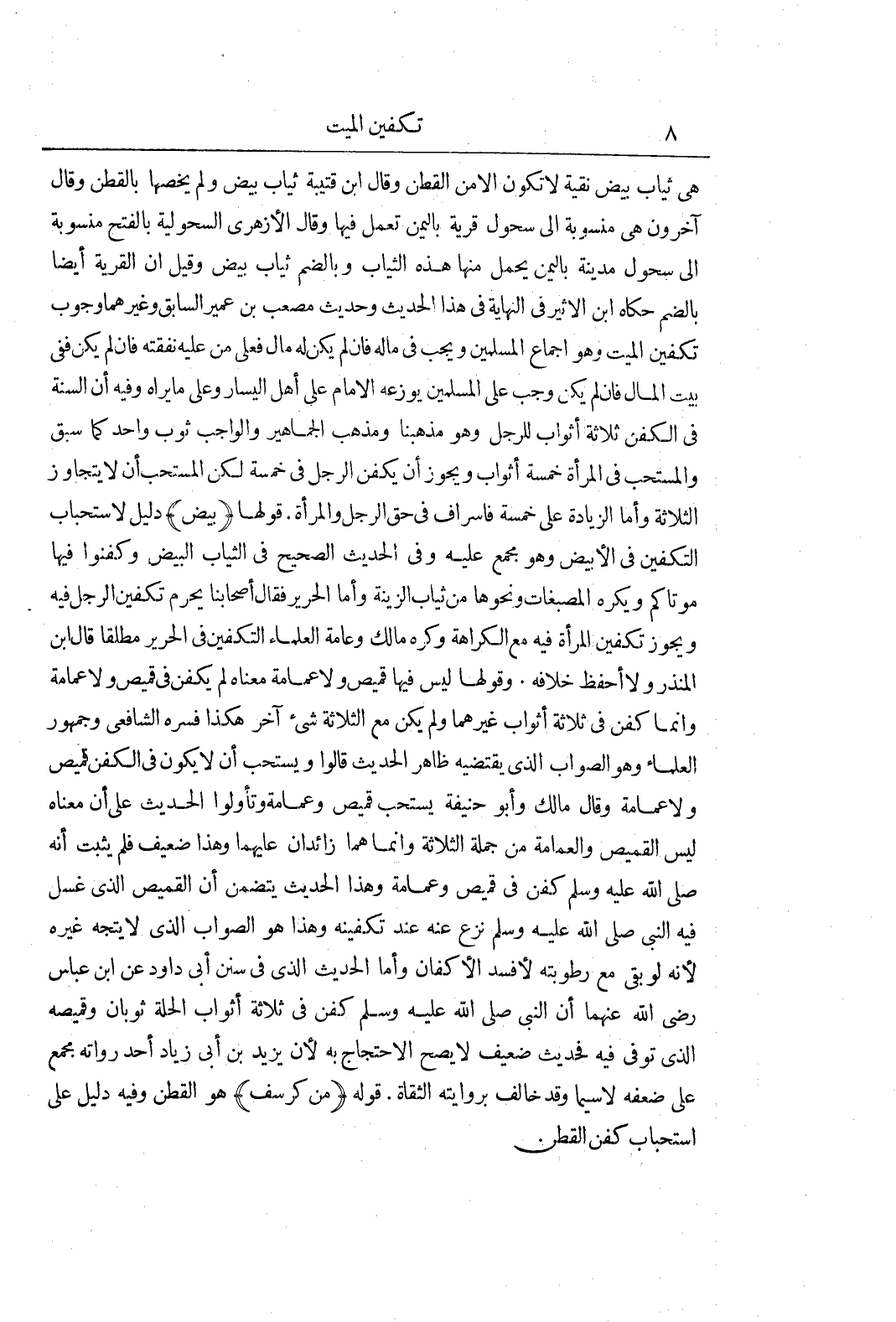 هِيَ ثِيَابٌ بِيضٌ نَقِيَّةٌ لَا تَكُونُ إِلَّا من القطن وقال بن قُتَيْبَةَ ثِيَابٌ بِيضٌ وَلَمْ يَخُصَّهَا بِالْقُطْنِ وَقَالَ آخَرُونَ هِيَ مَنْسُوبَةٌ إِلَى سَحُولَ قَرْيَةٍ بِالْيَمَنِ تُعْمَلُ فِيهَا وَقَالَ الْأَزْهَرِيُّ السَّحُولِيَّةُ بِالْفَتْحِ مَنْسُوبَةٌ إِلَى سَحُولَ مَدِينَةٌ بِالْيَمَنِ يُحْمَلُ مِنْهَا هَذِهِ الثِّيَابُ وَبِالضَّمِّ ثِيَابٌ بِيضٌ وَقِيلَ إِنَّ الْقَرْيَةَ ايضا بالضم حكاه بن الْأَثِيرِ فِي النِّهَايَةِ فِي هَذَا الْحَدِيثِ وَحَدِيثِ مُصْعَبِ بْنِ عُمَيْرٍ السَّابِقِ وَغَيْرِهِمَا وُجُوبُ تَكْفِينِ الْمَيِّتِ وَهُوَ إِجْمَاعُ الْمُسْلِمِينَ وَيَجِبُ فِي مَالِهِ فَإِنْ لَمْ يَكُنْ لَهُ مَالٌ فَعَلَى مَنْ عَلَيْهِ نَفَقَتُهُ فَإِنْ لَمْ يَكُنْ فَفِي بَيْتِ الْمَالِ فَإِنْ لَمْ يَكُنْ وَجَبَ عَلَى الْمُسْلِمِينَ يُوَزِّعُهُ الْإِمَامُ عَلَى أَهْلِ الْيَسَارِ وَعَلَى مَا يَرَاهُ وَفِيهِ أَنَّ السُّنَّةَ فِي الْكَفَنِ ثَلَاثَةُ أَثْوَابٍ لِلرَّجُلِ وَهُوَ مَذْهَبُنَا وَمَذْهَبُ الْجَمَاهِيرِ وَالْوَاجِبُ ثَوْبٌ وَاحِدٌ كَمَا سَبَقَ وَالْمُسْتَحَبُّ فِي الْمَرْأَةِ خَمْسَةٌ أَثْوَابٌ وَيَجُوزُ أَنْ يُكَفَّنَ الرَّجُلُ فِي خَمْسَةٍ لَكِنَّ الْمُسْتَحَبَّ أَنْ لَا يَتَجَاوَزَ الثَّلَاثَةَ وَأَمَّا الزِّيَادَةُ عَلَى خَمْسَةٍ فَإِسْرَافٌ فِي حَقِّ الرَّجُلِ وَالْمَرْأَةِ قَوْلُهَا (بِيضٌ) دَلِيلٌ لِاسْتِحْبَابِ التَّكْفِينِ فِي الْأَبْيَضِ وَهُوَ مُجْمَعٌ عَلَيْهِ وَفِي الْحَدِيثِ الصَّحِيحِ فِي الثِّيَابِ الْبِيضِ وَكَفِّنُوا فِيهَا مَوْتَاكُمْ وَيُكْرَهُ الْمُصْبَغَاتُ وَنَحْوُهَا مِنْ ثِيَابِ الزِّينَةِ وَأَمَّا الْحَرِيرُ فَقَالَ أَصْحَابُنَا يَحْرُمُ تَكْفِينُ الرَّجُلِ فِيهِ وَيَجُوزُ تَكْفِينُ الْمَرْأَةِ فِيهِ مَعَ الْكَرَاهَةِ وَكَرِهَ مَالِكٌ وَعَامَّةُ الْعُلَمَاءِ التَّكْفِينَ فِي الْحَرِيرِ مُطْلَقًا قال بن الْمُنْذِرِ وَلَا أَحْفَظُ خِلَافَهُ وَقَوْلُهَا لَيْسَ فِيهَا قَمِيصٌ وَلَا عِمَامَةٌ مَعْنَاهُ لَمْ يُكَفَّنْ فِي قميص ولاعمامة وَإِنَّمَا كُفِّنَ فِي ثَلَاثَةِ أَثْوَابٍ غَيْرِهِمَا وَلَمْ يَكُنْ مَعَ الثَّلَاثَةِ شَيْءٌ آخَرُ هَكَذَا فَسَّرَهُ الشَّافِعِيُّ وَجُمْهُورُ الْعُلَمَاءِ وَهُوَ الصَّوَابُ الَّذِي يَقْتَضِيهِ ظَاهِرُ الْحَدِيثِ قَالُوا وَيُسْتَحَبُّ أَنْ لَا يَكُونَ فِي الْكَفَنِ قَمِيصٌ وَلَا عِمَامَةٌ وَقَالَ مَالِكٌ وَأَبُو حَنِيفَةَ يُسْتَحَبُّ قَمِيصٌ وَعِمَامَةٌ وَتَأَوَّلُوا الْحَدِيثَ عَلَى أَنَّ مَعْنَاهُ لَيْسَ الْقَمِيصُ وَالْعِمَامَةُ مِنْ جُمْلَةِ الثَّلَاثَةِ وَإِنَّمَا هُمَا زَائِدَانِ عَلَيْهِمَا وَهَذَا ضَعِيفٌ فَلَمْ يَثْبُتْ أَنَّهُ صَلَّى اللَّهُ عَلَيْهِ وَسَلَّمَ كُفِّنَ فِي قَمِيصٍ وَعِمَامَةٍ وَهَذَا الْحَدِيثُ يَتَضَمَّنُ أَنَّ الْقَمِيصَ الَّذِي غُسِّلَ فِيهِ النَّبِيُّ صَلَّى اللَّهُ عَلَيْهِ وَسَلَّمَ نُزِعَ عَنْهُ عِنْدَ تَكْفِينِهِ وَهَذَا هُوَ الصَّوَابُ الَّذِي لَا يُتَّجَهُ غَيْرُهُ لِأَنَّهُ لَوْ بَقِيَ مَعَ رُطُوبَتِهِ لَأَفْسَدَ الْأَكْفَانَ وَأَمَّا الْحَدِيثُ الَّذِي فِي سُنَنِ أَبِي داود عن بن عَبَّاسٍ رَضِيَ اللَّهُ عَنْهُمَا أَنَّ النَّبِيَّ صَلَّى اللَّهُ عَلَيْهِ وَسَلَّمَ كُفِّنَ فِي ثَلَاثَةِ أَثْوَابٍ الْحُلَّةُ ثَوْبَانِ وَقَمِيصُهُ الَّذِي تُوُفِّيَ فِيهِ فَحَدِيثٌ ضَعِيفٌ لَا يَصِحُّ الِاحْتِجَاجُ بِهِ لِأَنَّ يَزِيدَ بْنَ أَبِي زِيَادٍ أَحَدُ رُوَاتِهِ مُجْمَعٌ عَلَى ضعفه لا سيما وقد خالف بروايته الثقاة قَوْلُهُ (مِنْ كُرْسُفٍ) هُوَ الْقُطْنُ وَفِيهِ دَلِيلٌ عَلَى اسْتِحْبَابِ كَفَنِ الْقُطْنِ