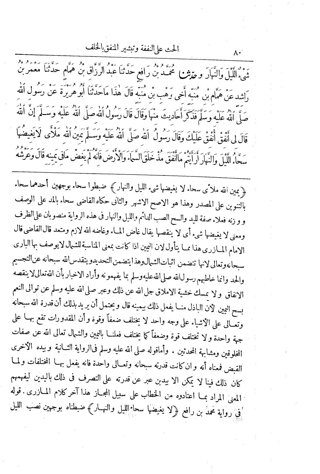 (يَمِينُ اللَّهِ مَلْأَى سَحَّاءُ لَا يَغِيضُهَا شَيْءٌ اللَّيْلَ وَالنَّهَارَ) ضَبَطُوا سَحَّاءُ بِوَجْهَيْنِ أَحَدُهُمَا سَحَّاءٌ بِالتَّنْوِينِ عَلَى الْمَصْدَرِ وَهَذَا هُوَ الْأَصَحُّ الْأَشْهُرُ وَالثَّانِي حَكَاهُ الْقَاضِي سَحَّاءُ بِالْمَدِّ عَلَى الْوَصْفِ وَوَزْنُهُ فَعَلَاءُ صِفَةٌ لِلْيَدِ وَالسَّحُّ الصَّبُّ الدَّائِمُ وَاللَّيْلَ وَالنَّهَارَ فِي هَذِهِ الرِّوَايَةِ مَنْصُوبَانِ عَلَى الظَّرْفِ وَمَعْنَى لَا يَغِيضُهَا شَيْءٌ أَيْ لَا يَنْقُصُهَا يُقَالُ غَاضَ الْمَاءُ وَغَاضَهُ اللَّهُ لَازِمٌ ومعتد قَالَ الْقَاضِي قَالَ الْإِمَامُ الْمَازِرِيُّ هَذَا مِمَّا يُتَأَوَّلُ لِأَنَّ الْيَمِينَ إِذَا كَانَتْ بِمَعْنَى الْمُنَاسِبَةِ لِلشِّمَالِ لَا يُوصَفُ بِهَا الْبَارِي سُبْحَانَهُ وَتَعَالَى لِأَنَّهَا تَتَضَمَّنُ إِثْبَاتَ الشِّمَالِ وَهَذَا يَتَضَمَّنُ التَّحْدِيدَ وَيَتَقَدَّسُ اللَّهُ سُبْحَانَهُ عَنِ التَّجْسِيمِ وَالْحَدِّ وَإِنَّمَا خَاطَبَهُمْ رَسُولُ اللَّهِ صَلَّى اللَّهُ عَلَيْهِ وَسَلَّمَ بِمَا يَفْهَمُونَهُ وَأَرَادَ الْإِخْبَارَ بِأَنَّ اللَّهَ تَعَالَى لَا يَنْقُصُهُ الْإِنْفَاقُ وَلَا يُمْسِكُ خَشْيَةَ الْإِمْلَاقِ جَلَّ اللَّهُ عَنْ ذَلِكَ وَعَبَّرَ صَلَّى اللَّهُ عَلَيْهِ وَسَلَّمَ عَنْ تَوَالِي النِّعَمِ بِسَحِّ الْيَمِينِ لِأَنَّ الْبَاذِلَ مِنَّا يَفْعَلُ ذَلِكَ بِيَمِينِهِ قَالَ وَيَحْتَمِلُ أَنْ يُرِيدَ بِذَلِكَ أَنَّ قُدْرَةَ اللَّهِ سُبْحَانَهُ وَتَعَالَى عَلَى الْأَشْيَاءِ عَلَى وَجْهٍ وَاحِدٍ لَا يَخْتَلِفُ ضَعْفًا وَقُوَّةً وَأَنَّ الْمَقْدُورَاتِ تَقَعُ بِهَا عَلَى جِهَةٍ وَاحِدَةٍ وَلَا تَخْتَلِفُ قُوَّةً وَضَعْفًا كَمَا يَخْتَلِفُ فِعْلُنَا بِالْيَمِينِ وَالشِّمَالِ تَعَالَى اللَّهُ عَنْ صِفَاتِ الْمَخْلُوقِينَ وَمُشَابَهَةِ الْمُحْدَثِينَ وَأَمَّا قَوْلُهُ صَلَّى اللَّهُ عَلَيْهِ وَسَلَّمَ فِي الرواية الثَّانِيَةِ وَبِيَدِهِ الْأُخْرَى الْقَبْضُ فَمَعْنَاهُ أَنَّهُ وَإِنْ كَانَتْ قُدْرَتُهُ سُبْحَانَهُ وَتَعَالَى وَاحِدَةً فَإِنَّهُ يَفْعَلُ بِهَا الْمُخْتَلِفَاتِ وَلَمَّا كَانَ ذَلِكَ فِينَا لَا يُمْكِنُ إِلَّا بِيَدَيْنِ عَبَّرَ عَنْ قُدْرَتِهِ عَلَى التَّصَرُّفِ فِي ذَلِكَ بِالْيَدَيْنِ لِيُفْهِمَهُمُ الْمَعْنَى الْمُرَادَ بِمَا اعْتَادُوهُ مِنَ الْخِطَابِ عَلَى سَبِيلِ الْمَجَازِ هَذَا آخِرُ كَلَامِ الْمَازِرِيِّ قَوْلُهُ فِي رِوَايَةِ مُحَمَّدِ بْنِ رَافِعٍ (لَا يَغِيضُهَا سَحَّاءُ اللَّيْلَ وَالنَّهَارَ) ضَبَطْنَاهُ بِوَجْهَيْنِ نَصْبُ اللَّيْلِ