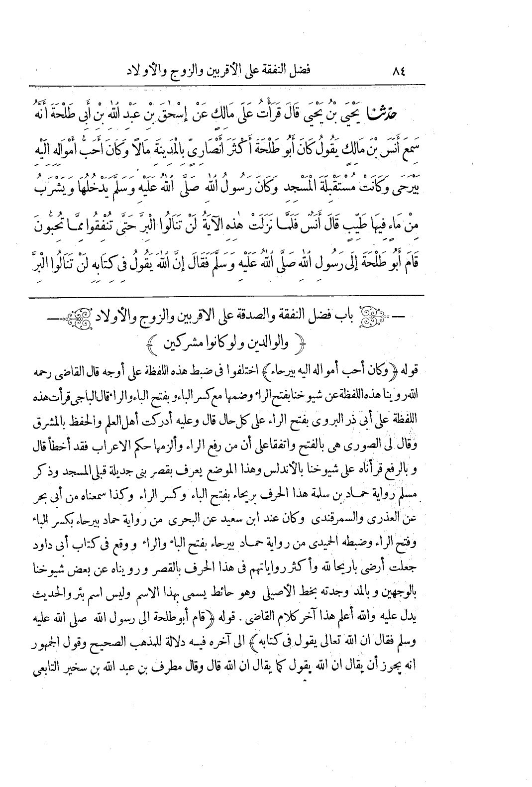 [998] قَوْلُهُ (وَكَانَ أَحَبَّ أَمْوَالِهِ إِلَيْهِ بَيْرُحَاءُ) اخْتَلَفُوا فِي ضَبْطِ هَذِهِ اللَّفْظَةِ عَلَى أَوْجُهٍ قَالَ الْقَاضِي رَحِمَهُ اللَّهُ رُوِّينَا هَذِهِ اللَّفْظَةُ عَنْ شُيُوخِنَا بِفَتْحِ الرَّاءِ وَضَمِّهَا مَعَ كَسْرِ الْبَاءِ وَبِفَتْحِ الْبَاءِ وَالرَّاءِ قَالَ الْبَاجِيُّ قَرَأْتُ هَذِهِ اللَّفْظَةَ عَلَى أَبِي ذَرٍّ الْبَرَوِيِّ بِفَتْحِ الرَّاءِ عَلَى كُلِّ حَالٍ قَالَ وَعَلَيْهِ أَدْرَكْتُ أَهْلَ الْعِلْمِ وَالْحِفْظِ بِالْمَشْرِقِ وَقَالَ لِي الصُّورِيُّ هِيَ بِالْفَتْحِ وَاتَّفَقَا عَلَى أَنَّ مَنْ رَفَعَ الرَّاءَ وَأَلْزَمَهَا حُكْمَ الْإِعْرَابِ فَقَدْ أَخْطَأَ قَالَ وَبِالرَّفْعِ قَرَأْنَاهُ عَلَى شُيُوخِنَا بِالْأَنْدَلُسِ وَهَذَا الْمَوْضِعُ يُعْرَفُ بِقَصْرِ بَنِي جَدِيلَةَ قِبْلِي الْمَسْجِدِ وَذَكَرَ مُسْلِمٌ رِوَايَةَ حَمَّادِ بْنِ سَلَمَةَ هَذَا الْحَرْفَ بَرِيحَاءَ بِفَتْحِ الْبَاءِ وكسر الراء وكذا سمعناه من أبي بحر عن العذرى والسمرقندى وكان عند بن سَعِيدٍ عَنِ الْبَحْرِيِّ مِنْ رِوَايَةِ حَمَّادٍ بِيرَحَاءَ بِكَسْرِ الْبَاءِ وَفَتْحِ الرَّاءِ وَضَبَطَهُ الْحُمَيْدِيُّ مِنْ رِوَايَةِ حَمَّادٍ بَيْرَحَاءَ بِفَتْحِ الْبَاءِ وَالرَّاءِ وَوَقَعَ فِي كِتَابِ أَبِي دَاوُدَ جَعَلْتُ أَرْضِي بَارِيحَا لِلَّهِ وَأَكْثَرُ رِوَايَاتِهِمْ فِي هَذَا الْحَرْفِ بِالْقَصْرِ وَرُوِّينَاهُ عَنْ بَعْضِ شُيُوخِنَا بِالْوَجْهَيْنِ وَبِالْمَدِّ وَجَدْتُهُ بِخَطِّ الْأَصِيلِيِّ وَهُوَ حَائِطٌ يُسَمَّى بِهَذَا الِاسْمِ وَلَيْسَ اسْمَ بِئْرٍ وَالْحَدِيثُ يَدُلُّ عَلَيْهِ وَاللَّهُ أَعْلَمُ هَذَا آخِرُ كَلَامِ الْقَاضِي قَوْلُهُ (قَامَ أَبُو طَلْحَةَ إِلَى رَسُولِ اللَّهِ صَلَّى اللَّهُ عَلَيْهِ وَسَلَّمَ فَقَالَ إِنَّ اللَّهَ تَعَالَى يَقُولُ فِي كِتَابِهِ) إِلَى آخِرِهِ فِيهِ دَلَالَةٌ لِلْمَذْهَبِ الصَّحِيحِ وَقَوْلِ الْجُمْهُورِ أَنَّهُ يَجُوزُ أَنْ يُقَالَ إِنَّ اللَّهَ يَقُولُ كَمَا يُقَالُ إِنَّ اللَّهَ قَالَ وَقَالَ مُطَرِّفُ بْنُ عَبْدِ اللَّهِ بْنِ شخير التابعي