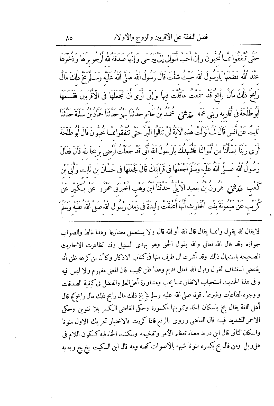 لَا يُقَالُ اللَّهُ يَقُولُ وَإِنَّمَا يُقَالُ قَالَ اللَّهُ أَوِ اللَّهُ قَالَ وَلَا يُسْتَعْمَلُ مُضَارِعًا وَهَذَا غَلَطٌ وَالصَّوَابُ جَوَازُهُ وَقَدْ قَالَ اللَّهُ تَعَالَى وَاللَّهُ يَقُولُ الْحَقَّ وَهُوَ يَهْدِي السَّبِيلَ وَقَدْ تَظَاهَرَتِ الْأَحَادِيثُ الصَّحِيحَةُ بِاسْتِعْمَالِ ذَلِكَ وَقَدْ أَشَرْتُ إِلَى طَرَفٍ مِنْهَا فِي كِتَابِ الْأَذْكَارِ وَكَأَنَّ مَنْ كَرِهَهُ ظَنَّ أَنَّهُ يَقْتَضِي اسْتِئْنَافَ الْقَوْلَ وَقَوْلُ اللَّهِ تَعَالَى قَدِيمٌ وَهَذَا ظَنٌّ عَجِيبٌ فَإِنَّ الْمَعْنَى مَفْهُومٌ وَلَا لَبْسَ فِيهِ وَفِي هَذَا الْحَدِيثِ اسْتِحْبَابُ الْإِنْفَاقِ مِمَّا يُحِبُّ وَمُشَاوَرَةُ أَهْلِ الْعِلْمِ وَالْفَضْلِ فِي كَيْفِيَّةِ الصَّدَقَاتِ وَوُجُوهِ الطَّاعَاتِ وَغَيْرِهَا قَوْلُهُ صَلَّى اللَّهُ عَلَيْهِ وَسَلَّمَ (بَخٍ ذَلِكَ مَالٌ رَابِحٌ ذَلِكَ مَالٌ رَابِحٌ) قَالَ أَهْلُ اللُّغَةِ يُقَالُ بَخٍ بِإِسْكَانِ الْخَاءِ وَتَنْوِينِهَا مَكْسُورَةٍ وَحَكَى الْقَاضِي الْكَسْرَ بِلَا تَنْوِينٍ وَحَكَى الْأَحْمَرُ التَّشْدِيدَ فِيهِ قَالَ الْقَاضِي وَرُوِيَ بِالرَّفْعِ فَإِذَا كُرِّرَتْ فَالِاخْتِيَارُ تَحْرِيكُ الْأَوَّلِ منونا واسكان الثاني قال بن دُرَيْدٍ مَعْنَاهُ تَعْظِيمُ الْأَمْرِ وَتَفْخِيمُهُ وَسُكِّنَتِ الْخَاءُ فِيهِ كَسُكُونِ اللَّامِ فِي هَلْ وَبَلْ وَمَنْ قَالَ بَخٍ بِكَسْرِهِ مُنَوَّنًا شَبَّهَهُ بِالْأَصْوَاتِ كَصَهٍ ومه قال بن السِّكِّيتِ بَخٍ بَخٍ وَبَهٍ بَهٍ