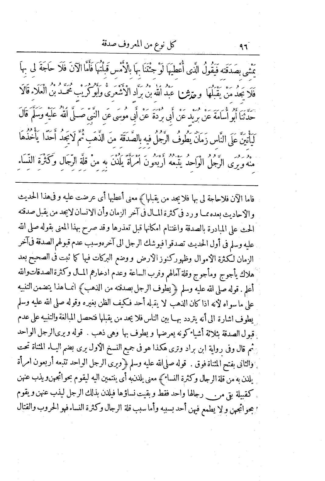 [1012] قَوْلُهُ صَلَّى اللَّهُ عَلَيْهِ وَسَلَّمَ (يَطُوفُ الرَّجُلُ بِصَدَقَتِهِ مِنَ الذَّهَبِ) إِنَّمَا هَذَا يَتَضَمَّنُ التَّنْبِيهَ عَلَى مَا سِوَاهُ لِأَنَّهُ إِذَا كَانَ الذَّهَبُ لَا يَقْبَلُهُ أَحَدٌ فَكَيْفَ الظَّنُّ بِغَيْرِهِ وَقَوْلُهُ صَلَّى اللَّهُ عَلَيْهِ وَسَلَّمَ يَطُوفُ إِشَارَةٌ إِلَى أَنَّهُ يَتَرَدَّدُ بِهَا بَيْنَ النَّاسِ فَلَا يَجِدُ مَنْ يَقْبَلُهَا فَتَحْصُلُ الْمُبَالَغَةُ وَالتَّنْبِيهُ عَلَى عَدَمِ قَبُولِ الصَّدَقَةِ بِثَلَاثَةِ أَشْيَاءَ كَوْنُهُ يَعْرِضُهَا وَيَطُوفُ بِهَا وَهِيَ ذَهَبٌ قَوْلُهُ وَيُرَى الرَّجُلُ الْوَاحِدُ ثُمَّ قال وفي رواية بن بَرَّادٍ وَتَرَى هَكَذَا هُوَ فِي جَمِيعِ النُّسَخِ الْأَوَّلُ يُرَى بِضَمِّ الْيَاءِ الْمُثَنَّاةِ تَحْتَ وَالثَّانِي بِفَتْحِ الْمُثَنَّاةِ فَوْقَ قَوْلُهُ صَلَّى اللَّهُ عَلَيْهِ وَسَلَّمَ (وَيُرَى الرَّجُلُ الْوَاحِدُ تَتْبَعُهُ أَرْبَعُونَ امْرَأَةً يَلُذْنَ بِهِ مِنْ قِلَّةِ الرِّجَالِ وَكَثْرَةِ النِّسَاءِ) مَعْنَى يَلُذْنَ بِهِ أَيْ يَنْتَمِينَ إِلَيْهِ لِيَقُومَ بِحَوَائِجِهِنَّ وَيَذُبَّ عَنْهُنَّ كَقَبِيلَةٍ بَقِيَ مِنْ رِجَالِهَا وَاحِدٌ فَقَطْ وَبَقِيَتْ نِسَاؤُهَا فَيَلُذْنَ بِذَلِكَ الرَّجُلِ لِيَذُبَّ عَنْهُنَّ وَيَقُومَ بِحَوَائِجِهِنَّ وَلَا يَطْمَعَ فِيهِنَّ أَحَدٌ بِسَبَبِهِ وَأَمَّا سَبَبُ قِلَّةِ الرِّجَالِ وَكَثْرَةِ النِّسَاءِ فَهُوَ الْحُرُوبُ وَالْقِتَالُ