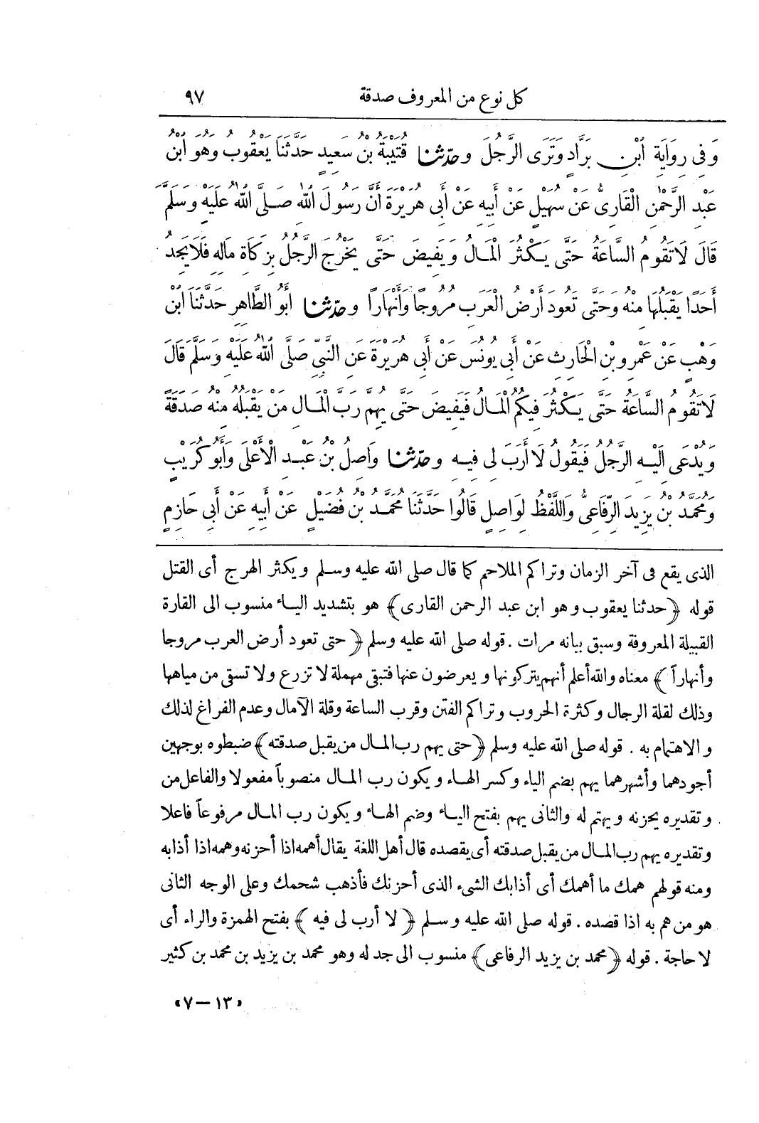 الَّذِي يَقَعُ فِي آخِرِ الزَّمَانِ وَتَرَاكُمُ الْمَلَاحِمِ كَمَا قَالَ صَلَّى اللَّهُ عَلَيْهِ وَسَلَّمَ وَيَكْثُرُ الْهَرْجُ أَيِ الْقَتْلُ قَوْلُهُ (حَدَّثَنَا يَعْقُوبُ وَهُوَ بن عبد الرحمن القارىء) هُوَ بِتَشْدِيدِ الْيَاءِ مَنْسُوبٌ إِلَى الْقَارَةِ الْقَبِيلَةِ المَعْرُوفَةِ وَسَبَقَ بَيَانُهُ مَرَّاتٍ قَوْلُهُ صَلَّى اللَّهُ عَلَيْهِ وَسَلَّمَ (حَتَّى تَعُودَ أَرْضُ الْعَرَبِ مُرُوجًا وَأَنْهَارًا) مَعْنَاهُ وَاللَّهُ أَعْلَمُ أَنَّهُمْ يَتْرُكُونَهَا وَيُعْرِضُونَ عَنْهَا فَتَبْقَى مُهْمَلَةً لَا تُزْرَعُ وَلَا تُسْقَى مِنْ مِيَاهِهَا وَذَلِكَ لِقِلَّةِ الرِّجَالِ وَكَثْرَةِ الْحُرُوبِ وتراكم الفتن وَقُرْبِ السَّاعَةِ وَقِلَّةِ الْآمَالِ وَعَدَمِ الْفَرَاغِ لِذَلِكَ والِاهْتِمَامِ بِهِ قَوْلُهُ صَلَّى اللَّهُ عَلَيْهِ وَسَلَّمَ (حَتَّى يُهِمَّ رَبَّ الْمَالِ مَنْ يَقْبَلُ صَدَقَتَهُ) ضَبَطُوهُ بِوَجْهَيْنِ أَجْوَدُهُمَا وَأَشْهَرُهُمَا يُهِمَّ بِضَمِّ الْيَاءِ وَكَسْرِ الْهَاءِ وَيَكُونُ رَبُّ الْمَالِ مَنْصُوبًا مَفْعُولًا وَالْفَاعِلُ مَنْ وَتَقْدِيرُهُ يُحْزِنُهُ وَيَهْتَمُّ لَهُ وَالثَّانِي يَهُمَّ بِفَتْحِ الْيَاءِ وَضَمِّ الْهَاءِ وَيَكُونُ رَبُّ الْمَالِ مَرْفُوعًا فَاعِلًا وَتَقْدِيرُهُ يَهُمُّ رَبُّ الْمَالِ مَنْ يَقْبَلُ صَدَقَتَهُ أَيْ بِقَصْدِهِ قَالَ أَهْلُ اللُّغَةِ يُقَالُ أَهَمَّهُ إِذَا أَحْزَنَهُ وَهَمَّهُ إِذَا أَذَابَهُ وَمِنْهُ قَوْلُهُمْ هَمَّكَ مَا أَهَمَّكَ أَيْ أَذَابَكَ الشَّيْءُ الَّذِي أَحْزَنَكَ فَأَذْهَبَ شَحْمَكَ وَعَلَى الْوَجْهِ الثَّانِي هُوَ مِنْ هَمَّ بِهِ إِذَا قَصَدَهُ قَوْلُهُ صَلَّى اللَّهُ عَلَيْهِ وَسَلَّمَ (لَا أَرَبَ لِي فِيهِ) بِفَتْحِ الْهَمْزَةِ وَالرَّاءِ أَيْ لَا حَاجَةَ