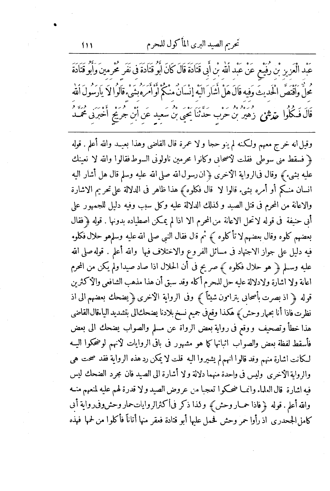 وَقِيلَ إِنَّهُ خَرَجَ مَعَهُمْ وَلَكِنَّهُ لَمْ يَنْوِ حَجًّا وَلَا عُمْرَةً قَالَ الْقَاضِي وَهَذَا بَعِيدٌ وَاللَّهُ أَعْلَمُ قَوْلُهُ (فَسَقَطَ مِنِّي سَوْطِي فَقُلْتُ لِأَصْحَابِي وَكَانُوا مُحْرِمِينَ نَاوَلُونِي السَّوْطَ فَقَالُوا وَاللَّهِ لا نعنيك عَلَيْهِ بِشَيْءٍ) وَقَالَ فِي الرِّوَايَةِ الْأُخْرَى (أَنَّ رَسُولَ اللَّهِ صَلَّى اللَّهُ عليه وسلم قال هَلْ أَشَارَ إِلَيْهِ إِنْسَانٌ مِنْكُمْ أَوْ أَمَرَهُ بِشَيْءٍ قَالُوا لَا قَالَ فَكُلُوهُ) هَذَا ظَاهِرٌ فِي الدَّلَالَةِ عَلَى تَحْرِيمِ الْإِشَارَةِ وَالْإِعَانَةِ مِنَ الْمُحْرِمِ فِي قَتْلِ الصَّيْدِ وَكَذَلِكَ الدَّلَالَةِ عَلَيْهِ وَكُلِّ سَبَبٍ وَفِيهِ دَلِيلٌ لِلْجُمْهُورِ عَلَى أَبِي حَنِيفَةَ فِي قَوْلِهِ لَا تَحِلُّ الْإِعَانَةُ مِنَ الْمُحْرِمِ إِلَّا إِذَا لَمْ يُمْكِنِ اصْطِيَادُهُ بِدُونِهَا قَوْلُهُ (فَقَالَ بَعْضُهُمْ كُلُوهُ وَقَالَ بَعْضُهُمْ لَا تأكلوه) ثم قال فقال النَّبِيُّ صَلَّى اللَّهُ عَلَيْهِ وَسَلَّمَ هُوَ حَلَالٌ فَكُلُوهُ فِيهِ دَلِيلٌ عَلَى جَوَازِ الِاجْتِهَادِ فِي مَسَائِلِ الْفُرُوعِ وَالِاخْتِلَافِ فِيهَا وَاللَّهُ أَعْلَمُ قَوْلُهُ صَلَّى اللَّهُ عَلَيْهِ وَسَلَّمَ (هُوَ حَلَالٌ فَكُلُوهُ) صَرِيحٌ فِي أَنَّ الْحَلَالَ إِذَا صَادَ صَيْدًا وَلَمْ يَكُنْ مِنَ الْمُحْرِمِ إِعَانَةٌ وَلَا إِشَارَةٌ وَلَا دَلَالَةٌ عَلَيْهِ حَلَّ لِلْمُحْرِمِ أَكْلُهُ وَقَدْ سَبَقَ أَنَّ هَذَا مَذْهَبُ الشَّافِعِيِّ وَالْأَكْثَرِينَ قَوْلُهُ (إِذْ بَصُرْتُ بِأَصْحَابِي يَتَرَاءَوْنَ شَيْئًا) وَفِي الرِّوَايَةِ الْأُخْرَى (يَضْحَكُ بَعْضُهُمْ إِلَيَّ إِذْ نَظَرْتُ فَإِذَا أَنَا بِحِمَارِ وَحْشٍ) هَكَذَا وَقَعَ فِي جَمِيعِ نُسَخِ بِلَادِنَا يَضْحَكُ إِلَيَّ بِتَشْدِيدِ الْيَاءِ قَالَ الْقَاضِي هَذَا خَطَأٌ وَتَصْحِيفٌ وَوَقَعَ فِي رِوَايَةِ بَعْضِ الرُّوَاةِ عَنْ مُسْلِمٍ وَالصَّوَابُ يَضْحَكُ إِلَى بَعْضٍ فَأَسْقَطَ لَفْظَةَ بَعْضٍ وَالصَّوَابُ إِثْبَاتُهَا كَمَا هُوَ مَشْهُورٌ فِي بَاقِي الرِّوَايَاتِ لِأَنَّهُمْ لَوْ ضَحِكُوا إِلَيْهِ لَكَانَتْ إِشَارَةٌ مِنْهُمْ وَقَدْ قَالُوا إِنَّهُمْ لَمْ يُشِيرُوا إِلَيْهِ قُلْتُ لَا يُمْكِنُ رَدُّ هَذِهِ الرِّوَايَةِ فَقَدْ صَحَّتْ هِيَ وَالرِّوَايَةُ الْأُخْرَى وَلَيْسَ فِي وَاحِدَةٍ مِنْهُمَا دَلَالَةٌ وَلَا اشارة إلى الصيد فَإِنَّ مُجَرَّدَ الضَّحِكِ لَيْسَ فِيهِ إِشَارَةٌ قَالَ الْعُلَمَاءُ وَإِنَّمَا ضَحِكُوا تَعَجُّبًا مِنْ عُرُوضِ الصَّيْدِ وَلَا قُدْرَةَ لَهُمْ عَلَيْهِ لِمَنْعِهِمْ مِنْهُ وَاللَّهُ أَعْلَمُ قَوْلُهُ (فَإِذَا حِمَارُ وَحْشٍ) وَكَذَا ذُكِرَ فِي أَكْثَرِ الرِّوَايَاتِ حِمَارُ وَحْشٍ وَفِي رِوَايَةِ أَبِي كَامِلٍ الْجَحْدَرِيِّ إِذْ رَأَوْا حُمُرَ وَحْشٍ فَحَمَلَ عَلَيْهَا أَبُو قَتَادَةَ فَعَقَرَ مِنْهَا أَتَانًا فَأَكَلُوا مِنْ لَحْمِهَا فَهَذِهِ