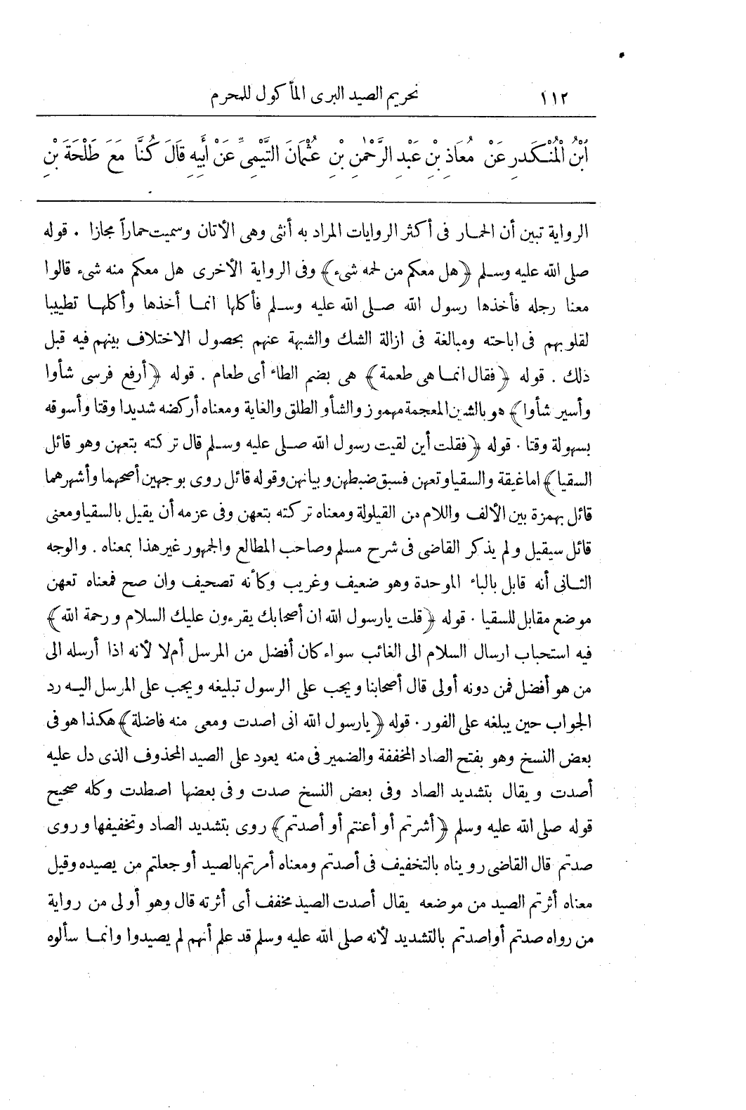 الرِّوَايَةُ تُبَيِّنُ أَنَّ الْحِمَارَ فِي أَكْثَرِ الرِّوَايَاتِ الْمُرَادُ بِهِ أُنْثَى وَهِيَ الْأَتَانُ وَسُمِّيَتْ حِمَارًا مجازا قَوْلُهُ صَلَّى اللَّهُ عَلَيْهِ وَسَلَّمَ (هَلْ مَعَكُمْ مِنْ لَحْمِهِ شَيْءٌ) وَفِي الرِّوَايَةِ الْأُخْرَى هَلْ مَعَكُمْ مِنْهُ شَيْءٌ قَالُوا مَعَنَا رِجْلُهُ فَأَخَذَهَا رَسُولُ اللَّهِ صَلَّى اللَّهُ عَلَيْهِ وَسَلَّمَ فَأَكَلَهَا إِنَّمَا أَخَذَهَا وَأَكَلَهَا تَطْيِيبًا لِقُلُوبِهِمْ فِي إِبَاحَتِهِ وَمُبَالَغَةً فِي إِزَالَةِ الشَّكِّ وَالشُّبْهَةِ عَنْهُمْ بِحُصُولِ الِاخْتِلَافِ بَيْنَهُمْ فِيهِ قَبْلَ ذَلِكَ قَوْلُهُ (فَقَالَ انما هي طعمة) هي الطَّاءِ أَيْ طَعَامٌ قَوْلُهُ (أَرْفَعُ فَرَسِي شَأْوًا وأسير شأوا) هو بالشين المعجمة مهموز والشأو الطَّلْقُ وَالْغَايَةُ وَمَعْنَاهُ أَرْكُضُهُ شَدِيدًا وَقْتًا وَأَسُوقُهُ بِسُهُولَةٍ وَقْتًا قَوْلُهُ (فَقُلْتُ أَيْنَ لَقِيتَ رَسُولَ اللَّهِ صَلَّى اللَّهُ عَلَيْهِ وَسَلَّمَ قَالَ تَرَكْتُهُ بِتِعْهِنَ وَهُوَ قَائِلٌ السُّقْيَا) أَمَّا غَيْقَةُ وَالسُّقْيَا وَتِعْهِنُ فَسَبَقَ ضَبْطُهُنَّ وَبَيَانُهُنَّ وَقَوْلُهُ قَائِلٌ رُوِيَ بِوَجْهَيْنِ أَصَحُّهُمَا وَأَشْهَرُهُمَا قَائِلٌ بِهَمْزَةٍ بَيْنَ الْأَلِفِ وَاللَّامِ مِنَ الْقَيْلُولَةِ وَمَعْنَاهُ تَرَكْتُهُ بِتِعْهِنَ وَفِي عَزْمِهِ أَنْ يَقِيلَ بِالسُّقْيَا وَمَعْنَى قَائِلٌ سَيَقِيلُ وَلَمْ يَذْكُرِ الْقَاضِي فِي شَرْحِ مُسْلِمٍ وَصَاحِبُ الْمَطَالِعِ وَالْجُمْهُورُ غَيْرَ هَذَا بِمَعْنَاهُ وَالْوَجْهُ الثَّانِي أَنَّهُ قَابِلٌ بِالْبَاءِ الْمُوَحَّدَةِ وَهُوَ ضَعِيفٌ وَغَرِيبٌ وَكَأَنَّهُ تَصْحِيفٌ وَإِنْ صَحَّ فَمَعْنَاهُ تِعْهِنُ مَوْضِعٌ مقابل لِلسُّقْيَا قَوْلُهُ (قُلْتُ يَا رَسُولَ اللَّهِ إِنَّ أصحابك يقرؤون عَلَيْكَ السَّلَامَ وَرَحْمَةَ اللَّهِ) فِيهِ اسْتِحْبَابُ إِرْسَالِ السَّلَامِ إِلَى الْغَائِبِ سَوَاءٌ كَانَ أَفْضَلَ مِنَ الْمُرْسِلِ أَمْ لَا لِأَنَّهُ إِذَا أَرْسَلَهُ إِلَى مَنْ هُوَ أَفْضَلُ فَمَنْ دُونَهُ أَوْلَى قَالَ أَصْحَابُنَا وَيَجِبُ عَلَى الرَّسُولِ تَبْلِيغُهُ وَيَجِبُ عَلَى الْمُرْسَلِ إِلَيْهِ رَدُّ الْجَوَابِ حِينَ يَبْلُغُهُ عَلَى الْفَوْرِ قَوْلُهُ (يَا رَسُولَ اللَّهِ إِنِّي أَصَدْتُ وَمَعِي مِنْهُ فَاضِلَةٌ) هَكَذَا هُوَ فِي بَعْضِ النُّسَخِ وَهُوَ بِفَتْحِ الصَّادِ الْمُخَفَّفَةِ وَالضَّمِيرُ فِي مِنْهُ يَعُودُ عَلَى الصَّيْدِ الْمَحْذُوفِ الَّذِي دَلَّ عَلَيْهِ أَصَدْتُ وَيُقَالُ بِتَشْدِيدِ الصَّادِ وَفِي بَعْضِ النُّسَخِ صِدْتُ وَفِي بَعْضِهَا اصْطَدْتُ وَكُلُّهُ صَحِيحٌ قَوْلُهُ صَلَّى اللَّهُ عَلَيْهِ وَسَلَّمَ (أَشَرْتُمْ أَوْ أَعَنْتُمْ أَوْ أَصَّدْتُمْ) رُوِيَ بِتَشْدِيدِ الصَّادِ وَتَخْفِيفِهَا وَرُوِيَ صِدْتُمْ قَالَ الْقَاضِي رُوِّينَاهُ بِالتَّخْفِيفِ فِي أَصَدْتُمْ وَمَعْنَاهُ أَمَرْتُمْ بِالصَّيْدِ أَوْ جَعَلْتُمْ مَنْ يَصِيدُهُ وَقِيلَ مَعْنَاهُ أَثَرْتُمُ الصَّيْدَ مِنْ مَوْضِعِهِ يُقَالُ أَصَدْتُ الصَّيْدَ مُخَفَّفٌ أَيْ أَثَرْتُهُ قَالَ وَهُوَ أَوْلَى مِنْ رِوَايَةِ مَنْ رَوَاهُ صِدْتُمْ أَوْ أَصَّدْتُمْ بِالتَّشْدِيدِ لِأَنَّهُ صَلَّى اللَّهُ عَلَيْهِ وَسَلَّمَ قَدْ عَلِمَ أَنَّهُمْ لَمْ يَصِيدُوا وَإِنَّمَا سألوه