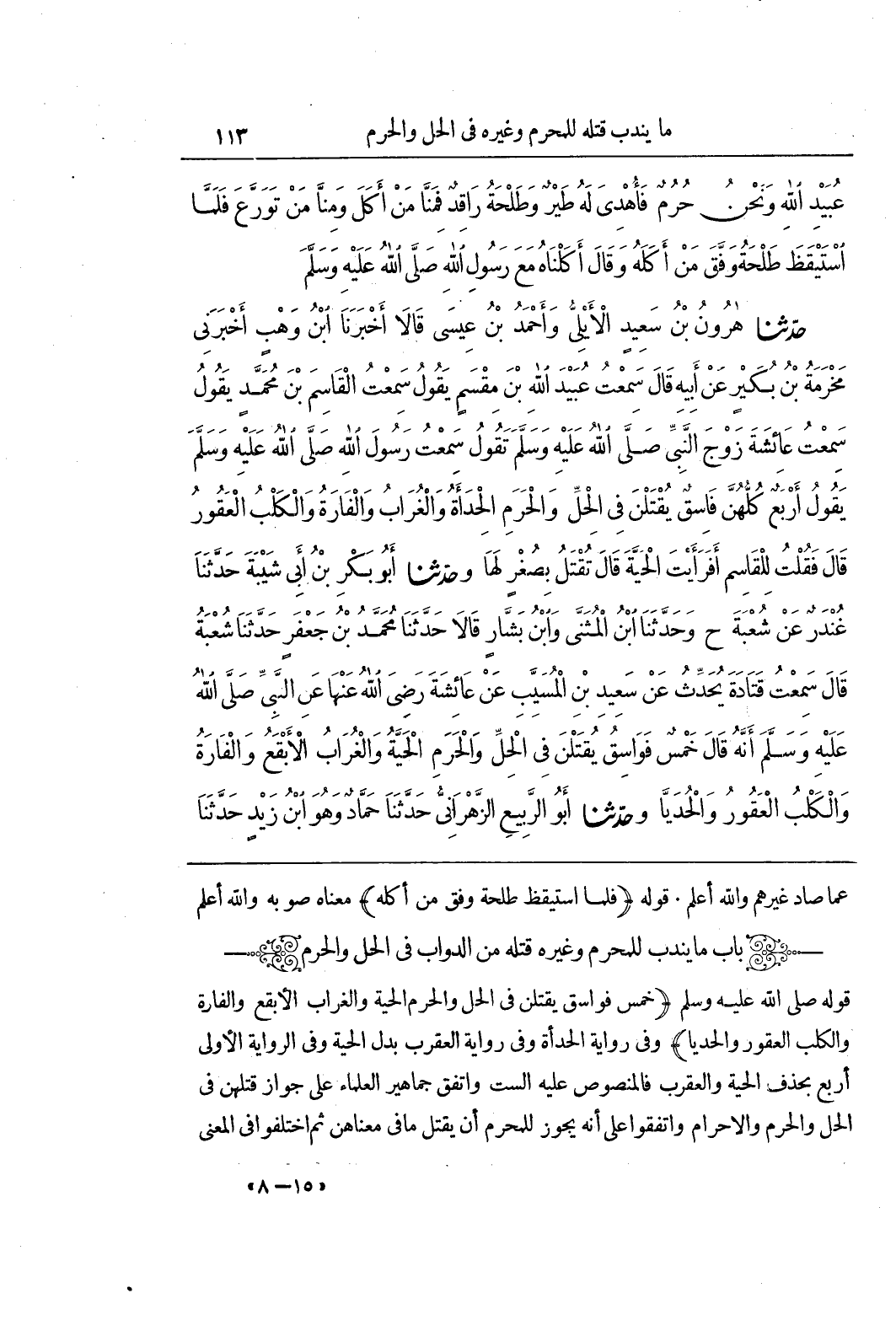 قَوْلُهُ صَلَّى اللَّهُ عَلَيْهِ وَسَلَّمَ (خَمْسٌ فَوَاسِقُ يُقْتَلْنَ فِي الْحِلِّ وَالْحَرَمِ الْحَيَّةُ وَالْغُرَابُ الْأَبْقَعُ وَالْفَارَةُ وَالْكَلْبُ الْعَقُورُ وَالْحُدَيَّا) وَفِي رِوَايَةٍ الْحِدَأَةُ وَفِي رِوَايَةٍ الْعَقْرَبُ بَدَلُ الْحَيَّةِ وَفِي الرِّوَايَةِ الْأُولَى أَرْبَعٌ بِحَذْفِ الْحَيَّةِ وَالْعَقْرَبِ فَالْمَنْصُوصُ عَلَيْهِ السِّتُّ وَاتَّفَقَ جَمَاهِيرُ الْعُلَمَاءِ عَلَى جَوَازِ قَتْلِهِنَّ فِي الْحِلِّ وَالْحَرَمِ وَالْإِحْرَامِ وَاتَّفَقُوا عَلَى أَنَّهُ يَجُوزُ لِلْمُحْرِمِ أَنْ يَقْتُلَ مَا فِي مَعْنَاهُنَّ ثُمَّ اخْتَلَفُوا فِي الْمَعْنَى
