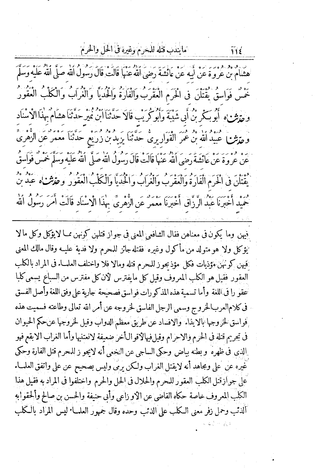 فِيهِنَّ وَمَا يَكُونُ فِي مَعْنَاهُنَّ فَقَالَ الشَّافِعِيُّ الْمَعْنَى فِي جَوَازِ قَتْلِهِنَّ كَوْنُهُنَّ مِمَّا لَا يؤكل وكل مالا يُؤْكَلُ وَلَا هُوَ مُتَوَلِّدٌ مِنْ مَأْكُولٍ وَغَيْرِهِ فَقَتْلُهُ جَائِزٌ لِلْمُحْرِمِ وَلَا فِدْيَةَ عَلَيْهِ وَقَالَ مَالِكٌ الْمَعْنَى فِيهِنَّ كَوْنُهُنَّ مُؤْذِيَاتٍ فَكُلُّ مُؤْذٍ يجوز للمحرم قتله ومالا فَلَا وَاخْتَلَفَ الْعُلَمَاءُ فِي الْمُرَادِ بِالْكَلْبِ الْعَقُورِ فَقِيلَ هُوَ الْكَلْبُ الْمَعْرُوفُ وَقِيلَ كُلُّ مَا يَفْتَرِسُ لِأَنَّ كُلَّ مُفْتَرِسٍ مِنَ السِّبَاعِ يُسَمَّى كَلْبًا عَقُورًا فِي اللُّغَةِ وَأَمَّا تَسْمِيَةُ هَذِهِ الْمَذْكُورَاتِ فَوَاسِقُ فَصَحِيحَةٌ جَارِيَةٌ عَلَى وَفْقِ اللُّغَةِ وَأَصْلُ الْفِسْقِ فِي كَلَامِ الْعَرَبِ الْخُرُوجُ وَسُمِّيَ الرَّجُلُ الْفَاسِقُ لِخُرُوجِهِ عَنْ أَمْرِ اللَّهِ تَعَالَى وَطَاعَتِهِ فَسُمِّيَتْ هَذِهِ فَوَاسِقُ لِخُرُوجِهَا بِالْإِيذَاءِ وَالْإِفْسَادِ عَنْ طَرِيقِ مُعْظَمِ الدَّوَابِّ وَقِيلَ لِخُرُوجِهَا عَنْ حُكْمِ الْحَيَوَانِ فِي تَحْرِيمِ قَتْلِهِ فِي الْحَرَمِ وَالْإِحْرَامِ وَقِيلَ فِيهَا لِأَقْوَالٍ أُخَرَ ضَعِيفَةٍ لَا نَعْتَنِيهَا وَأَمَّا الْغُرَابُ الْأَبْقَعُ فَهُوَ الَّذِي فِي ظَهْرِهِ وَبَطْنِهِ بَيَاضٌ وَحَكَى السَّاجِيُّ عَنِ النَّخَعِيِّ أَنَّهُ لَا يَجُوزُ لِلْمُحْرِمِ قَتْلُ الْفَارَةِ وَحُكِيَ غَيْرُهُ عَنْ عَلِيٍّ وَمُجَاهِدٍ أَنَّهُ لَا يُقْتَلُ الْغُرَابُ وَلَكِنْ يُرْمَى وَلَيْسَ بِصَحِيحٍ عَنْ عَلِيٍّ وَاتَّفَقَ الْعُلَمَاءُ عَلَى جَوَازِ قَتْلِ الْكَلْبِ الْعَقُورِ لِلْمُحْرِمِ وَالْحَلَالِ فِي الْحِلِّ وَالْحَرَمِ وَاخْتَلَفُوا فِي الْمُرَادِ بِهِ فَقِيلَ هَذَا الْكَلْبُ الْمَعْرُوفُ خَاصَّةً حَكَاهُ الْقَاضِي عَنِ الْأَوْزَاعِيِّ وَأَبِي حَنِيفَةَ وَالْحَسَنِ بْنِ صَالِحٍ وَأَلْحَقُوا بِهِ الذِّئْبَ وَحَمَلَ زُفَرُ مَعْنَى الْكَلْبِ عَلَى الذِّئْبِ وَحْدَهُ وَقَالَ جُمْهُورُ الْعُلَمَاءِ لَيْسَ الْمُرَادُ بِالْكَلْبِ