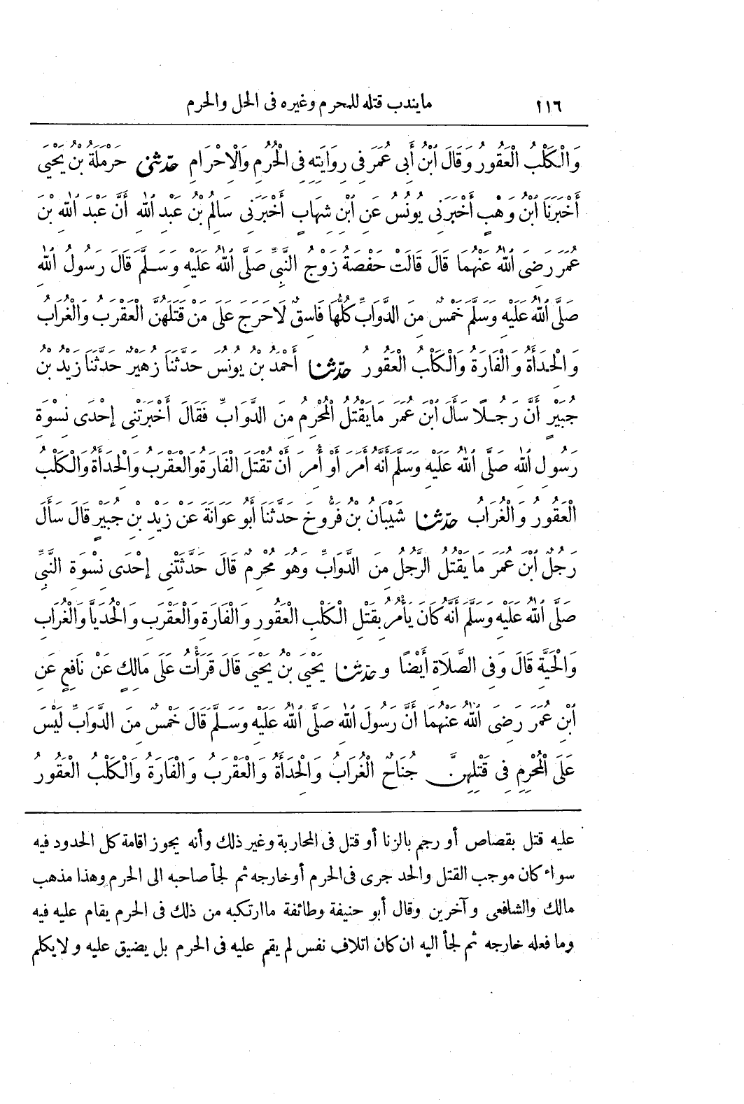 عليه قتل بقصاص أو رجم بالزنى أَوْ قَتْلٍ فِي الْمُحَارَبَةِ وَغَيْرِ ذَلِكَ وَأَنَّهُ يَجُوزُ إِقَامَةُ كُلُّ الْحُدُودِ فِيهِ سَوَاءٌ كَانَ مَوْجِبُ الْقَتْلِ وَالْحَدِّ جَرَى فِي الْحَرَمِ أَوْ خَارِجِهِ ثُمَّ لَجَأَ صَاحِبُهُ إِلَى الْحَرَمِ وَهَذَا مَذْهَبُ مَالِكٍ وَالشَّافِعِيِّ وَآخَرِينَ وَقَالَ أَبُو حَنِيفَةَ وَطَائِفَةٌ مَا ارْتَكَبَهُ مِنْ ذَلِكَ فِي الْحَرَمِ يُقَامُ عَلَيْهِ فِيهِ وَمَا فَعَلَهُ خَارِجَهُ ثُمَّ لَجَأَ إِلَيْهِ إِنْ كَانَ إِتْلَافَ نَفْسٍ لَمْ يقم عليه في الحرم بل يُضَيَّقْ عَلَيْهِ وَلَا يُكَلَّمْ