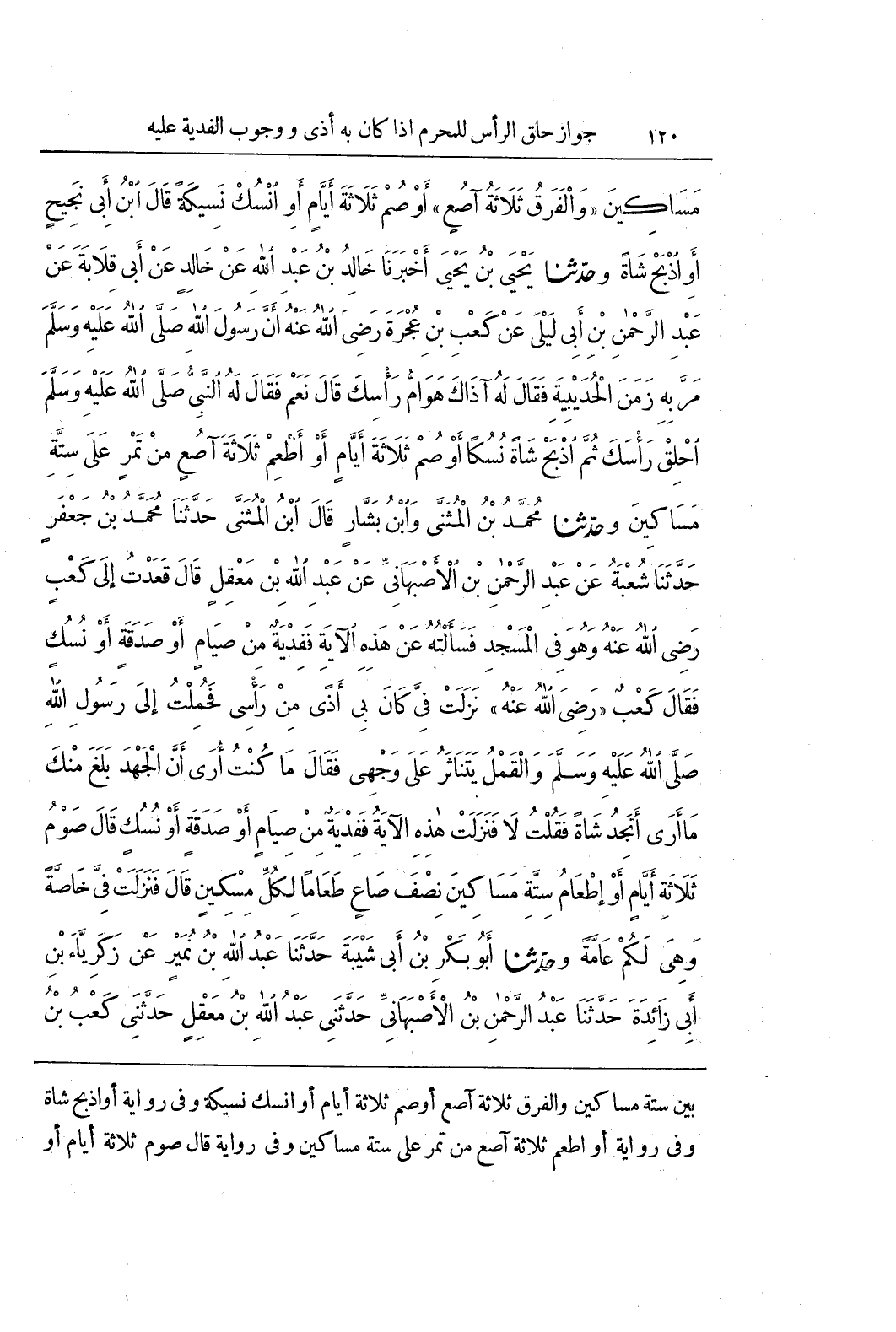 بين ستة مساكين والفرق ثلاثة آصع أوصم ثَلَاثَةَ أَيَّامٍ أَوِ انْسُكْ نَسِيكَةً وَفِي رِوَايَةٍ أَوِ اذْبَحْ شَاةً وَفِي رِوَايَةٍ أَوْ أَطْعِمْ ثَلَاثَةَ آصُعٍ مِنْ تَمْرٍ عَلَى سِتَّةِ مَسَاكِينَ وَفِي رِوَايَةٍ قَالَ صَوْمُ ثَلَاثَةِ أَيَّامٍ أَوْ