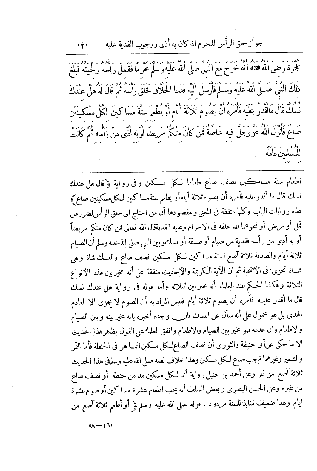 إِطْعَامُ سِتَّةِ مَسَاكِينَ نِصْفَ صَاعٍ طَعَامًا لِكُلِّ مِسْكِينٍ وَفِي رِوَايَةٍ (قَالَ هَلْ عِنْدَكَ نُسُكٌ قَالَ مَا أَقْدِرُ عَلَيْهِ فَأَمَرَهُ أَنْ يَصُومَ ثَلَاثَةَ أَيَّامٍ أَوْ يُطْعِمَ سِتَّةَ مَسَاكِينَ لِكُلِّ مسكينين صاع) هذه روايات الباب وكلها متفقة فِي الْمَعْنَى وَمَقْصُودُهَا أَنَّ مَنِ احْتَاجَ إِلَى حَلْقِ الرَّأْسِ لِضَرَرٍ مِنْ قَمْلٍ أَوْ مَرَضٍ أَوْ نَحْوِهِمَا فَلَهُ حَلْقُهُ فِي الْإِحْرَامِ وَعَلَيْهِ الْفِدْيَةُ قَالَ اللَّهُ تَعَالَى فَمَنْ كَانَ مِنْكُمْ مَرِيضًا أَوْ بِهِ أَذًى مِنْ رَأْسِهِ فَفِدْيَةٌ من صيام أو صدقة أو نسك وَبَيَّنَ النَّبِيُّ صَلَّى اللَّهُ عَلَيْهِ وَسَلَّمَ أَنَّ الصِّيَامَ ثَلَاثَةُ أَيَّامٍ وَالصَّدَقَةَ ثَلَاثَةُ آصُعٍ لِسِتَّةِ مَسَاكِينَ لِكُلِّ مِسْكِينٍ نِصْفُ صَاعٍ وَالنُّسُكَ شَاةٌ وهي شاة تجزيء فِي الْأُضْحِيَّةِ ثُمَّ إِنَّ الْآيَةَ الْكَرِيمَةَ وَالْأَحَادِيثَ مُتَّفِقَةٌ عَلَى أَنَّهُ مُخَيَّرٌ بَيْنَ هَذِهِ الْأَنْوَاعِ الثَّلَاثَةِ وَهَكَذَا الْحُكْمُ عِنْدَ الْعُلَمَاءِ أَنَّهُ مُخَيَّرٌ بَيْنَ الثَّلَاثَةِ وَأَمَّا قَوْلُهُ فِي رِوَايَةٍ هَلْ عِنْدَكَ نُسُكٌ قَالَ مَا أَقْدِرُ عَلَيْهِ فَأَمَرَهُ أَنْ يَصُومَ ثَلَاثَةَ أَيَّامٍ فَلَيْسَ الْمُرَادُ بِهِ أن الصوم لا يجزئ إِلَّا لِعَادِمِ الْهَدْيِ بَلْ هُوَ مَحْمُولٌ عَلَى أَنَّهُ سَأَلَ عَنِ النُّسُكِ فَإِنْ وَجَدَهُ أَخْبَرَهُ بِأَنَّهُ مُخَيَّرٌ بَيْنَهُ وَبَيْنَ الصِّيَامِ وَالْإِطْعَامِ وَإِنْ عَدِمَهُ فَهُوَ مُخَيَّرٌ بَيْنَ الصِّيَامِ وَالْإِطْعَامِ وَاتَّفَقَ جماهير الْعُلَمَاءُ عَلَى الْقَوْلِ بِظَاهِرِ هَذَا الْحَدِيثِ إِلَّا مَا حُكِيَ عَنْ أَبِي حَنِيفَةَ وَالثَّوْرِيِّ أَنَّ نِصْفَ الصَّاعِ لِكُلِّ مِسْكِينٍ إِنَّمَا هُوَ فِي الْحِنْطَةِ فَأَمَّا التَّمْرُ وَالشَّعِيرُ وَغَيْرُهُمَا فَيَجِبُ صَاعٌ لكل مسكين وهذا خلاف نصفه صَلَّى اللَّهُ عَلَيْهِ وَسَلَّمَ فِي هَذَا الْحَدِيثِ ثَلَاثَةَ آصُعٍ مِنْ تَمْرٍ وَعَنْ أَحْمَدَ بْنِ حَنْبَلٍ رِوَايَةُ أَنَّهُ لِكُلِّ مِسْكِينٍ مُدٌّ مِنْ حِنْطَةٍ أَوْ نِصْفُ صَاعٍ مِنْ غَيْرِهِ وَعَنِ الْحَسَنِ الْبَصْرِيِّ وَبَعْضِ السَّلَفِ أَنَّهُ يَجِبُ إِطْعَامُ عَشَرَةِ مَسَاكِينَ أَوْ صَوْمُ عَشَرَةِ أَيَّامٍ وَهَذَا ضَعِيفٌ مُنَابِذٌ لِلسُّنَّةِ مَرْدُودٌ قَوْلُهُ صَلَّى اللَّهُ عَلَيْهِ وَسَلَّمَ (أَوْ أَطْعِمْ ثَلَاثَةَ آصُعٍ مِنْ