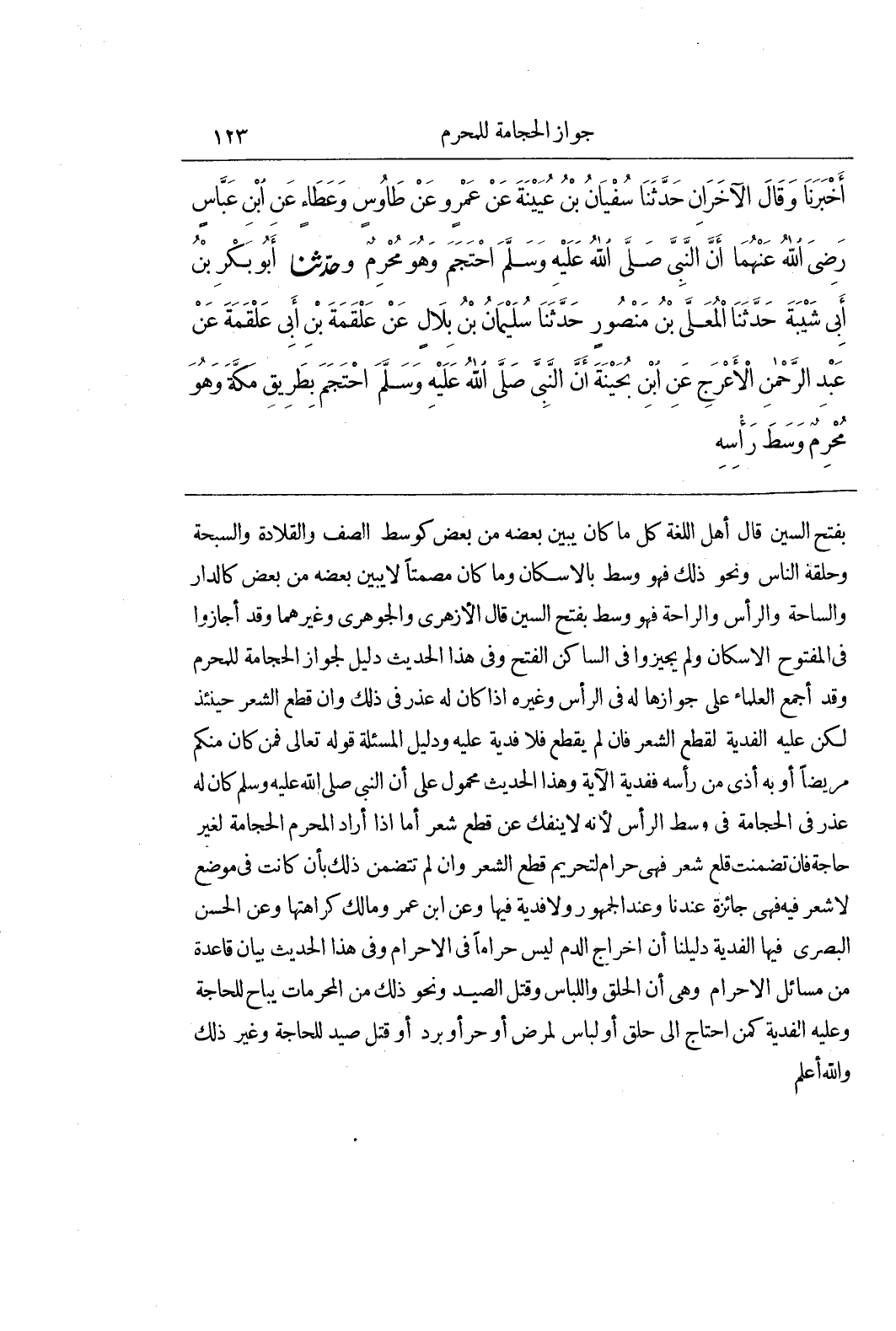 بِفَتْحِ السِّينِ قَالَ أَهْلُ اللُّغَةِ كُلُّ مَا كَانَ يَبِينُ بَعْضُهُ مِنْ بَعْضٍ كَوَسْطِ الصَّفِّ وَالْقِلَادَةِ وَالسُّبْحَةِ وَحَلْقَةِ النَّاسِ وَنَحْوِ ذَلِكَ فَهُوَ وَسْطٌ بِالْإِسْكَانِ وَمَا كَانَ مُصْمَتًا لَا يَبِينُ بَعْضُهُ مِنْ بَعْضٍ كَالدَّارِ وَالسَّاحَةِ وَالرَّأْسِ وَالرَّاحَةِ فَهُوَ وَسَطٌ بِفَتْحِ السِّينِ قَالَ الْأَزْهَرِيُّ وَالْجَوْهَرِيُّ وَغَيْرُهُمَا وَقَدْ أَجَازُوا فِي الْمَفْتُوحِ الْإِسْكَانَ وَلَمْ يُجِيزُوا فِي السَّاكِنِ الْفَتْحَ وَفِي هَذَا الْحَدِيثِ دَلِيلٌ لِجَوَازِ الْحِجَامَةِ لِلْمُحْرِمِ وَقَدْ أَجْمَعَ الْعُلَمَاءُ عَلَى جَوَازِهَا لَهُ فِي الرَّأْسِ وَغَيْرِهِ إِذَا كَانَ لَهُ عُذْرٌ فِي ذَلِكَ وَإِنْ قَطَعَ الشَّعْرَ حِينَئِذٍ لَكِنْ عَلَيْهِ الْفِدْيَةُ لِقَطْعِ الشَّعْرِ فَإِنْ لَمْ يَقْطَعْ فَلَا فِدْيَةَ عَلَيْهِ وَدَلِيلُ الْمَسْأَلَةِ قَوْلُهُ تَعَالَى فَمَنْ كَانَ مِنْكُمْ مَرِيضًا أو به أذى من رأسه ففدية الْآيَةَ وَهَذَا الْحَدِيثُ مَحْمُولٌ عَلَى أَنَّ النَّبِيَّ صَلَّى اللَّهُ عَلَيْهِ وَسَلَّمَ كَانَ لَهُ عُذْرٌ في الحجامة في وسط الرأس لأن لَا يَنْفَكُّ عَنْ قَطْعِ شَعْرٍ أَمَّا إِذَا أَرَادَ الْمُحْرِمُ الْحِجَامَةَ لِغَيْرِ حَاجَةٍ فَإِنْ تَضَمَّنَتْ قَلْعَ شَعْرٍ فَهِيَ حَرَامٌ لِتَحْرِيمِ قَطْعِ الشَّعْرِ وَإِنْ لَمْ تَتَضَمَّنْ ذَلِكَ بِأَنْ كَانَتْ فِي مَوْضِعٍ لَا شَعْرَ فِيهِ فَهِيَ جَائِزَةٌ عِنْدَنَا وعند الجمهور ولا فدية فيها وعن بن عُمَرَ وَمَالِكٍ كَرَاهَتُهَا وَعَنِ الْحَسَنِ الْبَصْرِيِّ فِيهَا الفدية دليلنا أن اخراج الدم لس حَرَامًا فِي الْإِحْرَامِ وَفِي هَذَا الْحَدِيثِ بَيَانُ قَاعِدَةٍ مِنْ مَسَائِلِ الْإِحْرَامِ وَهِيَ أَنَّ الْحَلْقَ وَاللِّبَاسَ وَقَتْلَ الصَّيْدِ وَنَحْوَ ذَلِكَ مِنَ الْمُحَرَّمَاتِ يُبَاحُ لِلْحَاجَةِ وَعَلَيْهِ الْفِدْيَةُ كَمَنِ احْتَاجَ إِلَى حَلْقٍ أَوْ لِبَاسٍ لِمَرَضٍ أَوْ حَرٍّ أَوْ بَرْدٍ أَوْ قَتْلِ صَيْدٍ لِلْحَاجَةِ وَغَيْرِ ذَلِكَ والله أعلم