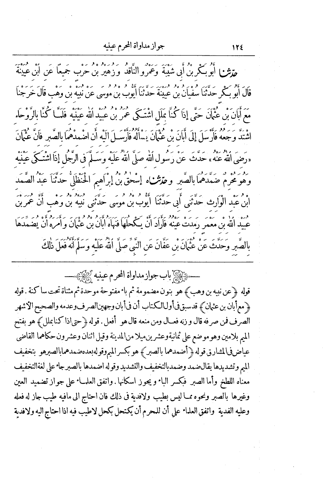 [1204] قَوْلُهُ (عَنْ نُبَيْهِ بْنِ وَهْبٍ) هُوَ بِنُونٍ مَضْمُومَةٍ ثُمَّ بَاءٍ مَفْتُوحَةٍ مُوَحَّدَةٍ ثُمَّ مُثَنَّاةٍ تَحْتَ سَاكِنَةٍ قَوْلُهُ (مَعَ أَبَانِ بْنِ عُثْمَانَ) قَدْ سَبَقَ فِي أَوَّلِ الْكِتَابِ أَنَّ فِي أَبَانٍ وَجْهَيْنِ الصَّرْفُ وَعَدَمُهُ وَالصَّحِيحُ الْأَشْهَرُ الصَّرْفُ فَمَنْ صَرَفَهُ قَالَ وَزْنُهُ فَعَالٌ وَمَنْ مَنَعَهُ قَالَ هُوَ أَفْعَلُ قَوْلُهُ (حَتَّى إِذَا كُنَّا بِمَلَلٍ) هُوَ بِفَتْحِ الْمِيمِ بِلَامَيْنِ وَهُوَ مَوْضِعٌ عَلَى ثَمَانِيَةٍ وَعِشْرِينَ مِيلًا مِنَ الْمَدِينَةِ وَقِيلَ اثْنَانِ وَعِشْرُونَ حَكَاهُمَا الْقَاضِي عِيَاضٌ فِي الْمَشَارِقِ قَوْلُهُ (اضْمِدْهُمَا بِالصَّبِرِ) هُوَ بِكَسْرِ الْمِيمِ وَقَوْلُهُ بَعْدَهُ ضَمَّدَهُمَا بِالصَّبِرِ هُوَ بِتَخْفِيفِ الْمِيمِ وَتَشْدِيدِهَا يُقَالُ ضَمَدَ وَضَمَّدَ بِالتَّخْفِيفِ وَالتَّشْدِيدِ وَقَوْلُهُ اضْمِدْهَا بِالصَّبِرِ جَاءَ عَلَى لُغَةِ التَّخْفِيفِ مَعْنَاهُ اللَّطْخُ وَأَمَّا الصَّبِرُ فَبِكَسْرِ الْبَاءِ وَيَجُوزُ إِسْكَانُهَا وَاتَّفَقَ الْعُلَمَاءُ عَلَى جَوَازِ تَضْمِيدِ الْعَيْنِ وَغَيْرِهَا بِالصَّبِرِ وَنَحْوِهِ مِمَّا لَيْسَ بِطِيبٍ وَلَا فِدْيَةَ فِي ذَلِكَ فَإِنِ احْتَاجَ إِلَى مَا فِيهِ طِيبٌ جَازَ لَهُ فعله وعليه الفدية وَاتَّفَقَ الْعُلَمَاءُ عَلَى أَنَّ لِلْمُحْرِمِ أَنْ يَكْتَحِلَ بِكُحْلٍ لَا طِيبَ فِيهِ إِذَا احْتَاجَ إِلَيْهِ ولا فدية