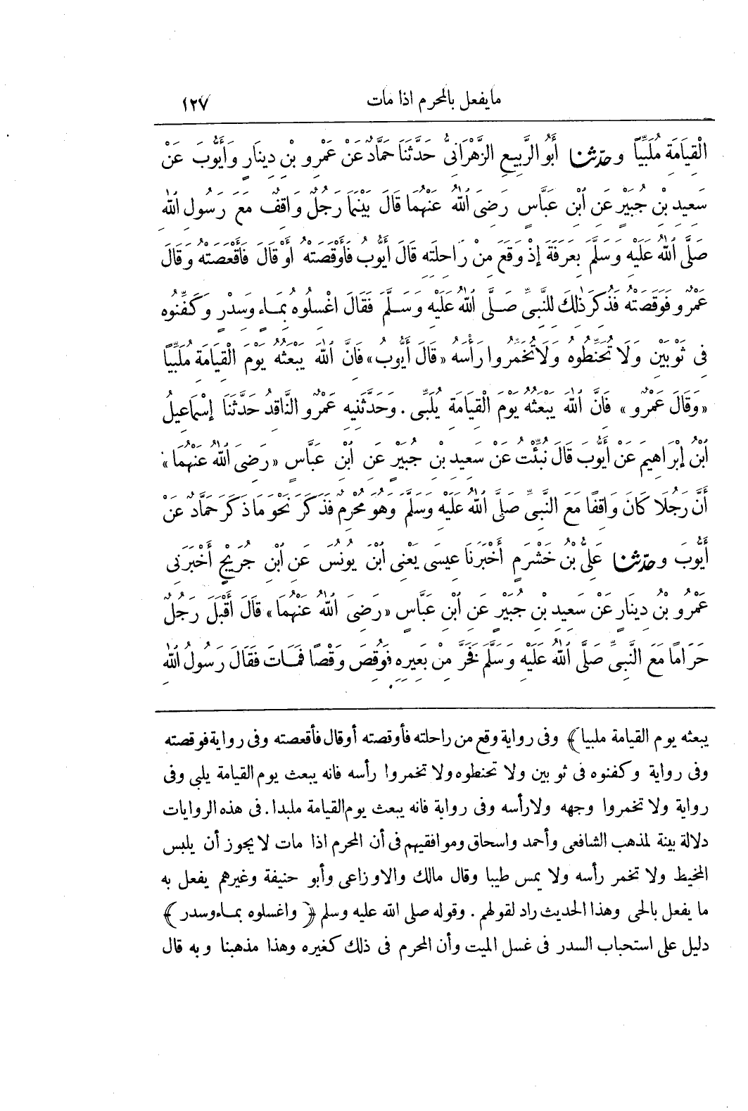 يَبْعَثُهُ يَوْمَ الْقِيَامَةِ مُلَبِّيًا) وَفِي رِوَايَةٍ وَقَعَ مِنْ رَاحِلَتِهِ فَأَوْقَصَتْهُ أَوْ قَالَ فَأَقْعَصَتْهُ وَفِي رِوَايَةٍ فَوَقَصَتْهُ وَفِي رِوَايَةٍ وَكَفِّنُوهُ فِي ثَوْبَيْنِ وَلَا تُحَنِّطُوهُ وَلَا تُخَمِّرُوا رَأْسَهُ فَإِنَّهُ يُبْعَثُ يوم القيامة يلبي وفي رواية ولا تُخَمِّرُوا وَجْهَهُ وَلَا رَأْسَهُ وَفِي رِوَايَةٍ فَإِنَّهُ يُبْعَثُ يَوْمَ الْقِيَامَةِ مُلَبِّدًا فِي هَذِهِ الرِّوَايَاتِ دَلَالَةٌ بَيِّنَةٌ لِمَذْهَبِ الشَّافِعِيِّ وَأَحْمَدَ وَإِسْحَاقَ وَمُوَافِقِيهِمْ فِي أَنَّ الْمُحْرِمَ إِذَا مَاتَ لَا يَجُوزُ أن يلبس المخيط ولا تخمر رَأْسُهُ وَلَا يَمَسَّ طِيبًا وَقَالَ مَالِكٌ وَالْأَوْزَاعِيُّ وَأَبُو حَنِيفَةَ وَغَيْرُهُمْ يُفْعَلُ بِهِ مَا يُفْعَلُ بِالْحَيِّ وَهَذَا الْحَدِيثُ رَادٌّ لِقَوْلِهِمْ وَقَوْلُهُ صَلَّى اللَّهُ عَلَيْهِ وَسَلَّمَ (وَاغْسِلُوهُ بِمَاءٍ وَسِدْرٍ) دَلِيلٌ عَلَى اسْتِحْبَابِ السِّدْرِ فِي غُسْلِ الْمَيِّتِ وَأَنَّ الْمُحْرِمَ فِي ذَلِكَ كَغَيْرِهِ وَهَذَا مَذْهَبُنَا وَبِهِ قال