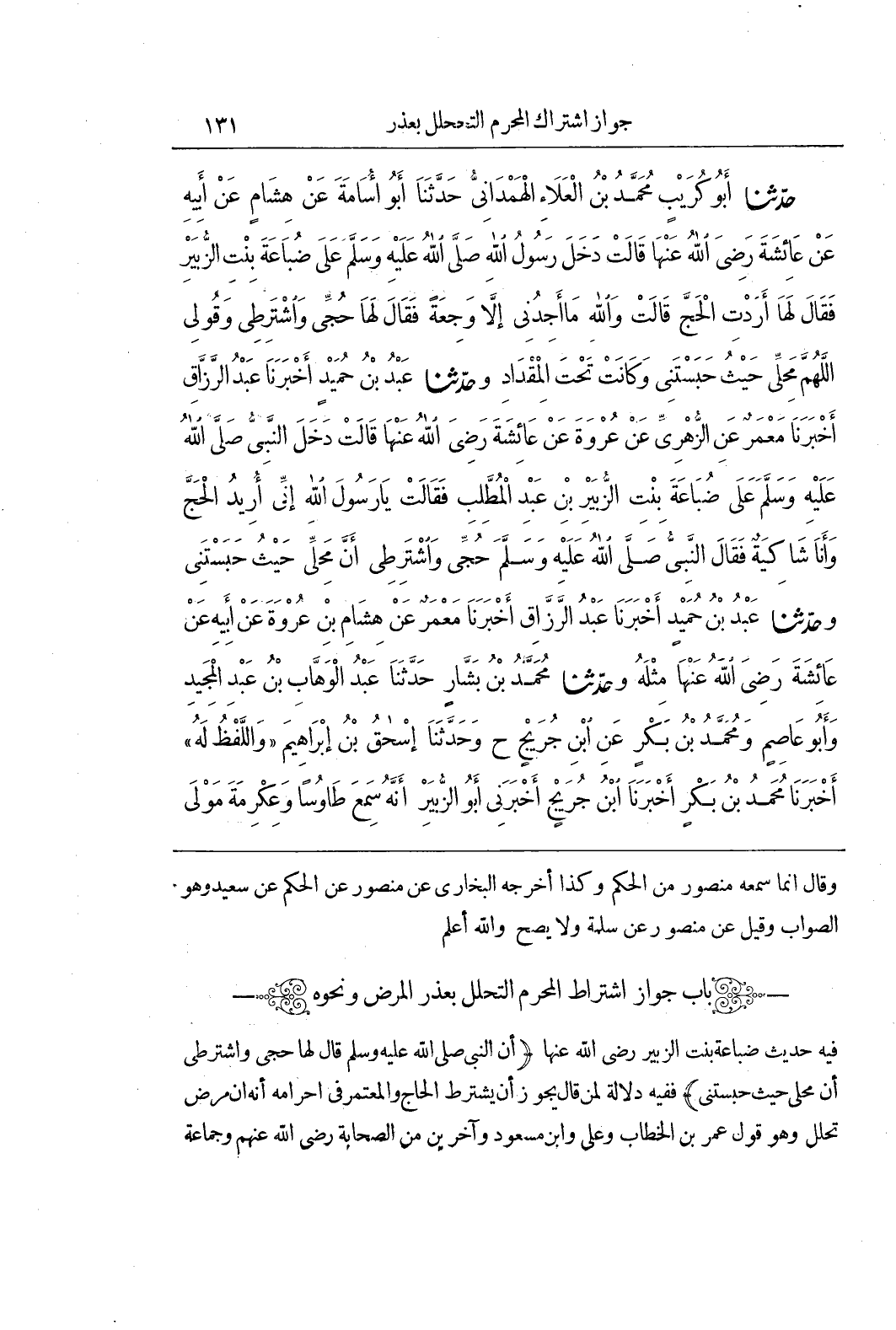 [1207] فِيهِ حَدِيثُ ضُبَاعَةَ بِنْتِ الزُّبَيْرِ رَضِيَ اللَّهُ عَنْهَا (أَنَّ النَّبِيَّ صَلَّى اللَّهُ عَلَيْهِ وَسَلَّمَ قَالَ لَهَا حُجِّي وَاشْتَرِطِي أَنَّ مَحِلِّي حَيْثُ حَبَسْتَنِي فَفِيهِ دَلَالَةٌ لِمَنْ قَالَ يَجُوزُ أَنْ يَشْتَرِطَ الْحَاجُّ وَالْمُعْتَمِرُ فِي إِحْرَامِهِ أَنَّهُ إِنْ مَرِضَ تَحَلَّلَ وَهُوَ قَوْلُ عُمَرَ بْنِ الْخَطَّابِ وعلي وبن مَسْعُودٍ وَآخَرِينَ مِنَ الصَّحَابَةِ رَضِيَ اللَّهُ عَنْهُمْ وجماعة