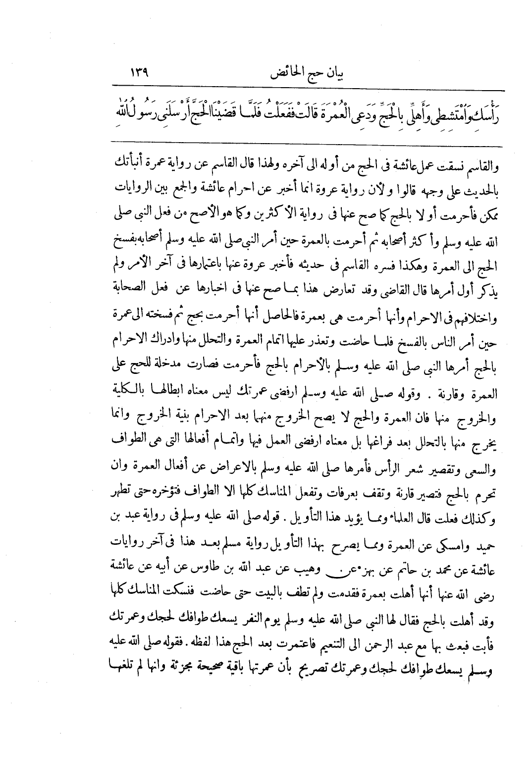 وَالْقَاسِمِ نَسَّقَتْ عَمَلَ عَائِشَةَ فِي الْحَجِّ مِنْ أَوَّلِهِ إِلَى آخِرِهِ وَلِهَذَا قَالَ الْقَاسِمُ عَنْ رِوَايَةِ عَمْرَةَ أَنْبَأَتْكَ بِالْحَدِيثِ عَلَى وَجْهِهِ قَالُوا وَلِأَنَّ رِوَايَةَ عُرْوَةَ إِنَّمَا أَخْبَرَ عَنْ إِحْرَامِ عَائِشَةَ وَالْجَمْعُ بَيْنَ الرِّوَايَاتِ مُمْكِنٌ فَأَحْرَمَتْ أَوَّلًا بِالْحَجِّ كَمَا صَحَّ عَنْهَا فِي رِوَايَةِ الْأَكْثَرِينَ وَكَمَا هُوَ الْأَصَحُّ مِنْ فِعْلِ النَّبِيِّ صَلَّى اللَّهُ عَلَيْهِ وَسَلَّمَ وَأَكْثَرِ أَصْحَابِهِ ثُمَّ أَحْرَمَتْ بِالْعُمْرَةِ حِينَ أَمَرَ النَّبِيُّ صَلَّى اللَّهُ عَلَيْهِ وَسَلَّمَ أَصْحَابَهُ بِفَسْخِ الْحَجِّ إِلَى الْعُمْرَةِ وَهَكَذَا فسره الْقَاسِمُ فِي حَدِيثِهِ فَأَخْبَرَ عُرْوَةُ عَنْهَا بِاعْتِمَارِهَا فِي آخِرِ الْأَمْرِ وَلَمْ يَذْكُرْ أَوَّلَ أَمْرِهَا قَالَ الْقَاضِي وَقَدْ تَعَارَضَ هَذَا بِمَا صَحَّ عَنْهَا فِي إِخْبَارِهَا عَنْ فِعْلِ الصَّحَابَةِ وَاخْتِلَافِهِمْ فِي الْإِحْرَامِ وَأَنَّهَا أَحْرَمَتْ هِيَ بِعُمْرَةٍ فَالْحَاصِلُ أَنَّهَا أَحْرَمَتْ بِحَجٍّ ثُمَّ فَسَخَتْهُ إِلَى عُمْرَةٍ حِينَ أَمَرَ النَّاسَ بِالْفَسْخِ فَلَمَّا حَاضَتْ وَتَعَذَّرَ عَلَيْهَا إِتْمَامُ الْعُمْرَةِ وَالتَّحَلُّلُ مِنْهَا وَإِدْرَاكُ الْإِحْرَامِ بِالْحَجِّ أَمَرَهَا النَّبِيُّ صَلَّى اللَّهُ عَلَيْهِ وَسَلَّمَ بِالْإِحْرَامِ بِالْحَجِّ فَأَحْرَمَتْ فَصَارَتْ مُدْخِلَةً لِلْحَجِّ عَلَى الْعُمْرَةِ وَقَارِنَةً وَقَوْلُهُ صَلَّى اللَّهُ عَلَيْهِ وَسَلَّمَ ارْفُضِي عُمْرَتَكِ لَيْسَ مَعْنَاهُ إِبْطَالُهَا بِالْكُلِّيَّةِ وَالْخُرُوجُ مِنْهَا فَإِنَّ الْعُمْرَةَ وَالْحَجَّ لَا يَصِحُّ الْخُرُوجُ مِنْهُمَا بَعْدَ الْإِحْرَامِ بِنِيَّةِ الْخُرُوجِ وَإِنَّمَا يَخْرُجُ مِنْهَا بِالتَّحَلُّلِ بَعْدَ فَرَاغِهَا بَلْ مَعْنَاهُ ارْفُضِي الْعَمَلَ فِيهَا وَإِتْمَامَ أَفْعَالِهَا الَّتِي هِيَ الطَّوَافُ وَالسَّعْيُ وَتَقْصِيرُ شَعْرِ الرَّأْسِ فَأَمَرَهَا صَلَّى اللَّهُ عَلَيْهِ وَسَلَّمَ بِالْإِعْرَاضِ عَنْ أَفْعَالِ الْعُمْرَةِ وَأَنْ تُحْرِمَ بِالْحَجِّ فَتَصِيرَ قَارِنَةً وَتَقِفَ بِعَرَفَاتٍ وَتَفْعَلَ الْمَنَاسِكَ كُلَّهَا إِلَّا الطَّوَافَ فَتُؤَخِّرَهُ حَتَّى تَطْهُرَ وَكَذَلِكَ فَعَلَتْ قَالَ الْعُلَمَاءُ وَمِمَّا يُؤَيِّدُ هَذَا التَّأْوِيلَ قَوْلُهُ صَلَّى اللَّهُ عَلَيْهِ وَسَلَّمَ فِي رِوَايَةِ عَبْدِ بْنِ حُمَيْدٍ وَأَمْسِكِي عَنِ الْعُمْرَةِ وَمِمَّا يُصَرِّحُ بِهَذَا التَّأْوِيلِ رِوَايَةُ مُسْلِمٍ بَعْدَ هَذَا فِي آخِرِ رِوَايَاتِ عَائِشَةَ عَنْ مُحَمَّدِ بْنِ حَاتِمٍ عَنْ بَهْزٍ عَنْ وُهَيْبٍ عَنْ عَبْدِ اللَّهِ بْنِ طَاوُسٍ عَنْ أَبِيهِ عَنْ عَائِشَةَ رَضِيَ اللَّهُ عَنْهَا أَنَّهَا أَهَلَّتْ بِعُمْرَةٍ فَقَدِمَتْ وَلَمْ تَطُفْ بِالْبَيْتِ حَتَّى حَاضَتْ فَنَسَكَتِ الْمَنَاسِكَ كُلَّهَا وَقَدْ أَهَلَّتْ بِالْحَجِّ فَقَالَ لَهَا النَّبِيُّ صَلَّى اللَّهُ عَلَيْهِ وَسَلَّمَ يَوْمَ النَّفْرِ يَسَعُكِ طَوَافُكِ لِحَجِّكِ وَعُمْرَتِكِ فَأَبَتْ فَبَعَثَ بِهَا مَعَ عَبْدِ الرَّحْمَنِ إِلَى التَّنْعِيمِ فَاعْتَمَرَتْ بَعْدَ الْحَجِّ هَذَا لَفْظُهُ فَقَوْلُهُ صَلَّى اللَّهُ عَلَيْهِ وَسَلَّمَ يَسَعُكِ طَوَافُكِ لِحَجِّكِ وَعُمْرَتِكِ تَصْرِيحٌ بِأَنَّ عُمْرَتَهَا بَاقِيَةٌ صَحِيحَةٌ مُجْزِئَةٌ وَأَنَّهَا لَمْ تُلْغِهَا