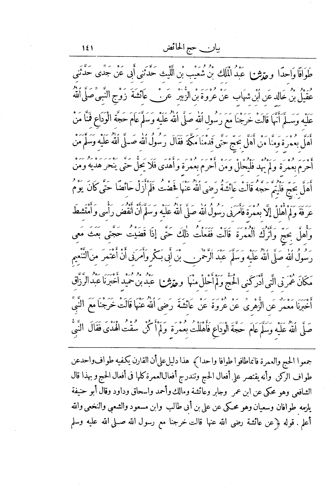 جَمَعُوا الْحَجَّ وَالْعُمْرَةَ فَإِنَّمَا طَافُوا طَوَافًا وَاحِدًا) هَذَا دَلِيلٌ عَلَى أَنَّ الْقَارِنَ يَكْفِيهِ طَوَافٌ وَاحِدٌ عَنْ طَوَافِ الرُّكْنِ وَأَنَّهُ يَقْتَصِرُ عَلَى أَفْعَالِ الْحَجِّ وَتَنْدَرِجُ أَفْعَالُ الْعُمْرَةِ كُلُّهَا فِي أَفْعَالِ الْحَجِّ وَبِهَذَا قَالَ الشَّافِعِيُّ وَهُوَ مَحْكِيٌّ عن بن عُمَرَ وَجَابِرٍ وَعَائِشَةَ وَمَالِكٍ وَأَحْمَدَ وَإِسْحَاقَ وَدَاوُدَ وَقَالَ أَبُو حَنِيفَةَ يَلْزَمُهُ طَوَافَانِ وَسَعْيَانِ وَهُوَ محكي عن علي بن أبي طالب وبن مسعود والشعبي والنخعي والله أعلم قولهن (عَنْ عَائِشَةَ رَضِيَ اللَّهُ عَنْهَا قَالَتْ خَرَجْنَا مَعَ رَسُولِ اللَّهِ صَلَّى اللَّهُ عَلَيْهِ وَسَلَّمَ