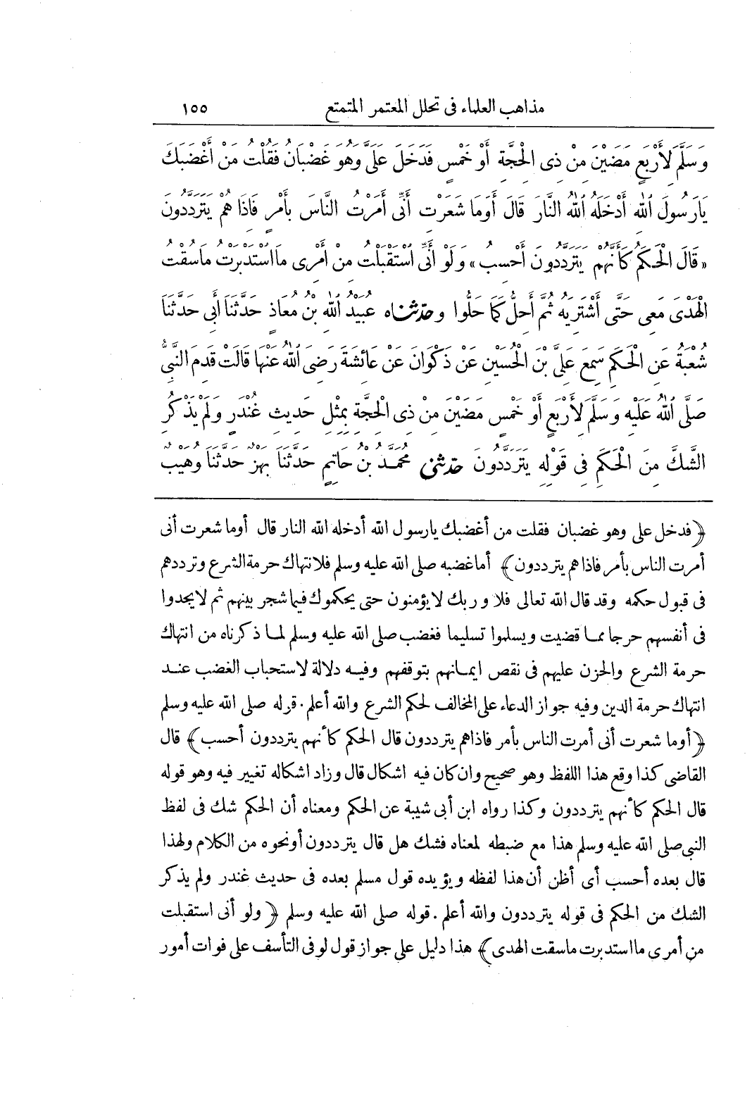 (فَدَخَلَ عَلَيَّ وَهُوَ غَضْبَانُ فَقُلْتُ مَنْ أَغْضَبَكَ يَا رَسُولَ اللَّهِ أَدْخَلَهُ اللَّهُ النَّارَ قَالَ أو ما شَعَرْتِ أَنِّي أَمَرْتُ النَّاسَ بِأَمْرٍ فَإِذَا هُمْ يَتَرَدَّدُونَ) أَمَّا غَضَبُهُ صَلَّى اللَّهُ عَلَيْهِ وَسَلَّمَ فَلِانْتِهَاكِ حُرْمَةِ الشَّرْعِ وَتَرَدُّدِهِمْ فِي قَبُولِ حُكْمِهِ وَقَدْ قَالَ اللَّهُ تَعَالَى فَلَا وَرَبِّكَ لَا يُؤْمِنُونَ حَتَّى يُحَكِّمُوكَ فِيمَا شَجَرَ بَيْنَهُمْ ثُمَّ لَا يَجِدُوا فِي أَنْفُسِهِمْ حَرَجًا مِمَّا قَضَيْتَ ويسلموا تسليما فَغَضِبَ صَلَّى اللَّهُ عَلَيْهِ وَسَلَّمَ لِمَا ذَكَرْنَاهُ مِنَ انْتَهَاكِ حُرْمَةِ الشَّرْعِ وَالْحُزْنِ عَلَيْهِمْ فِي نَقْصِ إِيمَانِهِمْ بِتَوَقُّفِهِمْ وَفِيهِ دَلَالَةٌ لِاسْتِحْبَابِ الْغَضَبِ عِنْدَ انْتَهَاكِ حُرْمَةِ الدِّينِ وَفِيهِ جَوَازُ الدُّعَاءِ عَلَى الْمُخَالِفِ لِحُكْمِ الشَّرْعِ وَاللَّهُ أَعْلَمُ قَوْلُهُ صَلَّى اللَّهُ عَلَيْهِ وَسَلَّمَ (أَوَمَا شَعَرْتِ أَنِّي أَمَرْتُ النَّاسَ بِأَمْرٍ فَإِذَا هُمْ يَتَرَدَّدُونَ قَالَ الْحَكَمُ كَأَنَّهُمْ يَتَرَدَّدُونَ أَحْسِبُ) قَالَ الْقَاضِي كَذَا وَقَعَ هَذَا اللَّفْظُ وَهُوَ صَحِيحٌ وَإِنْ كَانَ فِيهِ إِشْكَالٌ قَالَ وَزَادَ إِشْكَالَهُ تَغْيِيرٌ فِيهِ وَهُوَ قَوْلُهُ قَالَ الْحَكَمُ كَأَنَّهُمْ يَتَرَدَّدُونَ وَكَذَا رواه بن أَبِي شَيْبَةَ عَنِ الْحَكَمِ وَمَعْنَاهُ أَنَّ الْحَكَمَ شَكَّ فِي لَفْظِ النَّبِيِّ صَلَّى اللَّهُ عَلَيْهِ وَسَلَّمَ هَذَا مَعَ ضَبْطِهِ لِمَعْنَاهُ فَشَكَّ هَلْ قَالَ يَتَرَدَّدُونَ أَوْ نَحْوَهُ مِنَ الْكَلَامِ وَلِهَذَا قَالَ بَعْدَهُ أَحْسِبُ أَيْ أَظُنُّ أَنَّ هَذَا لَفْظُهُ وَيُؤَيِّدُهُ قَوْلُ مُسْلِمٍ بَعْدَهُ فِي حَدِيثِ غُنْدَرٍ وَلَمْ يَذْكُرِ الشَّكَّ مِنَ الْحَكَمِ فِي قَوْلِهِ يَتَرَدَّدُونَ وَاللَّهُ أَعْلَمُ قَوْلُهُ صَلَّى اللَّهُ عَلَيْهِ وَسَلَّمَ (وَلَوْ أَنِّي اسْتَقْبَلْتُ مِنْ أَمْرِي مَا اسْتَدْبَرْتُ مَا سُقْتُ الْهَدْيَ) هَذَا دَلِيلٌ عَلَى جَوَازِ قَوْلِ لَوْ فِي التَّأَسُّفِ عَلَى فوات أمور
