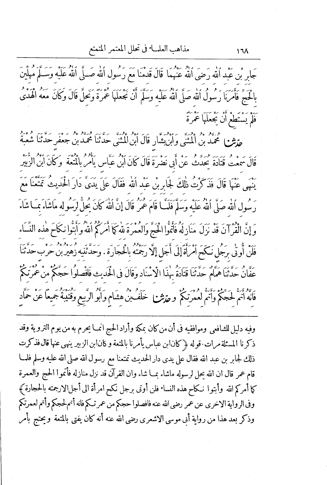 [1217] قوله (كان بن عباس يأمرنا بالمتعة وكان بن الزُّبَيْرِ يَنْهَى عَنْهَا قَالَ فَذَكَرْتُ ذَلِكَ لِجَابِرِ بْنِ عَبْدِ اللَّهِ فَقَالَ عَلَى يَدَيَّ دَارَ الْحَدِيثُ تَمَتَّعْنَا مَعَ رَسُولِ اللَّهِ صَلَّى اللَّهُ عَلَيْهِ وَسَلَّمَ فَلَمَّا قَامَ عُمَرُ قَالَ إِنَّ اللَّهَ يُحِلُّ لِرَسُولِهِ مَا شَاءَ بِمَا شَاءَ وَإِنَّ الْقُرْآنَ قَدْ نَزَلَ مَنَازِلَهُ فَأَتِمُّوا الْحَجَّ وَالْعُمْرَةَ كَمَا أَمَرَكُمُ اللَّهُ وَأَبِتُّوا نِكَاحَ هَذِهِ النِّسَاءِ فَلَنْ أُوتَى بِرَجُلٍ نَكَحَ امْرَأَةً إِلَى أَجَلٍ إِلَّا رَجَمْتُهُ بِالْحِجَارَةِ) وَفِي الرِّوَايَةِ الْأُخْرَى عَنْ عُمَرَ رَضِيَ اللَّهُ عَنْهُ فَافْصِلُوا حَجَّكُمْ مِنْ عُمْرَتِكُمْ فَإِنَّهُ أَتَمُّ لِحَجِّكُمْ وَأَتَمُّ لِعُمْرَتِكُمْ وَذَكَرَ بَعْدَ هَذَا مِنْ رِوَايَةِ أَبِي مُوسَى الْأَشْعَرِيِّ رَضِيَ اللَّهُ عَنْهُ أَنَّهُ كَانَ يُفْتِي بِالْمُتْعَةِ وَيَحْتَجُّ بِأَمْرِ