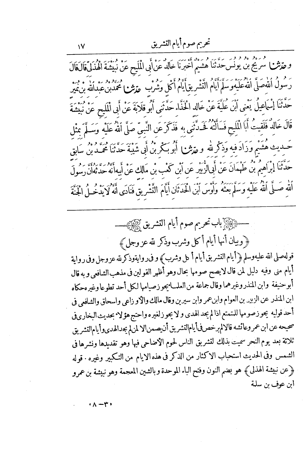 [1141] قَوْلُهُ صَلَّى اللَّهُ عَلَيْهِ وَسَلَّمَ (أَيَّامُ التَّشْرِيقِ أَيَّامُ أَكْلٍ وَشُرْبٍ) وَفِي رِوَايَةٍ وَذِكْرٍ لِلَّهِ عَزَّ وَجَلَّ وَفِي رِوَايَةٍ أَيَّامُ مِنًى وَفِيهِ دَلِيلٌ لِمَنْ قَالَ لَا يَصِحُّ صَوْمُهَا بِحَالٍ وَهُوَ أَظْهَرُ الْقَوْلَيْنِ فِي مَذْهَبِ الشَّافِعِيِّ وَبِهِ قال أبو حنيفة وبن الْمُنْذِرِ وَغَيْرُهُمَا وَقَالَ جَمَاعَةٌ مِنَ الْعُلَمَاءِ يَجُوزُ صيامها لكل أحد تطوعا وغيره حكاه بن المنذر عن الزبير بن العوام وبن عمر وبن سِيرِينَ وَقَالَ مَالِكٌ وَالْأَوْزَاعِيُّ وَإِسْحَاقُ وَالشَّافِعِيُّ فِي أحد قوليه يجوز صومها للمتمتع إِذَا لَمْ يَجِدِ الْهَدْيَ وَلَا يَجُوزُ لِغَيْرِهِ وَاحْتَجَّ هَؤُلَاءِ بِحَدِيثِ الْبُخَارِيِّ فِي صَحِيحِهِ عَنِ بن عُمَرَ وَعَائِشَةَ قَالَا لَمْ يُرَخِّصْ فِي أَيَّامِ التَّشْرِيقِ أَنْ يُصَمْنَ إِلَّا لِمَنْ لَمْ يَجِدِ الْهَدْيَ وَأَيَّامُ التَّشْرِيقِ ثَلَاثَةٌ بَعْدَ يَوْمِ النَّحْرِ سُمِّيَتْ بِذَلِكَ لِتَشْرِيقِ النَّاسِ لُحُومَ الْأَضَاحِي فِيهَا وَهُوَ تَقْدِيدُهَا وَنَشْرُهَا فِي الشَّمْسِ وَفِي الْحَدِيثِ اسْتِحْبَابُ الْإِكْثَارِ مِنَ الذِّكْرِ فِي هَذِهِ الْأَيَّامِ مِنَ التَّكْبِيرِ وَغَيْرِهِ قَوْلُهُ (عَنْ نُبَيْشَةَ الْهُذَلِيِّ) هُوَ بِضَمِّ النُّونِ وَفَتْحِ الْبَاءِ الْمُوَحَّدَةِ وَبِالشِّينِ الْمُعْجَمَةِ وَهُوَ نُبَيْشَةُ بْنُ عَمْرِو بْنِ عَوْفِ بن سلمة