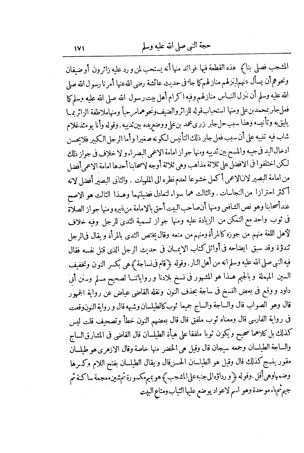 الْمِشْجَبِ فَصَلَّى بِنَا) هَذِهِ الْقِطْعَةُ فِيهَا فَوَائِدُ مِنْهَا أَنَّهُ يُسْتَحَبُّ لِمَنْ وَرَدَ عَلَيْهِ زَائِرُونَ أَوْ ضِيفَانٌ وَنَحْوُهُمْ أَنْ يَسْأَلَ عَنْهُمْ لِيُنْزِلَهُمْ مَنَازِلَهُمْ كَمَا جَاءَ فِي حَدِيثِ عَائِشَةَ رَضِيَ اللَّهُ عَنْهَا أَمَرَنَا رَسُولُ اللَّهِ صَلَّى اللَّهُ عَلَيْهِ وَسَلَّمَ أَنْ نُنْزِلَ النَّاسَ مَنَازِلَهُمْ وَفِيهِ إِكْرَامُ أَهْلِ بَيْتِ رَسُولِ اللَّهِ صَلَّى اللَّهُ عَلَيْهِ وَسَلَّمَ كَمَا فَعَلَ جَابِرٌ بِمُحَمَّدِ بْنِ عَلِيٍّ وَمِنْهَا اسْتِحْبَابُ قَوْلِهِ لِلزَّائِرِ وَالضَّيْفِ وَنَحْوِهِمَا مَرْحَبًا وَمِنْهَا مُلَاطَفَةُ الزَّائِرِ بِمَا يَلِيقُ بِهِ وَتَأْنِيسُهُ وَهَذَا سَبَبُ حَلِّ جَابِرٍ زِرَّيْ مُحَمَّدِ بْنِ عَلِيٍّ وَوَضْعِ يَدِهِ بَيْنَ ثَدْيَيْهِ وَقَوْلُهُ وَأَنَا يَوْمَئِذٍ غُلَامٌ شَابٌّ فِيهِ تَنْبِيهٌ عَلَى أَنَّ سَبَبَ فِعْلِ جَابِرٍ ذَلِكَ التَّأْنِيسَ لِكَوْنِهِ صَغِيرًا وَأَمَّا الرَّجُلُ الْكَبِيرُ فَلَا يَحْسُنُ إِدْخَالُ الْيَدِ فِي جَيْبِهِ وَالْمَسْحُ بَيْنِ ثَدْيَيْهِ وَمِنْهَا جَوَازُ إِمَامَةِ الْأَعْمَى الْبُصَرَاءَ وَلَا خِلَافَ فِي جَوَازِ ذَلِكَ لَكِنِ اخْتَلَفُوا فِي الْأَفْضَلِ عَلَى ثَلَاثَةِ مَذَاهِبٍ وَهِيَ ثَلَاثَةُ أَوْجُهٍ لِأَصْحَابِنَا أَحَدُهَا إِمَامَةُ الْأَعْمَى أَفْضَلُ مِنْ إِمَامَةِ الْبَصِيرِ لِأَنَّ الْأَعْمَى أَكْمَلُ خُشُوعًا لِعَدَمِ نَظَرِهِ إِلَى الْمُلْهِيَاتِ وَالثَّانِي الْبَصِيرُ أَفْضَلُ لِأَنَّهُ أَكْثَرُ احْتِرَازًا مِنَ النَّجَاسَاتِ وَالثَّالِثُ هُمَا سَوَاءٌ لِتَعَادُلِ فَضِيلَتِهِمَا وَهَذَا الثَّالِثُ هُوَ الْأَصَحُّ عِنْدَ أَصْحَابِنَا وَهُوَ نَصُّ الشَّافِعِيِّ وَمِنْهَا أَنَّ صَاحِبَ الْبَيْتِ أَحَقُّ بِالْإِمَامَةِ مِنْ غَيْرِهِ وَمِنْهَا جَوَازُ الصَّلَاةِ فِي ثَوْبٍ وَاحِدٍ مَعَ التَّمَكُّنِ مِنَ الزِّيَادَةِ عَلَيْهِ وَمِنْهَا جَوَازُ تَسْمِيَةِ الثَّدْيِ لِلرَّجُلِ وَفِيهِ خِلَافٌ لِأَهْلِ اللُّغَةِ مِنْهُمْ مَنْ جَوَّزَهُ كَالْمَرْأَةِ وَمِنْهُمْ مَنْ مَنَعَهُ وَقَالَ يَخْتَصُّ الثَّدْيُ بِالْمَرْأَةِ وَيُقَالُ فِي الرَّجُلِ ثُنْدُؤةٌ وَقَدْ سَبَقَ إِيضَاحُهُ فِي أَوَائِلِ كِتَابِ الْإِيمَانِ فِي حَدِيثِ الرَّجُلِ الَّذِي قَتَلَ نَفْسَهُ فَقَالَ فِيهِ النَّبِيُّ صَلَّى اللَّهُ عَلَيْهِ وَسَلَّمَ أَنَّهُ مِنْ أَهْلِ النَّارِ وَقَوْلُهُ (قَامَ فِي نِسَاجَةٍ) هِيَ بِكَسْرِ النُّونِ وَتَخْفِيفِ السِّينِ الْمُهْمَلَةِ وَبِالْجِيمِ هَذَا هُوَ الْمَشْهُورُ فِي نُسَخِ بِلَادِنَا وَرِوَايَاتِنَا لِصَحِيحِ مُسْلِمٍ وَسُنَنِ أَبِي دَاوُدَ وَوَقَعَ فِي بَعْضِ النُّسَخِ فِي سَاجَةٍ بِحَذْفِ النُّونِ وَنَقَلَهُ الْقَاضِي عِيَاضٌ عَنْ رِوَايَةِ الْجُمْهُورِ قَالَ وَهُوَ الصَّوَابُ قَالَ وَالسَّاجَةُ وَالسَّاجُ جَمِيعًا ثَوْبٌ كَالطَّيْلَسَانِ وَشِبْهِهِ قَالَ وَرِوَايَةُ النُّونِ وَقَعَتْ فِي رِوَايَةِ الْفَارِسِيِّ قَالَ وَمَعْنَاهُ ثَوْبٌ مُلَفَّقٌ قَالَ قَالَ بَعْضُهُمُ النُّونُ خَطَأٌ وَتَصْحِيفٌ قُلْتُ لَيْسَ كَذَلِكَ بَلْ كِلَاهُمَا صَحِيحٌ وَيَكُونُ ثَوْبًا مُلَفَّقًا عَلَى هَيْئَةِ الطَّيْلَسَانِ قَالَ الْقَاضِي فِي الْمَشَارِقِ السَّاجُ وَالسَّاجَةُ الطَّيْلَسَانُ وَجَمْعُهُ سِيجَانٌ قَالَ وَقِيلَ هِيَ الْخَضِرُ مِنْهَا خَاصَّةً وَقَالَ الْأَزْهَرِيُّ هُوَ طَيْلَسَانٌ مُقَوَّرٌ يُنْسَجُ كَذَلِكَ قَالَ وَقِيلَ هُوَ الطَّيْلَسَانُ الْحَسَنُ قَالَ وَيُقَالُ الطَّيْلَسَانُ بِفَتْحِ اللَّامِ وَكَسْرِهَا وَضَمِّهَا وَهِيَ أَقَلُّ وقَوْلُهُ (وَرِدَاؤُهُ إِلَى جَنْبِهِ عَلَى الْمِشْجَبِ) هُوَ بِمِيمٍ 