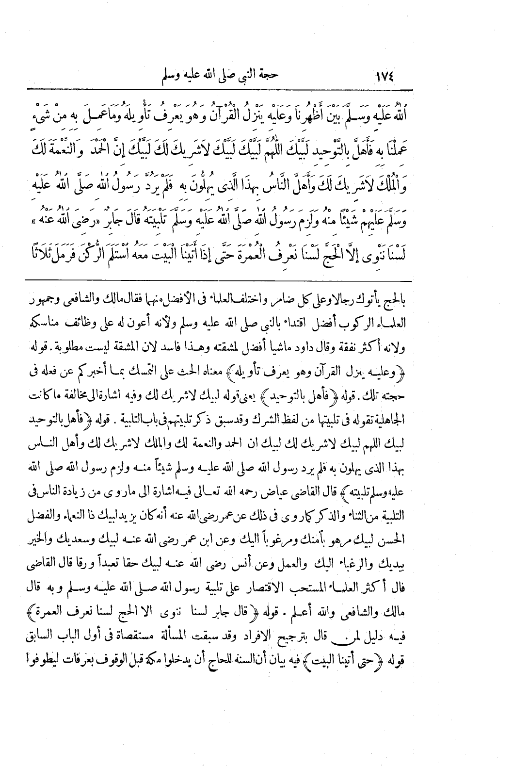 بالحج يأتوك رجالا وعلى كل ضامر وَاخْتَلَفَ الْعُلَمَاءُ فِي الْأَفْضَلِ مِنْهُمَا فَقَالَ مَالِكٌ وَالشَّافِعِيُّ وَجُمْهُورُ الْعُلَمَاءِ الرُّكُوبُ أَفْضَلُ اقْتِدَاءً بِالنَّبِيِّ صَلَّى اللَّهُ عَلَيْهِ وَسَلَّمَ وَلِأَنَّهُ أَعْوَنُ لَهُ عَلَى وَظَائِفِ مَنَاسِكِهِ وَلِأَنَّهُ أَكْثَرُ نَفَقَةً وَقَالَ دَاوُدُ مَاشِيًا أَفْضَلُ لِمَشَقَّتِهِ وَهَذَا فَاسِدٌ لِأَنَّ الْمَشَقَّةَ لَيْسَتْ مَطْلُوبَةً قَوْلُهُ (وَعَلَيْهِ يَنْزِلُ الْقُرْآنُ وَهُوَ يَعْرِفُ تَأْوِيلَهُ) مَعْنَاهُ الْحَثُّ عَلَى التَّمَسُّكِ بِمَا أُخْبِرُكُمْ عَنْ فِعْلِهِ فِي حَجَّتِهِ تِلْكَ قَوْلُهُ (فَأَهَلَّ بِالتَّوْحِيدِ) يَعْنِي قَوْلَهُ لَبَّيْكَ لَا شَرِيكَ لَكَ وَفِيهِ إِشَارَةٌ إِلَى مُخَالَفَةِ مَا كانت الجاهلية تقوله فِي تَلْبِيَتِهَا مِنْ لَفْظِ الشِّرْكِ وَقَدْ سَبَقَ ذِكْرُ تَلْبِيَتِهِمْ فِي بَابِ التَّلْبِيَةِ قَوْلُهُ (فَأَهَلَّ بِالتَّوْحِيدِ لَبَّيْكَ اللَّهُمَّ لَبَّيْكَ لَا شَرِيكَ لَكَ لَبَّيْكَ إِنَّ الْحَمْدَ وَالنِّعْمَةَ لَكَ وَالْمُلْكَ لَا شَرِيكَ لَكَ وَأَهَلَّ النَّاسُ بِهَذَا الَّذِي يُهِلُّونَ بِهِ فَلَمْ يَرُدَّ رَسُولُ اللَّهِ صَلَّى اللَّهُ عَلَيْهِ وَسَلَّمَ شَيْئًا مِنْهُ وَلَزِمَ رَسُولُ اللَّهِ صَلَّى اللَّهُ عَلَيْهِ وَسَلَّمَ تَلْبِيَتَهُ) قَالَ الْقَاضِي عِيَاضٌ رَحِمَهُ اللَّهُ تَعَالَى فِيهِ إِشَارَةٌ إِلَى مَا رُوِيَ مِنْ زِيَادَةِ النَّاسِ فِي التَّلْبِيَةِ مِنَ الثَّنَاءِ وَالذِّكْرِ كَمَا رُوِيَ فِي ذَلِكَ عَنْ عُمَرَ رَضِيَ اللَّهُ عَنْهُ أَنَّهُ كَانَ يَزِيدُ لَبَّيْكَ ذَا النَّعْمَاءِ وَالْفَضْلِ الْحَسَنِ لَبَّيْكَ مرهوبا منك ومرغوبا اليك وعن بن عُمَرَ رَضِيَ اللَّهُ عَنْهُ لَبَّيْكَ وَسَعْدَيْكَ وَالْخَيْرُ بِيَدَيْكَ وَالرَّغْبَاءُ إِلَيْكَ وَالْعَمَلُ وَعَنْ أَنَسٍ رَضِيَ اللَّهُ عَنْهُ لَبَّيْكَ حَقًّا تَعَبُّدًا وَرِقًّا قَالَ الْقَاضِي قَالَ أَكْثَرُ الْعُلَمَاءِ الْمُسْتَحَبُّ الِاقْتِصَارُ عَلَى تَلْبِيَةِ رَسُولِ اللَّهِ صَلَّى اللَّهُ عَلَيْهِ وَسَلَّمَ وَبِهِ قَالَ مَالِكٌ وَالشَّافِعِيُّ وَاللَّهُ أَعْلَمُ قَوْلُهُ (قَالَ جَابِرٌ لَسْنَا نَنْوِي إِلَّا الْحَجَّ لَسْنَا نَعْرِفُ الْعُمْرَةَ) فِيهِ دَلِيلٌ لِمَنْ قَالَ بِتَرْجِيحِ الْإِفْرَادِ وَقَدْ سَبَقَتِ الْمَسْأَلَةُ مُسْتَقْصَاةً فِي أَوَّلِ الْبَابِ السَّابِقِ قَوْلُهُ (حَتَّى أَتَيْنَا الْبَيْتَ) فِيهِ بَيَانُ أَنَّ السُّنَّةَ لِلْحَاجِّ أَنْ يَدْخُلُوا مَكَّةَ قَبْلَ الْوُقُوفِ بِعَرَفَاتٍ لِيَطُوفُوا