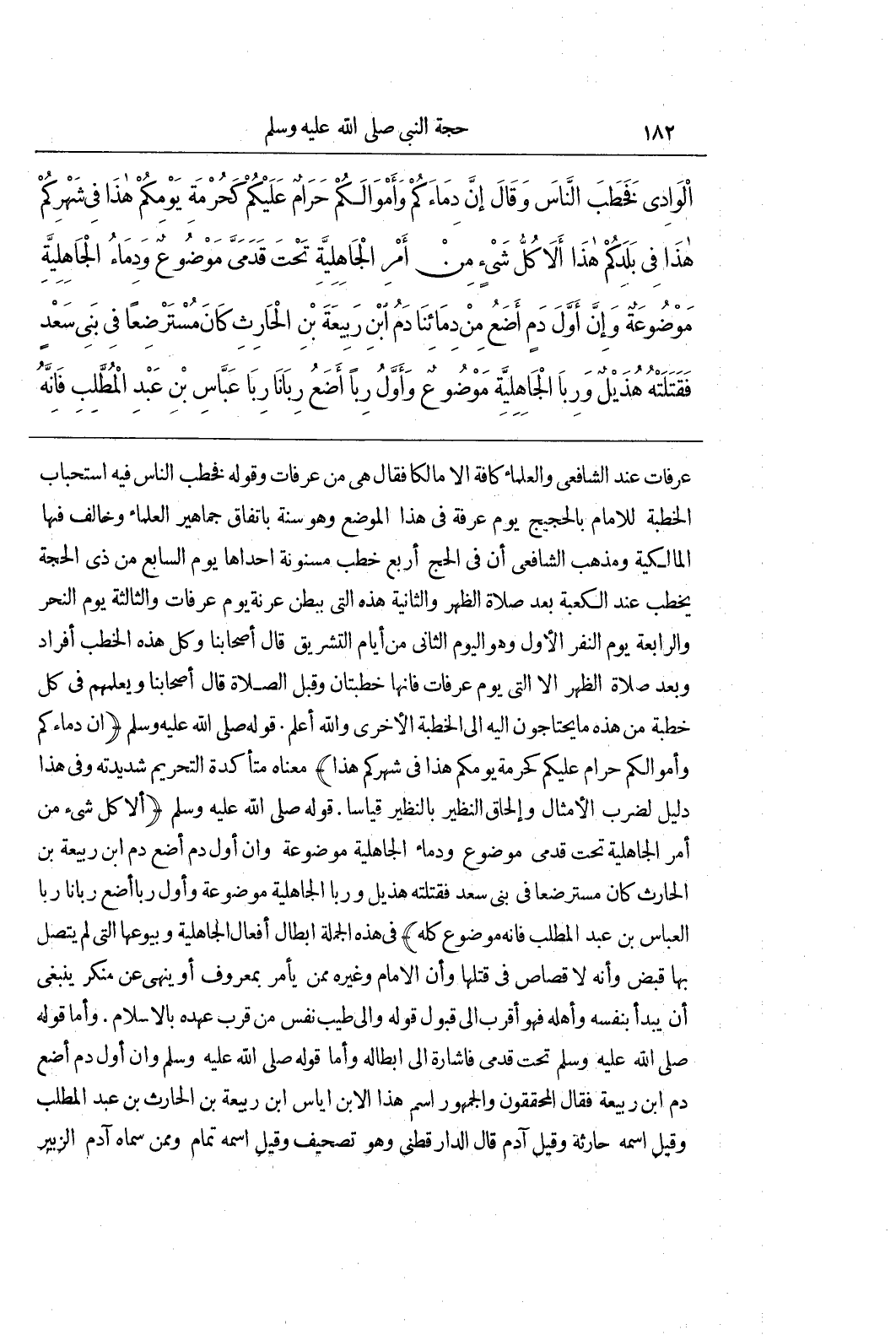 عَرَفَاتٍ عِنْدَ الشَّافِعِيِّ وَالْعُلَمَاءِ كَافَّةً إِلَّا مَالِكًا فَقَالَ هِيَ مِنْ عَرَفَاتٍ وَقَوْلُهُ فَخَطَبَ النَّاسَ فِيهِ اسْتِحْبَابُ الْخُطْبَةِ لِلْإِمَامِ بِالْحَجِيجِ يَوْمَ عَرَفَةَ فِي هَذَا الْمَوْضِعِ وَهُوَ سُنَّةٌ بِاتِّفَاقِ جَمَاهِيرِ الْعُلَمَاءِ وَخَالَفَ فِيهَا الْمَالِكِيَّةُ وَمَذْهَبُ الشَّافِعِيِّ أَنَّ فِي الْحَجِّ أَرْبَعَ خُطَبٍ مَسْنُونَةً إِحْدَاهَا يَوْمَ السَّابِعِ مِنْ ذِي الْحِجَّةِ يَخْطُبُ عِنْدَ الْكَعْبَةِ بَعْدَ صَلَاةِ الظُّهْرِ وَالثَّانِيَةُ هَذِهِ الَّتِي بِبَطْنِ عُرَنَةَ يَوْمَ عَرَفَاتٍ وَالثَّالِثَةُ يَوْمَ النَّحْرِ وَالرَّابِعَةُ يَوْمَ النَّفْرِ الْأَوَّلِ وَهُوَ الْيَوْمُ الثَّانِي مِنْ أَيَّامِ التَّشْرِيقِ قَالَ أَصْحَابُنَا وَكُلُّ هَذِهِ الْخُطَبُ أَفْرَادٌ وَبَعْدَ صَلَاةِ الظُّهْرِ إِلَّا الَّتِي يَوْمَ عَرَفَاتٍ فَإِنَّهَا خُطْبَتَانِ وَقَبْلَ الصَّلَاةِ قَالَ أَصْحَابُنَا وَيُعَلِّمُهُمْ فِي كُلِّ خُطْبَةٍ مِنْ هَذِهِ مَا يَحْتَاجُونَ إِلَيْهِ إِلَى الْخُطْبَةِ الْأُخْرَى وَاللَّهُ أَعْلَمُ قَوْلُهُ صَلَّى اللَّهُ عَلَيْهِ وَسَلَّمَ (إِنَّ دِمَاءَكُمْ وَأَمْوَالَكُمْ حَرَامٌ عَلَيْكُمْ كَحُرْمَةِ يَوْمِكُمْ هَذَا فِي شَهْرِكُمْ هَذَا) مَعْنَاهُ مُتَأَكِّدَةُ التَّحْرِيمِ شَدِيدَتُهُ وَفِي هَذَا دَلِيلٌ لِضَرْبِ الْأَمْثَالِ وَإِلْحَاقِ النَّظِيرِ بِالنَّظِيرِ قِيَاسًا قَوْلُهُ صَلَّى اللَّهُ عَلَيْهِ وَسَلَّمَ (أَلَا كُلُّ شَيْءٍ مِنْ أَمْرِ الْجَاهِلِيَّةِ تَحْتَ قَدَمَيَّ مَوْضُوعٌ وَدِمَاءُ الْجَاهِلِيَّةِ مَوْضُوعَةٌ وَإِنَّ أَوَّلَ دَمٍ أضع دم بن رَبِيعَةَ بْنِ الْحَارِثِ كَانَ مُسْتَرْضِعًا فِي بَنِي سعد فقتلته هذيل وربا الجاهلية موضوعة وَأَوَّلُ رِبًا أَضَعُ رِبَانَا رِبَا الْعَبَّاسِ بْنِ عَبْدِ الْمُطَّلِبِ فَإِنَّهُ مَوْضُوعٌ كُلُّهُ) فِي هَذِهِ الْجُمْلَةِ إِبْطَالُ أَفْعَالِ الْجَاهِلِيَّةِ وَبُيُوعِهَا الَّتِي لَمْ يَتَّصِلْ بِهَا قَبْضٌ وَأَنَّهُ لَا قِصَاصَ فِي قَتْلِهَا وَأَنَّ الْإِمَامَ وَغَيْرَهُ مِمَّنْ يَأْمُرُ بِمَعْرُوفٍ أَوْ يَنْهَى عَنْ مُنْكَرٍ يَنْبَغِي أَنْ يَبْدَأَ بِنَفْسِهِ وَأَهْلِهِ فَهُوَ أَقْرَبُ إِلَى قَبُولِ قَوْلِهِ وَإِلَى طِيبِ نَفْسِ مَنْ قَرُبَ عَهْدُهُ بِالْإِسْلَامِ وَأَمَّا قَوْلُهُ صَلَّى اللَّهُ عَلَيْهِ وَسَلَّمَ تَحْتَ قَدَمَيَّ فَإِشَارَةٌ إِلَى إِبْطَالِهِ وَأَمَّا قَوْلُهُ صَلَّى اللَّهُ عَلَيْهِ وَسَلَّمَ وَإِنَّ أَوَّلَ دَمٍ أَضَعُ دم بن رَبِيعَةَ فَقَالَ الْمُحَقِّقُونَ وَالْجُمْهُورُ اسْمُ هَذَا الِابْنِ إِيَاسُ بْنَ رَبِيعَةَ بْنِ الْحَارِثِ بْنِ عَبْدِ الْمُطَّلِبِ وَقِيلَ اسْمُهُ حَارِثَةُ وَقِيلَ آدَمُ قَالَ الدَّارَقُطْنِيُّ وَهُوَ تَصْحِيفٌ وَقِيلَ اسْمُهُ تَمَّامٌ وَمِمَّنْ سَمَّاهُ آدَمُ الزُّبَيْرُ