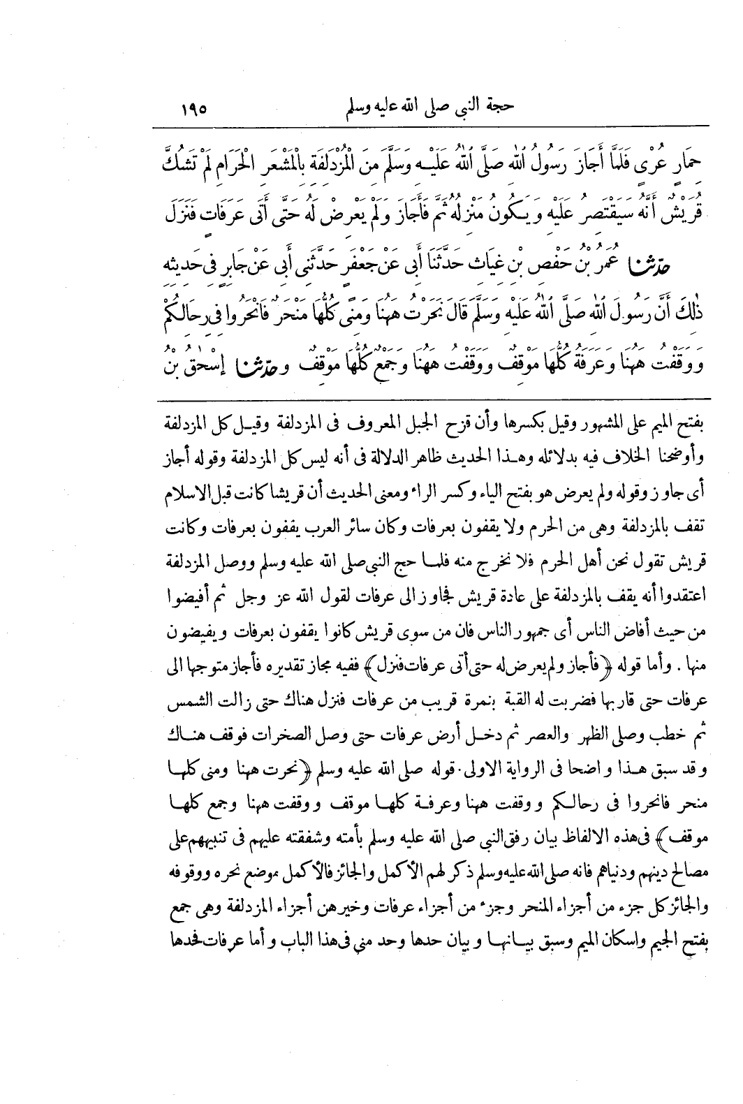 بِفَتْحِ الْمِيمِ عَلَى الْمَشْهُورِ وَقِيلَ بِكَسْرِهَا وَأَنَّ قُزَحَ الْجَبَلُ الْمَعْرُوفُ فِي الْمُزْدَلِفَةِ وَقِيلَ كُلُّ الْمُزْدَلِفَةِ وَأَوْضَحْنَا الْخِلَافَ فِيهِ بِدَلَائِلِهِ وَهَذَا الْحَدِيثُ ظَاهِرُ الدَّلَالَةِ فِي أَنَّهُ لَيْسَ كُلَّ الْمُزْدَلِفَةِ وَقَوْلُهُ أَجَازَ أَيْ جَاوَزَ وَقَوْلُهُ وَلَمْ يَعْرِضْ هُوَ بِفَتْحِ الْيَاءِ وَكَسْرِ الرَّاءِ وَمَعْنَى الْحَدِيثِ أَنَّ قُرَيْشًا كَانَتْ قَبْلَ الْإِسْلَامِ تَقِفُ بِالْمُزْدَلِفَةِ وَهِيَ مِنَ الْحَرَمِ وَلَا يَقِفُونَ بِعَرَفَاتٍ وَكَانَ سَائِرُ الْعَرَبِ يَقِفُونَ بِعَرَفَاتٍ وَكَانَتْ قُرَيْشٌ تَقُولُ نَحْنُ أَهْلُ الْحَرَمِ فَلَا نَخْرُجُ مِنْهُ فَلَمَّا حَجَّ النَّبِيُّ صَلَّى اللَّهُ عَلَيْهِ وَسَلَّمَ وَوَصَلَ الْمُزْدَلِفَةَ اعْتَقَدُوا أَنَّهُ يَقِفُ بِالْمُزْدَلِفَةِ عَلَى عَادَةِ قُرَيْشٍ فَجَاوَزَ إِلَى عَرَفَاتٍ لِقَوْلِ اللَّهِ عَزَّ وَجَلَّ ثُمَّ أَفِيضُوا مِنْ حَيْثُ أَفَاضَ النَّاسُ أَيْ جُمْهُورُ النَّاسِ فَإِنَّ مَنْ سِوَى قُرَيْشٍ كَانُوا يَقِفُونَ بِعَرَفَاتٍ وَيُفِيضُونَ مِنْهَا وَأَمَّا قَوْلُهُ (فَأَجَازَ وَلَمْ يَعْرِضْ لَهُ حَتَّى أَتَى عَرَفَاتٍ فَنَزَلَ) فَفِيهِ مَجَازٌ تَقْدِيرُهُ فَأَجَازَ مُتَوَجِّهًا إِلَى عَرَفَاتٍ حَتَّى قَارَبَهَا فَضُرِبَتْ لَهُ الْقُبَّةُ بِنَمِرَةَ قَرِيبٌ مِنْ عَرَفَاتٍ فَنَزَلَ هُنَاكَ حَتَّى زَالَتِ الشَّمْسُ ثُمَّ خَطَبَ وَصَلَّى الظُّهْرَ وَالْعَصْرَ ثُمَّ دَخَلَ أَرْضَ عَرَفَاتٍ حَتَّى وَصَلَ الصَّخَرَاتِ فَوَقَفَ هُنَاكَ وَقَدْ سَبَقَ هَذَا وَاضِحًا فِي الرِّوَايَةِ الاولى قوله صلى الله عليه وسلم (نحرت ها هنا وَمِنًى كُلُّهَا مَنْحَرٌ فَانْحَرُوا فِي رِحَالِكُمْ وَوَقَفْتُ ها هنا وعرفة كلها موقف ووقفت ها هنا وَجَمْعٌ كُلُّهَا مَوْقِفٌ) فِي هَذِهِ الْأَلْفَاظِ بَيَانُ رِفْقِ النَّبِيِّ صَلَّى اللَّهُ عَلَيْهِ وَسَلَّمَ بِأُمَّتِهِ وَشَفَقَتِهِ عَلَيْهِمْ فِي تَنْبِيهِهِمْ عَلَى مَصَالِحِ دِينِهِمْ وَدُنْيَاهُمْ فَإِنَّهُ صَلَّى اللَّهُ عَلَيْهِ وَسَلَّمَ ذَكَرَ لَهُمُ الْأَكْمَلَ وَالْجَائِزَ فَالْأَكْمَلُ مَوْضِعُ نَحْرِهِ وَوُقُوفِهِ وَالْجَائِزُ كُلُّ جُزْءٍ مِنْ أَجْزَاءِ الْمَنْحَرِ وَجُزْءٍ مِنْ أَجْزَاءِ عَرَفَاتٍ وَخَيْرُهُنَّ أَجْزَاءُ الْمُزْدَلِفَةِ وَهِيَ جَمْعٌ بِفَتْحِ الْجِيمِ وَإِسْكَانِ الْمِيمِ وَسَبَقَ بَيَانُهَا وَبَيَانُ حَدِّهَا وَحَدِّ مِنًى فِي هَذَا الْبَابِ وَأَمَّا عَرَفَاتٌ فَحَدُّهَا