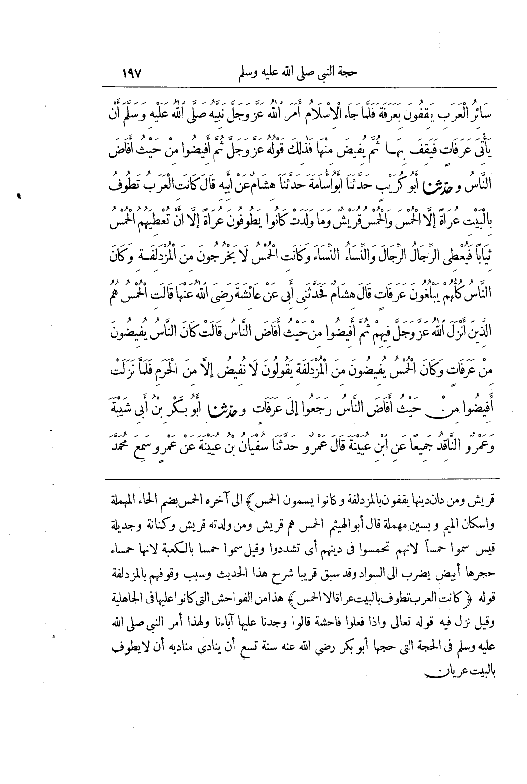 قُرَيْشٌ وَمَنْ دَانَ دِينَهَا يَقِفُونَ بِالْمُزْدَلِفَةِ وَكَانُوا يُسَمَّوْنَ الْحُمْسَ) إِلَى آخِرِهِ الْحُمْسُ بِضَمِّ الْحَاءِ الْمُهْمَلَةِ وَإِسْكَانِ الْمِيمِ وَبِسِينٍ مُهْمَلَةٍ قَالَ أَبُو الْهَيْثَمِ الْحُمْسَ هُمْ قُرَيْشٌ وَمَنْ وَلَدَتْهُ قُرَيْشٌ وَكِنَانَةُ وَجَدِيلَةُ قَيْسٍ سُمُّوا حُمْسًا لِأَنَّهُمْ تَحَمَّسُوا فِي دِينِهِمْ أَيْ تَشَدَّدُوا وَقِيلَ سُمُّوا حُمْسًا بِالْكَعْبَةِ لِأَنَّهَا حَمْسَاءُ حَجَرُهَا أَبْيَضُ يَضْرِبُ إِلَى السَّوَادِ وَقَدْ سَبَقَ قَرِيبًا شَرْحُ هَذَا الْحَدِيثِ وَسَبَبِ وُقُوفِهِمْ بِالْمُزْدَلِفَةِ قَوْلُهُ (كَانَتِ الْعَرَبُ تَطُوفُ بِالْبَيْتِ عُرَاةً إِلَّا الْحُمْسَ) هَذَا مِنَ الْفَوَاحِشِ الَّتِي كَانُوا عَلَيْهَا فِي الْجَاهِلِيَّةِ وَقِيلَ نَزَلَ فِيهِ قَوْلُهُ تَعَالَى وَإِذَا فَعَلُوا فَاحِشَةً قَالُوا وجدنا عليها آباءنا وَلِهَذَا أَمَرَ النَّبِيُّ صَلَّى اللَّهُ عَلَيْهِ وَسَلَّمَ فِي الْحَجَّةِ الَّتِي حَجَّهَا أَبُو بَكْرٍ رَضِيَ اللَّهُ عَنْهُ سَنَةَ تِسْعٍ أَنْ يُنَادِيَ مُنَادِيهِ أَنْ لَا يَطُوفَ بِالْبَيْتِ عُرْيَانٌ