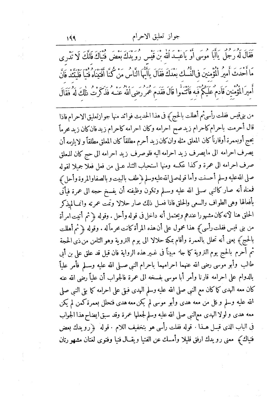 مِنْ بَنِي قَيْسٍ فَفَلَتْ رَأْسِي ثُمَّ أَهْلَلْتُ بِالْحَجِّ) فِي هَذَا الْحَدِيثِ فَوَائِدُ مِنْهَا جَوَازُ تَعْلِيقِ الْإِحْرَامِ فَإِذَا قَالَ أَحْرَمْتُ بِإِحْرَامٍ كَإِحْرَامِ زَيْدٍ صَحَّ إِحْرَامُهُ وَكَانَ إِحْرَامُهُ كَإِحْرَامِ زَيْدٍ فَإِنْ كَانَ زَيْدٌ مُحْرِمًا بِحَجٍّ أَوْ بِعُمْرَةٍ أَوْ قَارِنًا كَانَ الْمُعَلِّقُ مِثْلَهُ وَإِنْ كَانَ زَيْدٌ أَحْرَمَ مُطْلَقًا كَانَ الْمُعَلِّقُ مُطْلَقًا وَلَا يَلْزَمُهُ أَنْ يَصْرِفَ إِحْرَامَهُ إِلَى مَا يَصْرِفُ زَيْدٌ إِحْرَامَهُ إِلَيْهِ فَلَوْ صَرَفَ زَيْدٌ إِحْرَامَهُ إِلَى حَجٍّ كَانَ لِلْمُعَلِّقِ صَرْفُ إِحْرَامِهِ إِلَى عُمْرَةٍ وَكَذَا عَكْسُهُ وَمِنْهَا اسْتِحْبَابُ الثَّنَاءِ عَلَى من فعل فعلا جَمِيلًا لِقَوْلِهِ صَلَّى اللَّهُ عَلَيْهِ وَسَلَّمَ أَحْسَنْتَ وَأَمَّا قَوْلُهُ صَلَّى اللَّهُ عَلَيْهِ وَسَلَّمَ (طُفْ بِالْبَيْتِ وَبِالصَّفَا وَالْمَرْوَةِ وَأَحِلَّ) فَمَعْنَاهُ أَنَّهُ صَارَ كَالنَّبِيِّ صَلَّى اللَّهُ عَلَيْهِ وَسَلَّمَ وَتَكُونُ وَظِيفَتُهُ أَنْ يَفْسَخَ حَجَّهُ إِلَى عُمْرَةٍ فَيَأْتِي بِأَفْعَالِهَا وَهِيَ الطَّوَافُ وَالسَّعْيُ وَالْحَلْقُ فَإِذَا فَعَلَ ذَلِكَ صَارَ حَلَالًا وَتَمَّتْ عُمْرَتُهُ وَإِنَّمَا لَمْ يَذْكُرِ الْحَلْقَ هُنَا لِأَنَّهُ كَانَ مَشْهُورًا عِنْدَهُمْ وَيُحْتَمَلُ أَنَّهُ دَاخِلٌ فِي قَوْلِهِ وَأَحِلِّ وَقَوْلُهُ (ثُمَّ أَتَيْتُ امْرَأَةً مِنْ بَنِي قَيْسٍ فَفَلَتْ رَأْسِي) هَذَا مَحْمُولٌ عَلَى أَنَّ هَذِهِ الْمَرْأَةَ كَانَتْ مَحْرَمًا لَهُ وَقَوْلُهُ (ثُمَّ أَهْلَلْتُ بِالْحَجِّ) يَعْنِي أَنَّهُ تَحَلَّلَ بِالْعُمْرَةِ وَأَقَامَ بِمَكَّةَ حَلَالًا إِلَى يوم التروية وهو الثامن من ذي الحجة ثُمَّ أَحْرَمَ بِالْحَجِّ يَوْمَ التَّرْوِيَةِ كَمَا جَاءَ مُبَيَّنًا فِي غَيْرِ هَذِهِ الرِّوَايَةِ فَإِنْ قِيلَ قَدْ عَلَّقَ عَلِيُّ بْنُ أَبِي طَالِبٍ وَأَبُو مُوسَى رَضِيَ اللَّهُ عَنْهُمَا إِحْرَامَهُمَا بِإِحْرَامِ النَّبِيِّ صَلَّى اللَّهُ عَلَيْهِ وَسَلَّمَ فَأَمَرَ عَلِيًّا بِالدَّوَامِ عَلَى إِحْرَامِهِ قَارِنًا وَأَمَرَ أَبَا مُوسَى بِفَسْخِهِ إِلَى عُمْرَةٍ فَالْجَوَابُ أَنَّ عَلِيًّا رَضِيَ اللَّهُ عَنْهُ كَانَ مَعَهُ الْهَدْيُ كَمَا كَانَ مَعَ النَّبِيِّ صَلَّى اللَّهُ عَلَيْهِ وَسَلَّمَ الْهَدْيُ فَبَقِيَ عَلَى إِحْرَامِهِ كَمَا بَقِيَ النَّبِيُّ صَلَّى اللَّهُ عَلَيْهِ وَسَلَّمَ وَكُلُّ مَنْ مَعَهُ هَدْيٌ وَأَبُو مُوسَى لَمْ يَكُنْ مَعَهُ هَدْيٌ فَتَحَلَّلَ بِعُمْرَةٍ كَمَنْ لَمْ يَكُنْ مَعَهُ هَدْيٌ وَلَوْلَا الْهَدْيُ مَعَ النَّبِيِّ صَلَّى اللَّهُ عَلَيْهِ وَسَلَّمَ لَجَعَلَهَا عُمْرَةً وَقَدْ سَبَقَ إِيضَاحُ هَذَا الْجَوَابِ فِي الْبَابِ الَّذِي قَبْلَ هَذَا قَوْلُهُ فَفَلَتْ رَأْسِي هو بتخفف اللَّامِ قَوْلُهُ (رُوَيْدَكَ بَعْضَ فُتْيَاكَ) مَعْنَى رُوَيْدَكَ ارْفُقْ قَلِيلًا وَأَمْسِكْ عَنِ الْفُتْيَا وَيُقَالُ فُتْيَا وَفَتْوَى لُغَتَانِ مَشْهُورَتَانِ