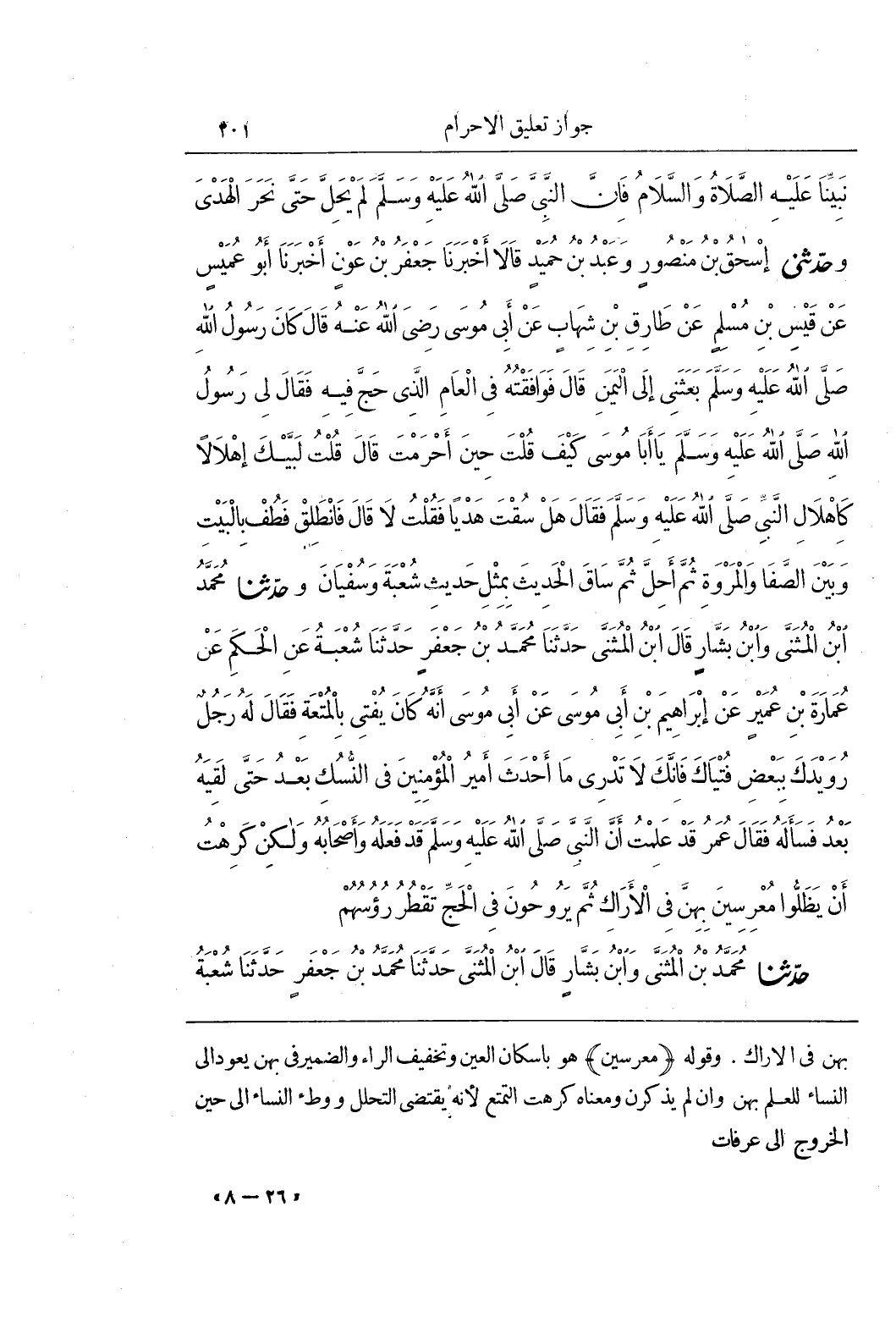 [1222] وَقَوْلُهُ (مُعْرِسِينَ) هُوَ بِإِسْكَانِ الْعَيْنِ وَتَخْفِيفِ الرَّاءِ وَالضَّمِيرُ فِي بِهِنَّ يَعُودُ إِلَى النِّسَاءِ لِلْعِلْمِ بِهِنَّ وَإِنْ لَمْ يُذْكَرْنَ وَمَعْنَاهُ كَرِهْتُ التَّمَتُّعَ لِأَنَّهُ يَقْتَضِي التَّحَلُّلَ وَوَطْءَ النِّسَاءِ إِلَى حِينِ الْخُرُوجِ إِلَى عَرَفَاتٍ